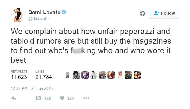 Is it our fault though? Has society fed into it or is this just easy business with everyone from blogs to magazines trying to cash in?— Demi Lovato (@ddlovato) June 23, 2016