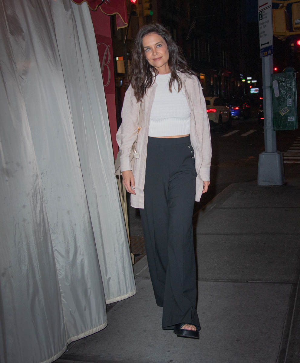 Jessica Simpson’s outfit is a throwback to a kind of 2005 boho aesthetic that she’s never given up. She has stayed consistent and this kind of look – the big bag, chunky heel, oversize sunglasses, embroidered top – is making a comeback, as most things in fashion do. Will handkerchief tops ever see the light of day again? (Embed is here)