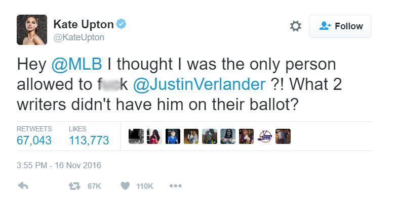 I don’t know much about Kate Upton except for the indisputable fact that she gets the worst Met Gala dresses. In September, she criticized NFL players for taking a knee during the US national anthem – an act of protest against systemic racial injustice. She felt it was disrespectful, particularly on 9/11. She said “protest all you want,” except, I guess, except when she thinks you shouldn’t.. Last night, she went on a Twitter tear because her boyfriend, Justin didn’t win the Cy Young Award. Some would say it was a social media protest. Some things are really worth fighting for.