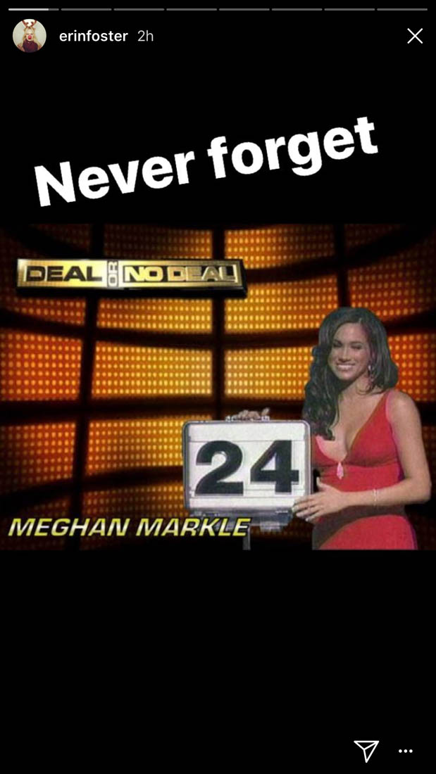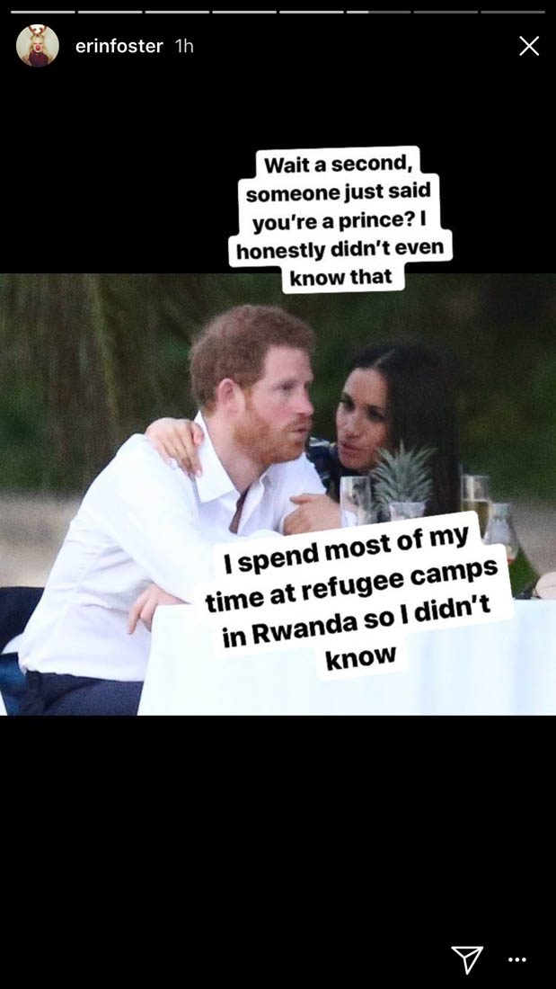 Yesterday, Erin Foster went IN on Meghan Markle in her Insta-stories (I’ve attached them below). Here’s the thing about the Foster sisters: they are snarky and elitist and privileged, and they are also funny as f-ck. They tend to hate on women who are “try hards” (I’ve seen her sister Sara comment on famewhores, too) and certain kinds of celebrity behaviour because the Fosters only abide a particular kind of famous (like their BFFs Kate Hudson, Nicole Richie and Jennifer Meyer). Erin continued to spend the day arguing with people in her comments who were calling her mean-spirited and tone deaf. Is the Insta-story funny? Yes, in an “oh my god” kind of way. It almost seems personal, as if they knew one another (I have no idea if they’ve ever crossed paths). But as Keke Palmer would say, the gag is that the Foster sisters have had every advantage (in life and in Hollywood) and still aren’t household names, and Meghan Markle carried her Deal or No Deal briefcase into Buckingham Palace.