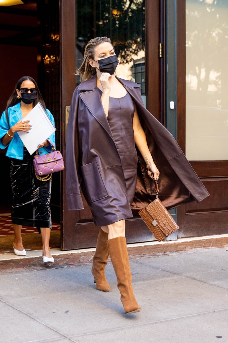 As Lainey mentioned this week, Kate Hudson is now in New York for Fashion Week (as well as promoting her new Apple TV show, Truth Be Told). Over the last week or so we’ve seen her in a Valentino gown, then a cut-out dress, then a suit, and now this plaid check dress with Peter Pan collar and black bow. It’s very prim but because the styling is fresh, it doesn’t feel stuffy. I love the switch-up, how one day she’s in a suit and the next she’s in a bikini dress and the next she’s in this dress. She’s having fun with her looks and it shows.