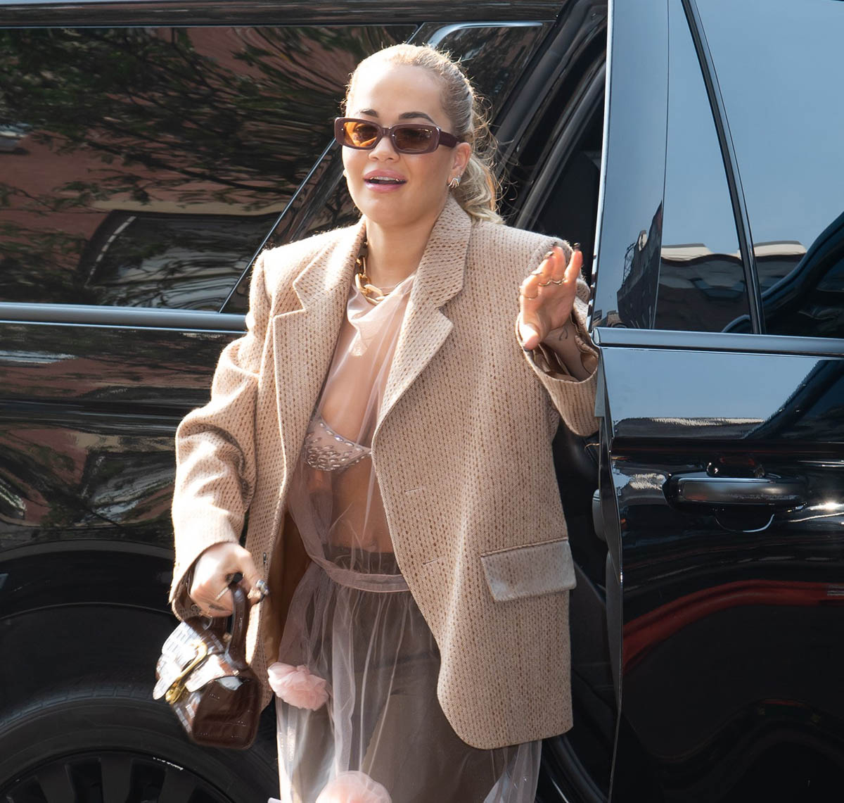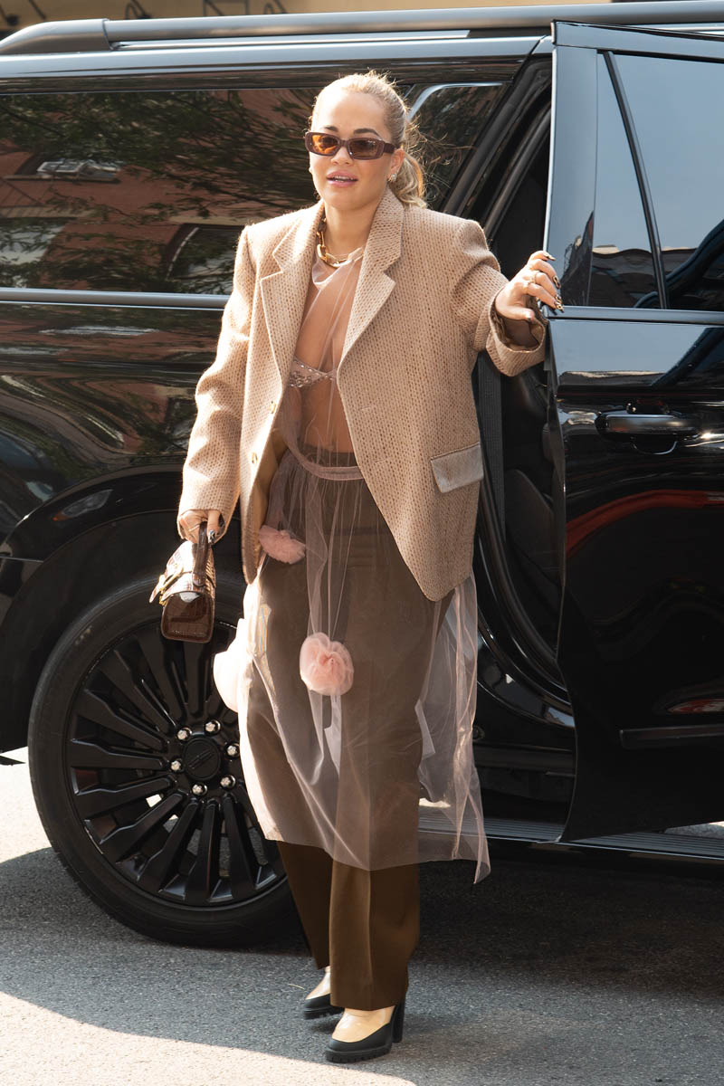 Remember dresses-over-pants? It might be a cringe fashion memory for some people but I think it’s coming back. (Exhibit A: Kristen Stewart in Chanel at the Spencer premiere.) Rita Ora is not in a dress here but some kind of sheer overlay and honestly? I’m into it, particularly the mix of sheer top and wide leg pants. It’s a bit confusing and very planned (this is not an outfit you throw together at the last minute) and I can appreciate the effort for a street style look.