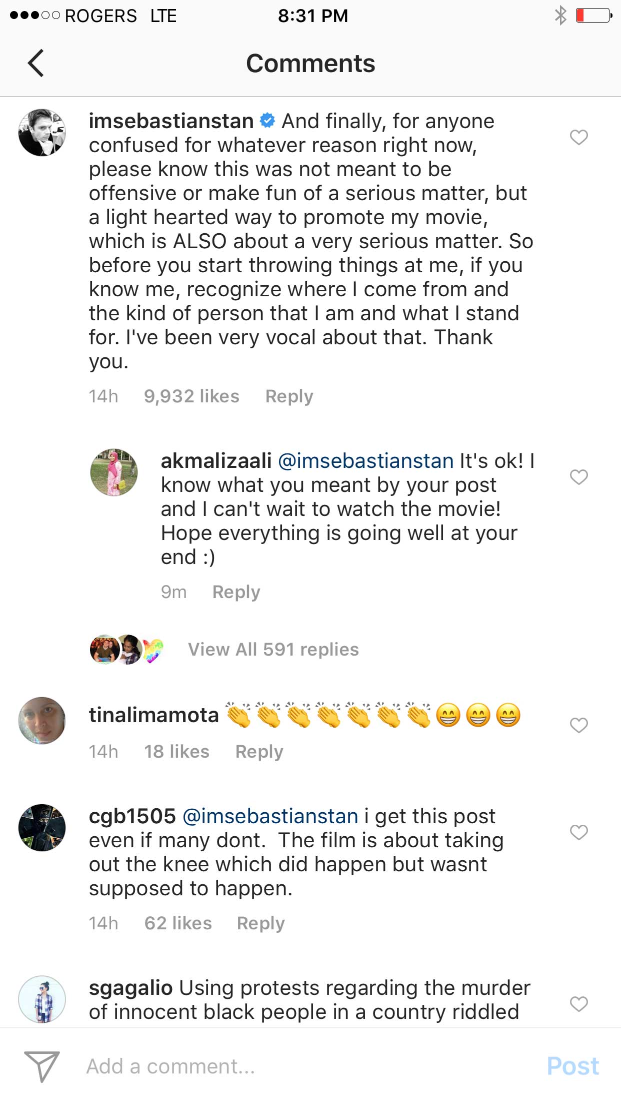 Bucky with the bad hair (aka Sebastian Stan) posted a meme, then he posted a justification of the joke not being meant to minimize current events. I had a feeling he would delete so I screenshot it. Take a look. Does this make you like Sebastian Stan more or less?