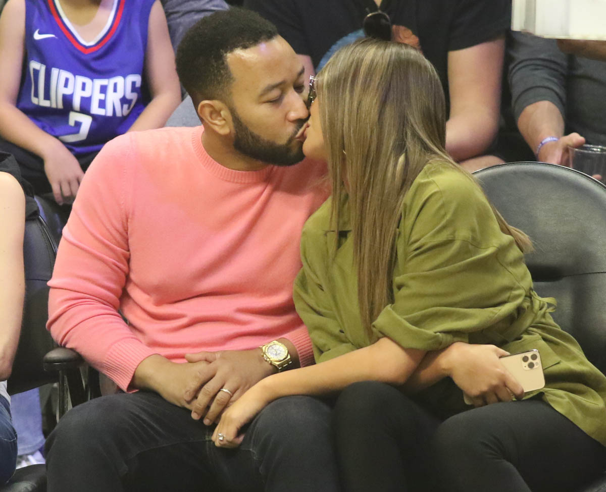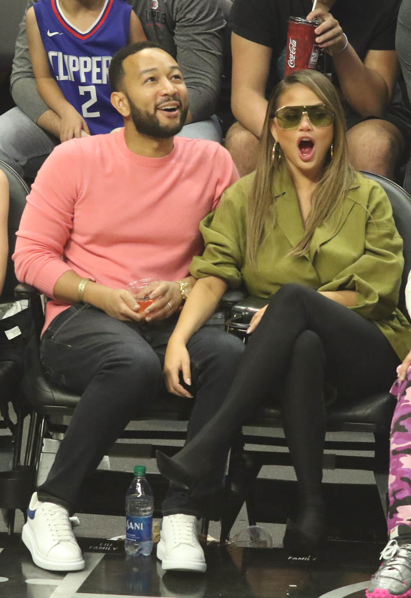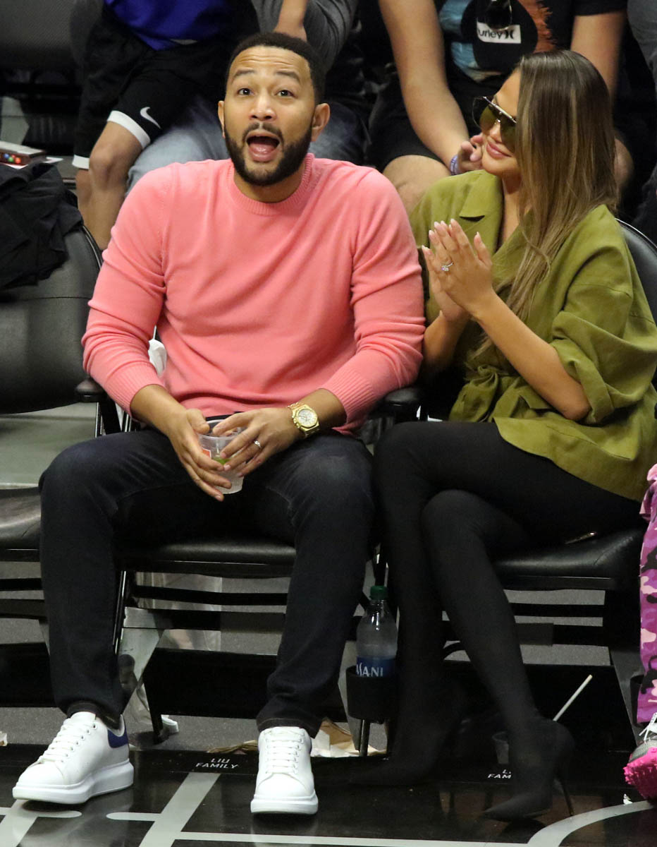 Attached - Chrissy Teigen and John Legend at a basketball game in LA earlier in March.