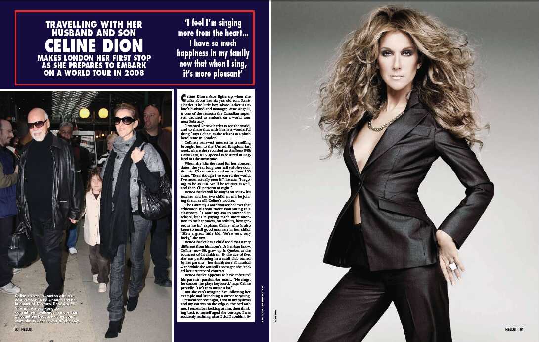 New issue of Hello Canada on newsstands tomorrow with an exclusive interview with French Canadian Cheese Celine Dion on leaving Vegas behind and going on the road with her beloved Rene and her precious Rene Charles. Every other word is “beautiful” and “happiness” and “singing” and “hearts”. Pure classic Celine.