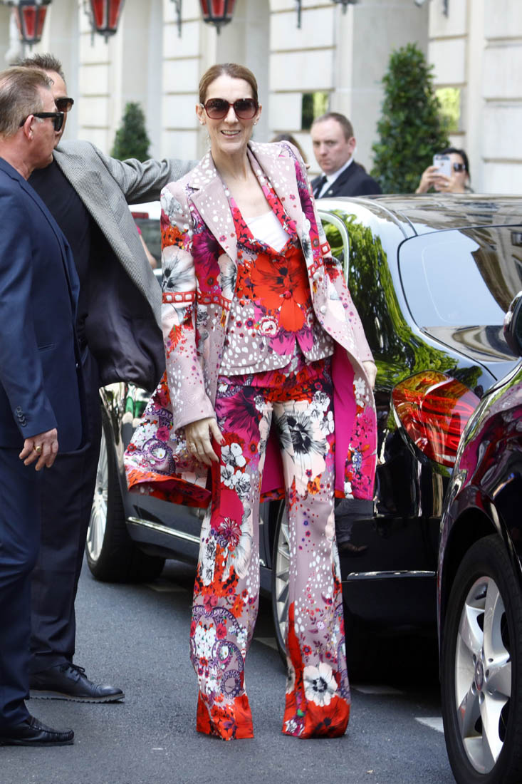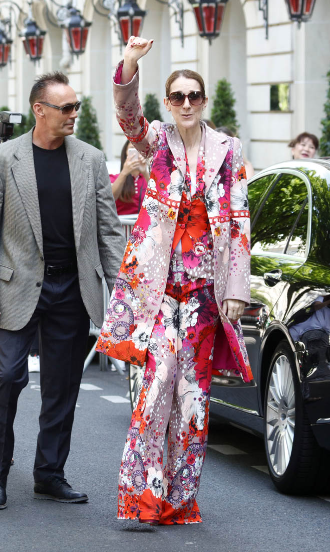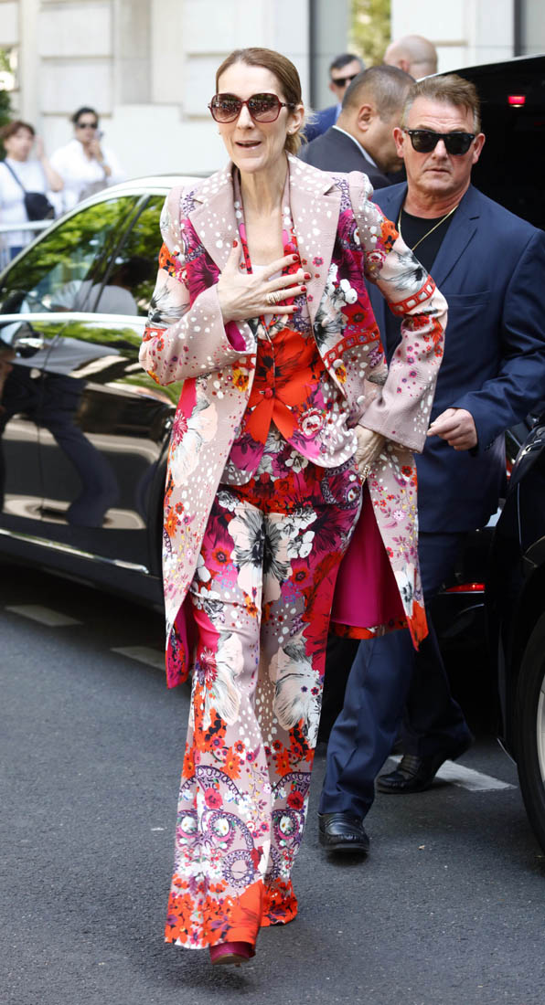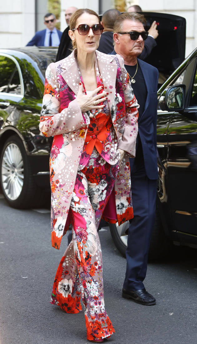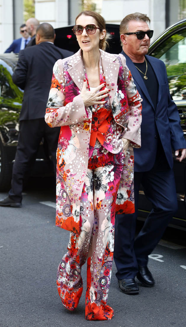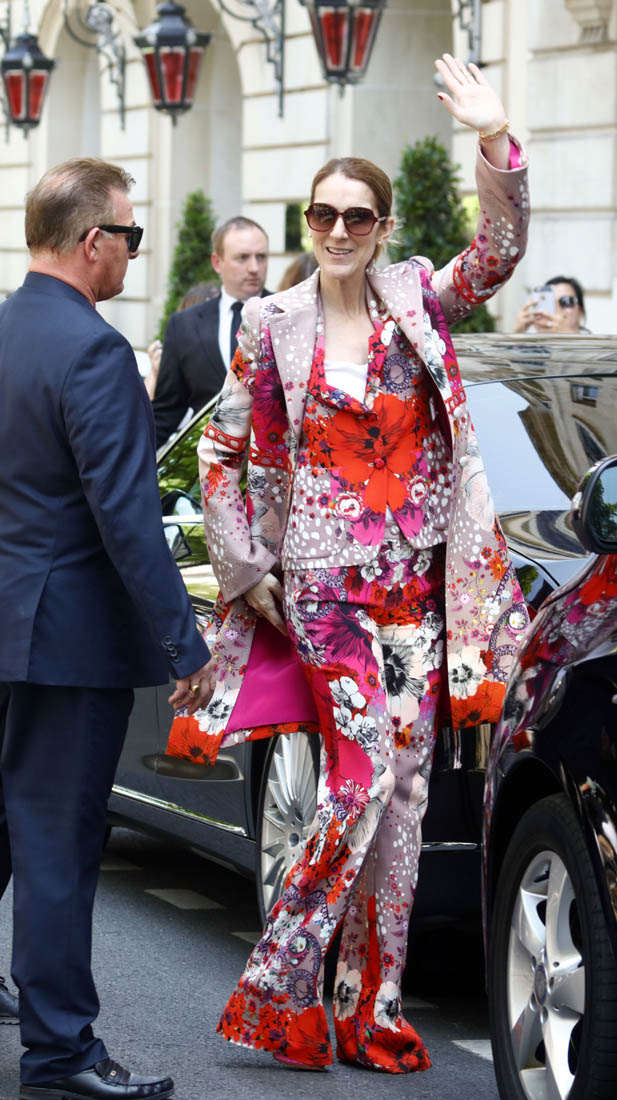 Celine is back in Paris now. She kicks off her European tour tomorrow in Copenhagen. Before that, though, a trip to the fashion capital first, naturally. And, naturally, she brought the fashion porn. Yesterday it was a dramatic all-black floor-length tuxedo jacket over a turtleneck to go to the ballet and I am sick, so sick with desire for this outfit I would have thrown myself at her if I was there to see it in person. Today she stepped out in head to toe florals, waving to her public, reliably and always on performance mode. Why is it that we can stand it from some and not at all from others? Probably because, with Celine, we’ve rarely seen someone so committed. She’s never NOT been this way. I don’t think Celine could be “aloof” if she tried. And trying is not her problem. It’s just not in her to not be totally, overwhelmingly in her feelings at all times, even when feelings aren’t really necessary.