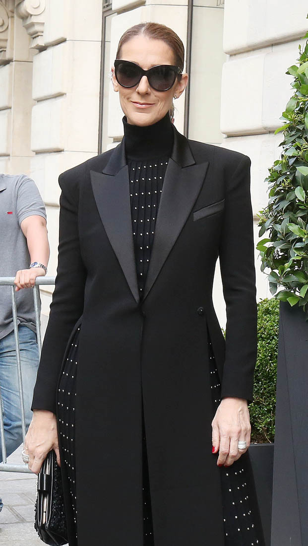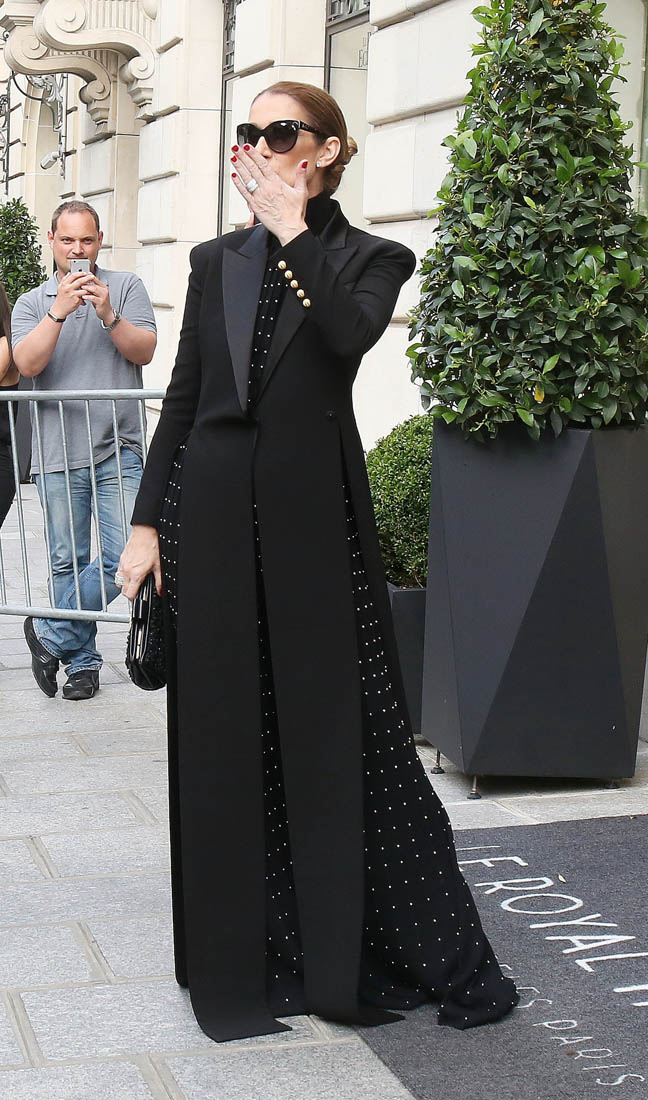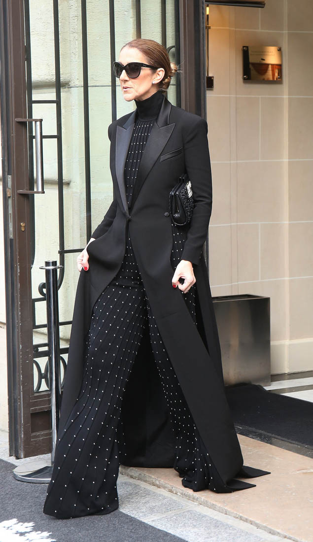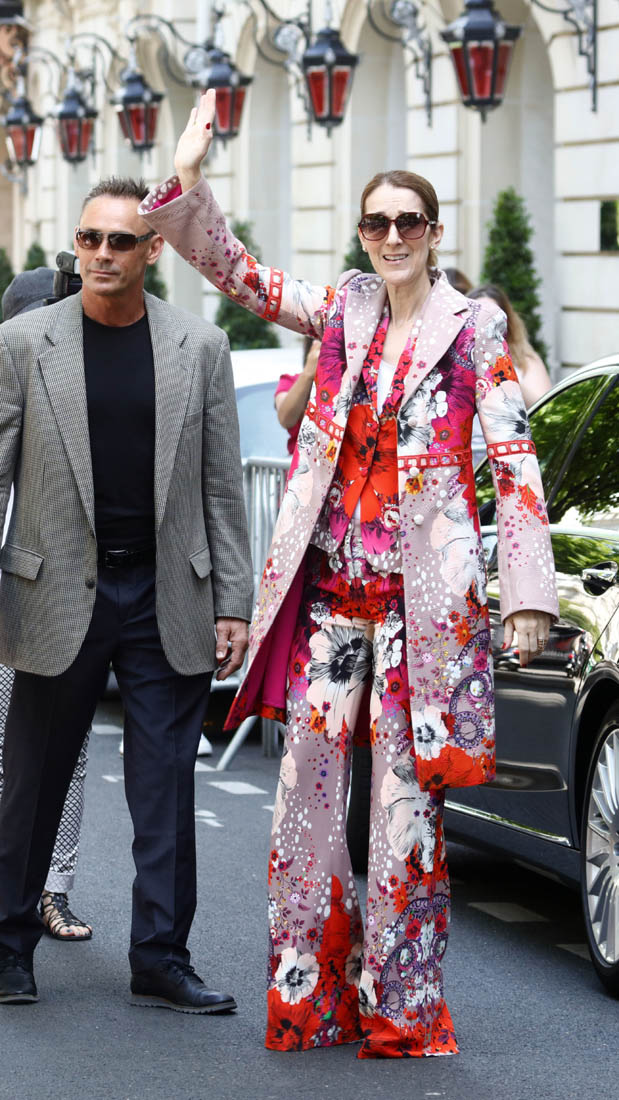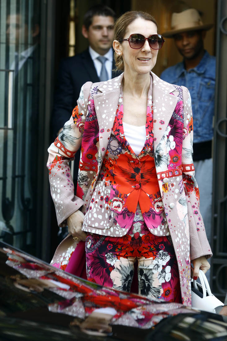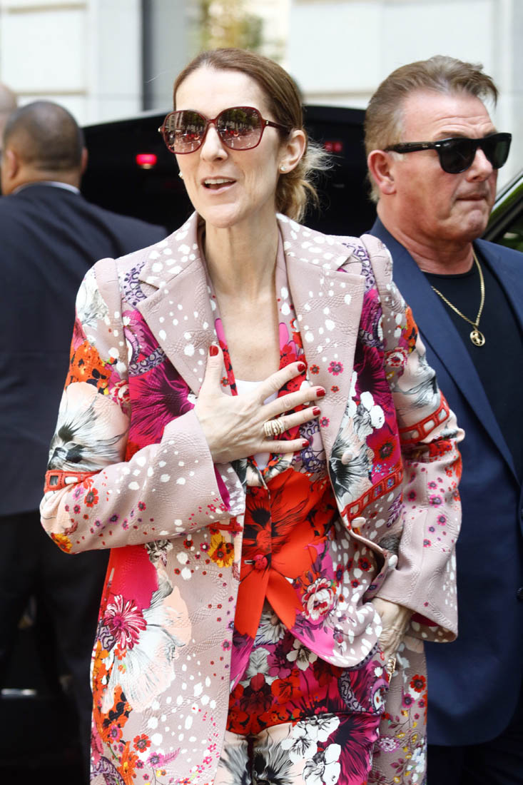 Celine is back in Paris now. She kicks off her European tour tomorrow in Copenhagen. Before that, though, a trip to the fashion capital first, naturally. And, naturally, she brought the fashion porn. Yesterday it was a dramatic all-black floor-length tuxedo jacket over a turtleneck to go to the ballet and I am sick, so sick with desire for this outfit I would have thrown myself at her if I was there to see it in person. Today she stepped out in head to toe florals, waving to her public, reliably and always on performance mode. Why is it that we can stand it from some and not at all from others? Probably because, with Celine, we’ve rarely seen someone so committed. She’s never NOT been this way. I don’t think Celine could be “aloof” if she tried. And trying is not her problem. It’s just not in her to not be totally, overwhelmingly in her feelings at all times, even when feelings aren’t really necessary.