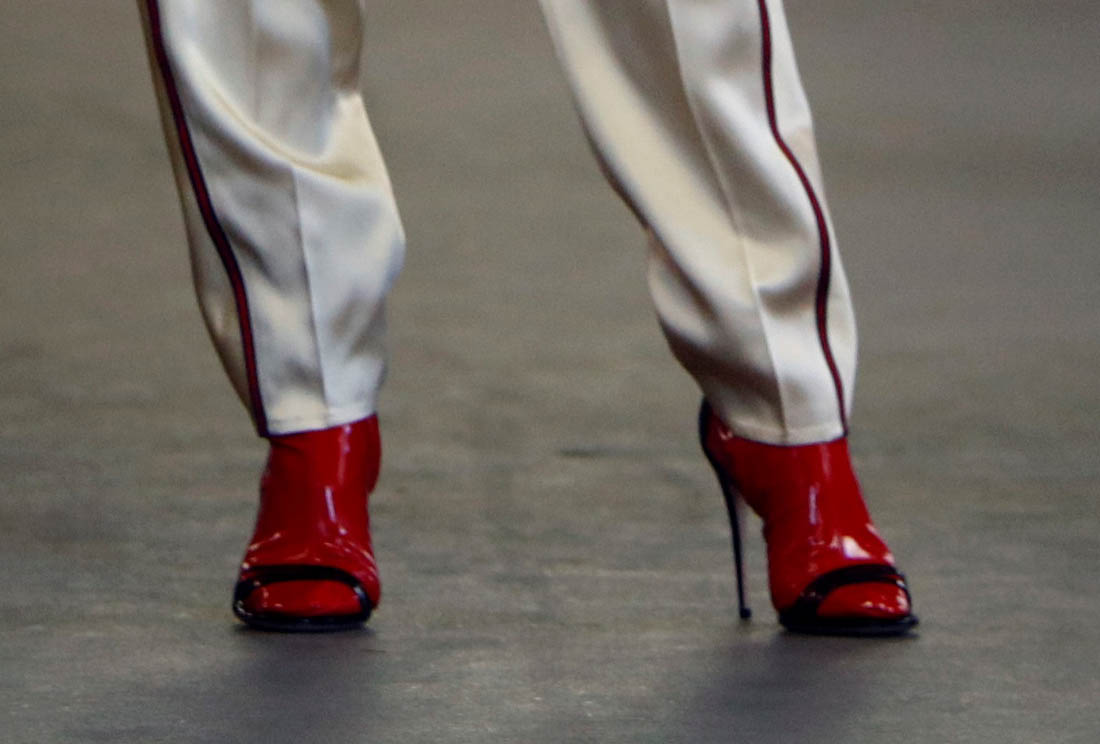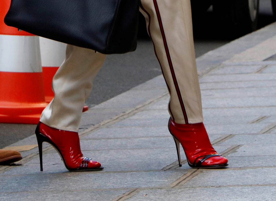 So here she is, yesterday, in a pyjama suit, posing, like, anywhere, even a pedestrian underpass. That works. There’s a certain grungy juxtaposition here, right? Especially since her clothes are probably worth the construction of that walkway? Is it red socks she’s wearing though? Under those strappy shoes? I hope so. Because I love the idea. This is how you make your summer heels last all year.