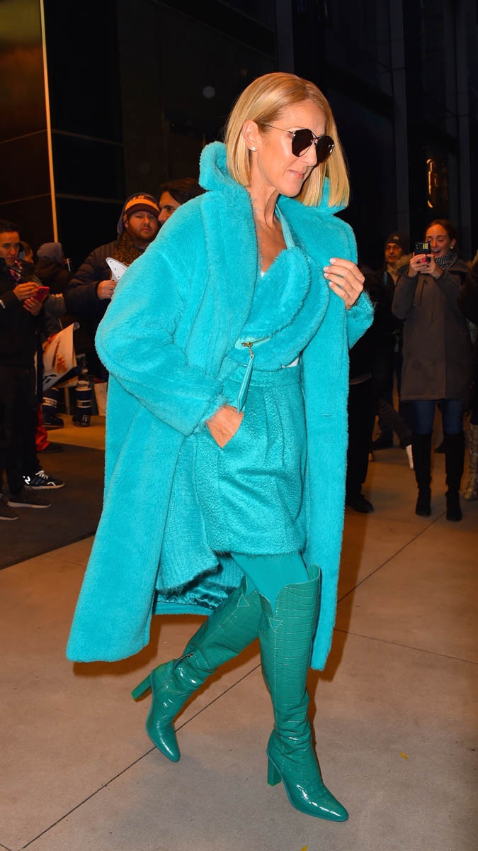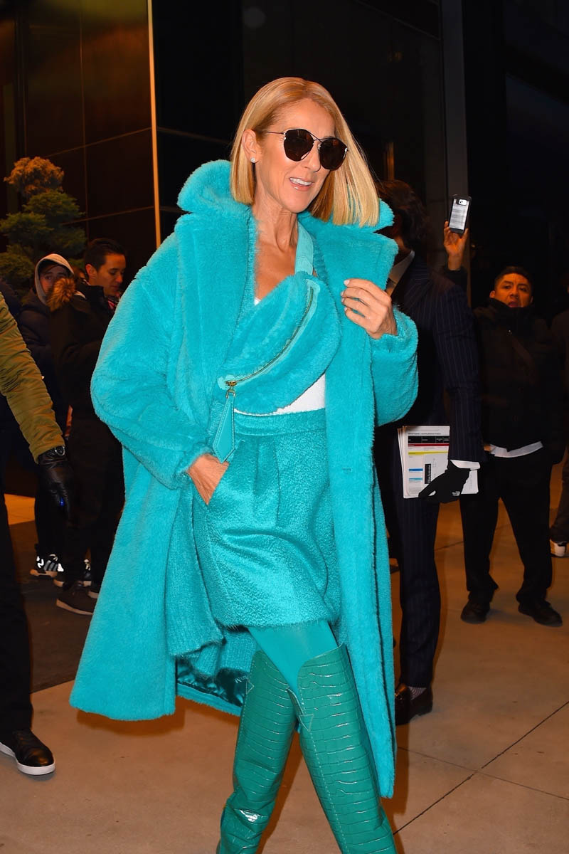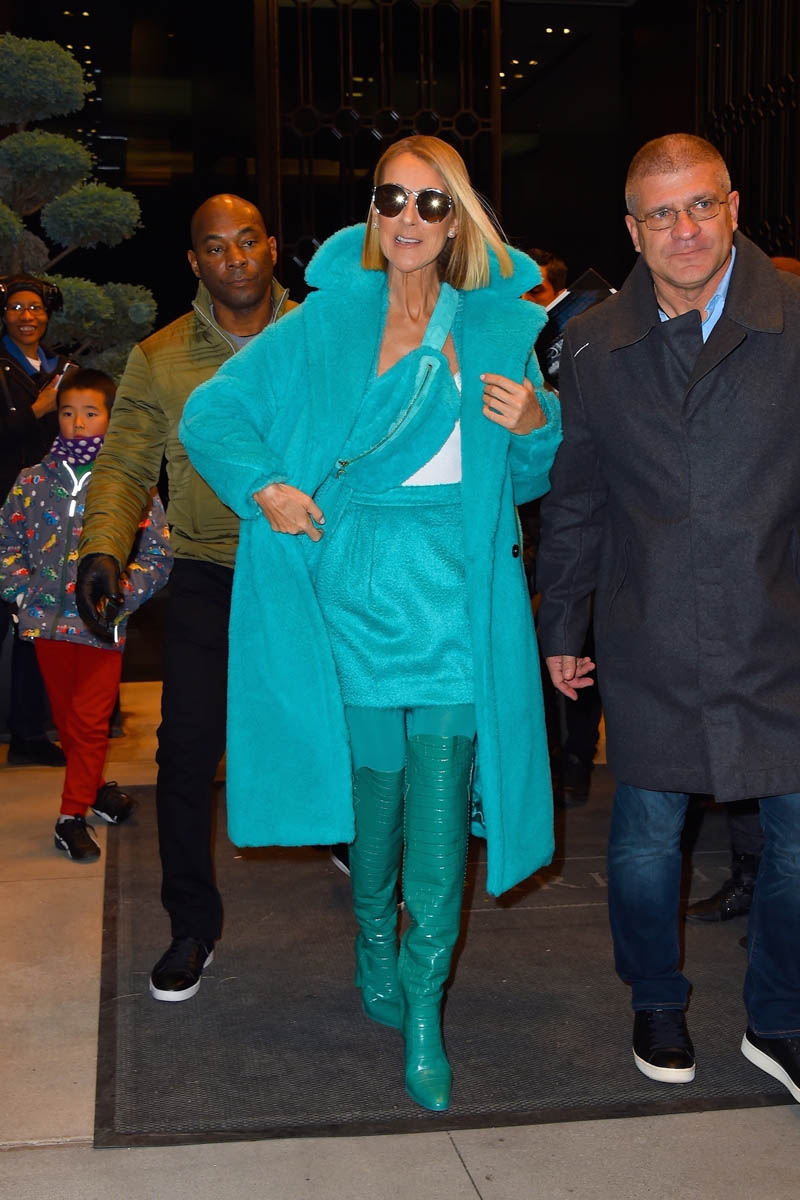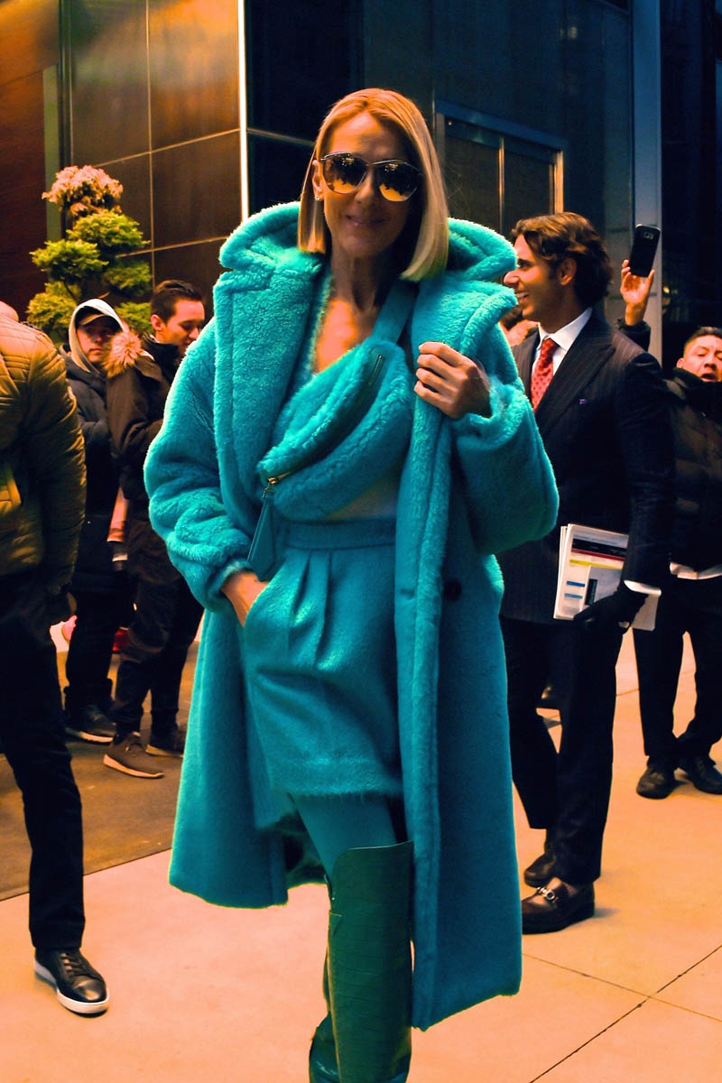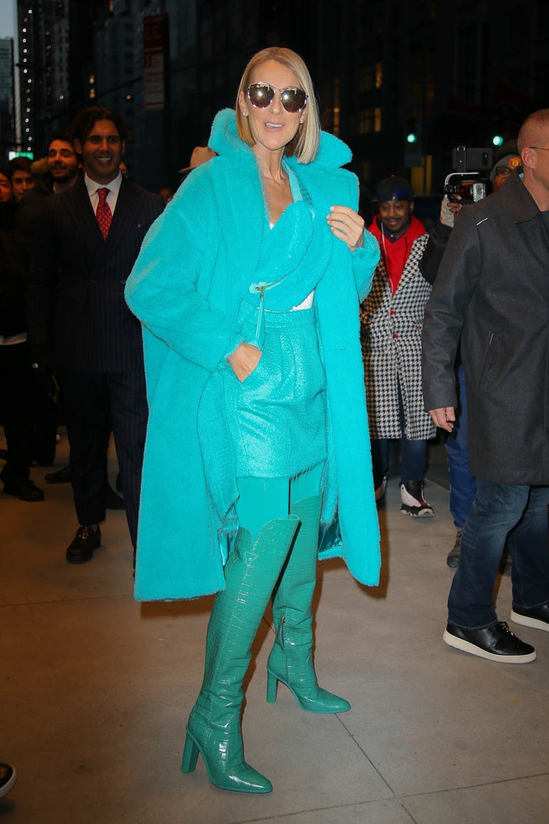 For the last couple of months, Celine has been on tour across North America. She’s currently on a brief timeout to promote the album and was seen in New York yesterday, dripping in turquoise. This, of course, is the Outfit of the Week. I couldn’t wait until tomorrow. How could I wait another day to talk about this amazingness?