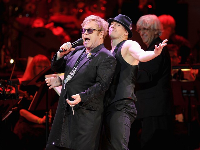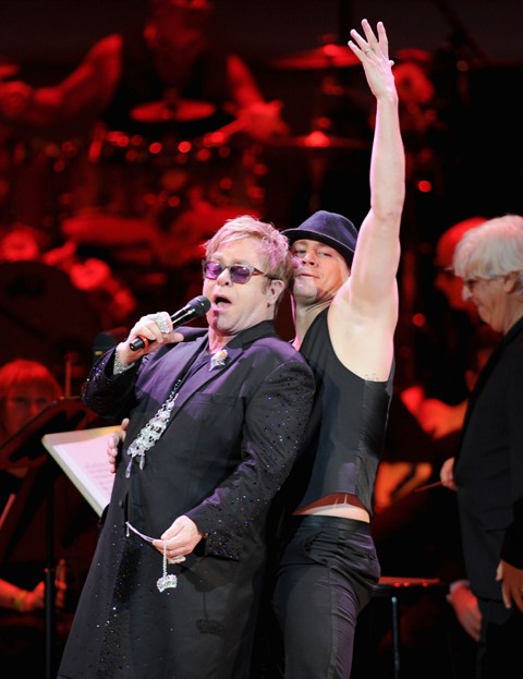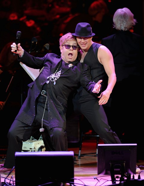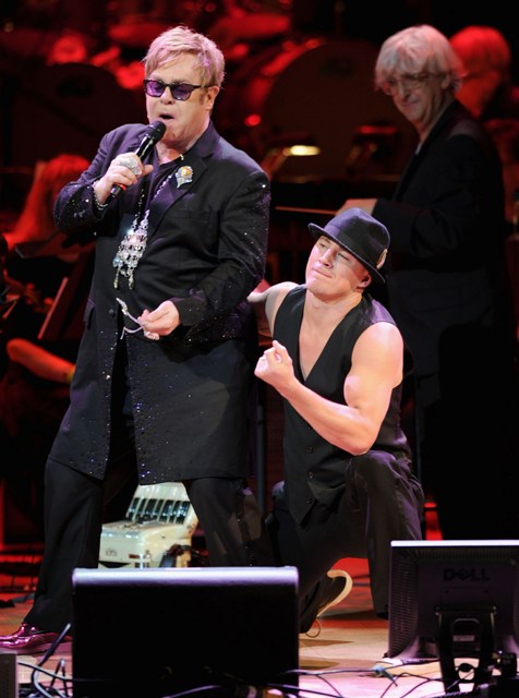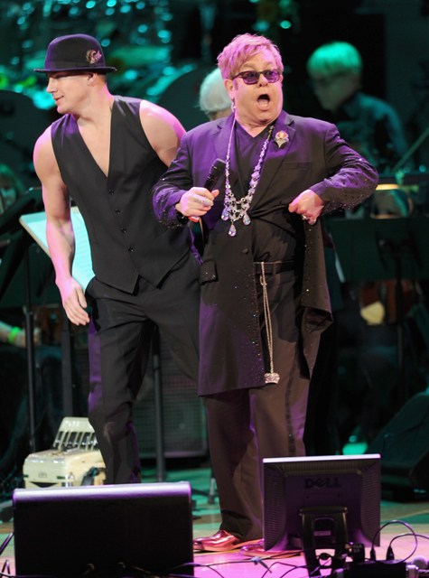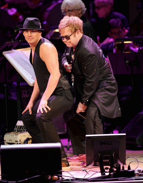 Here you are, such a gamer, last night at the Rainforest Fund Revlon concert in New York, grinding up on Elton John on stage, not taking yourself so seriously (unlike Justin Timberlake), endearing yourself to your gay fans and then your lady fans, dropping some old school Step Up moves while romance-dancing your wife Jenna Dewan. All while wearing your fedora and a waistcoat, showing off your big arms.
