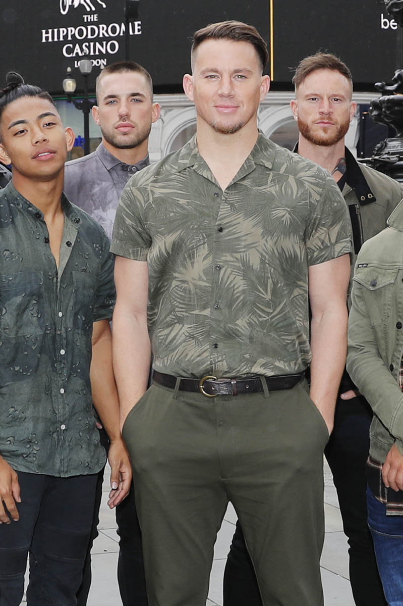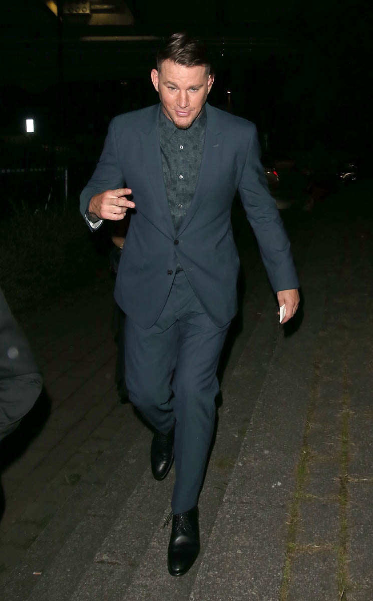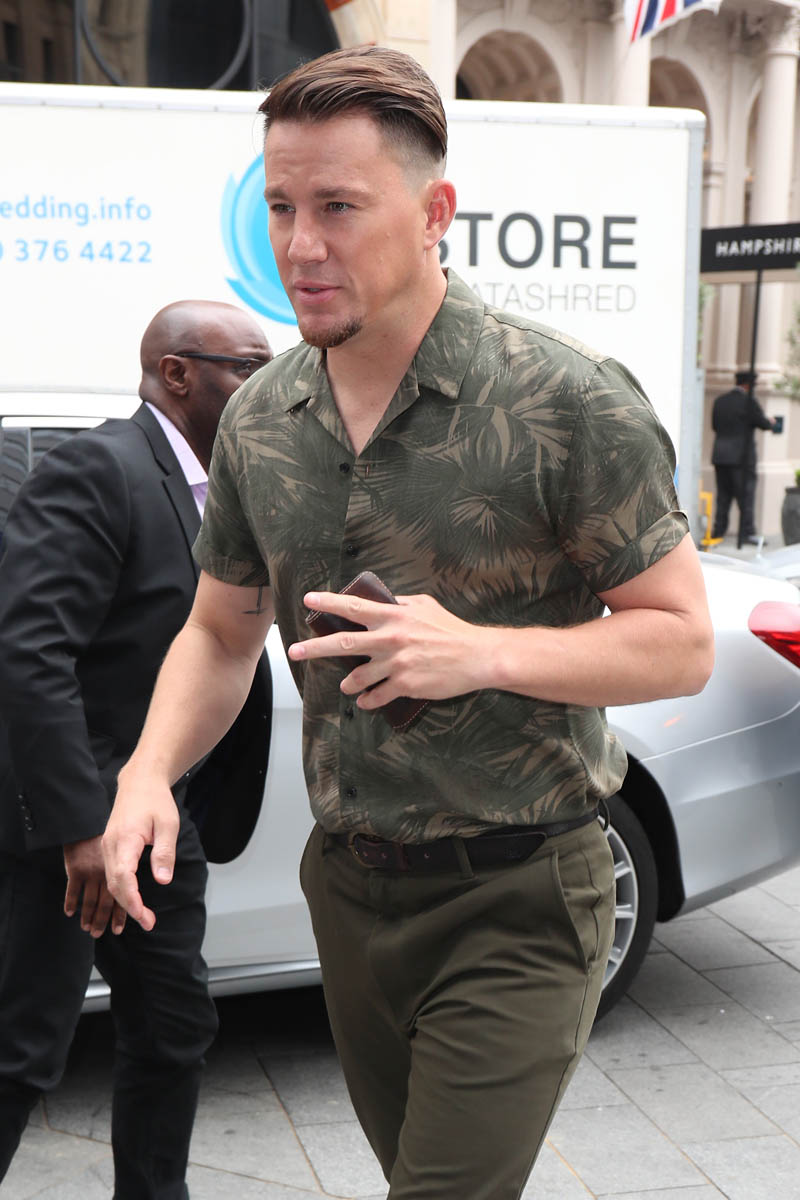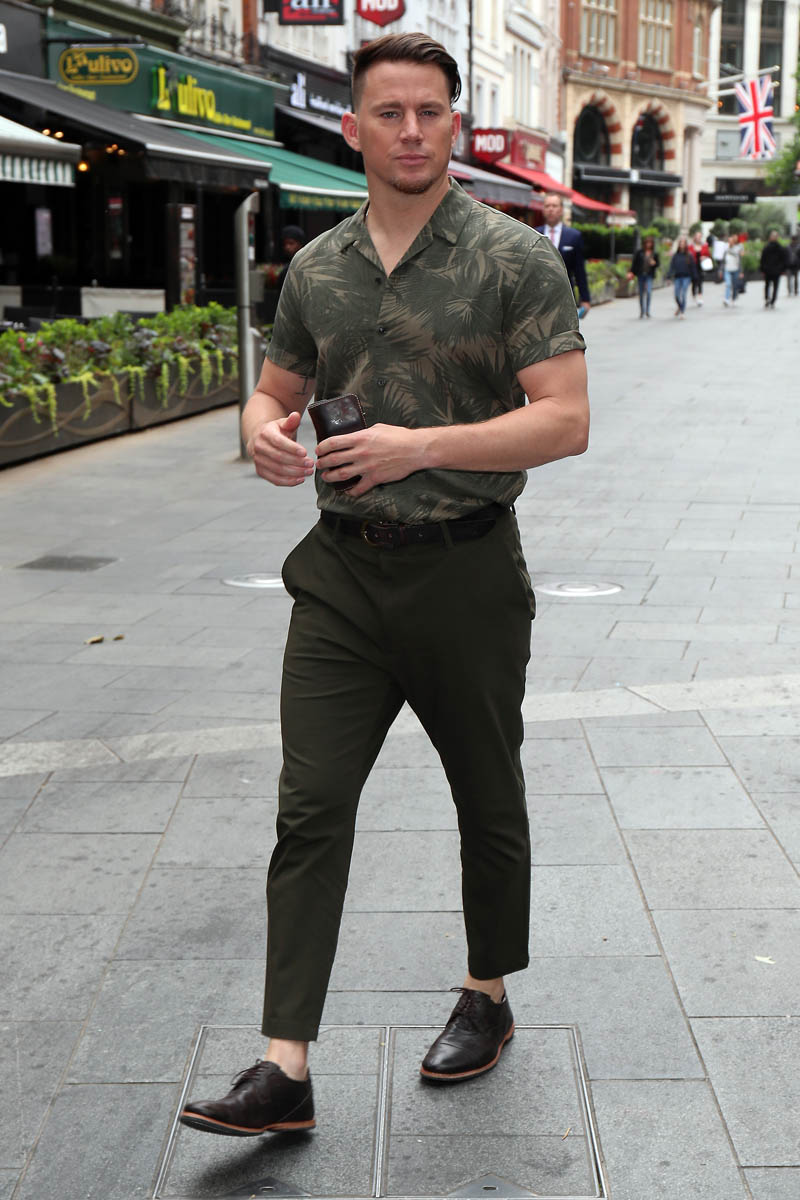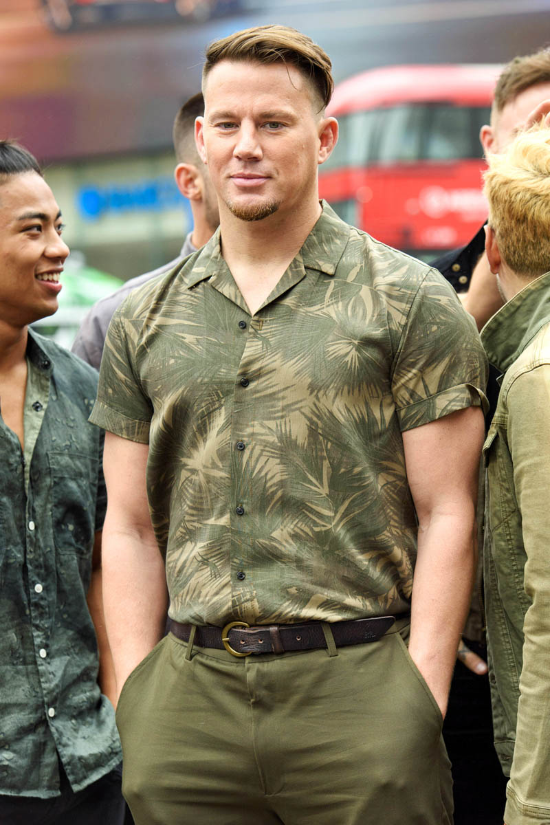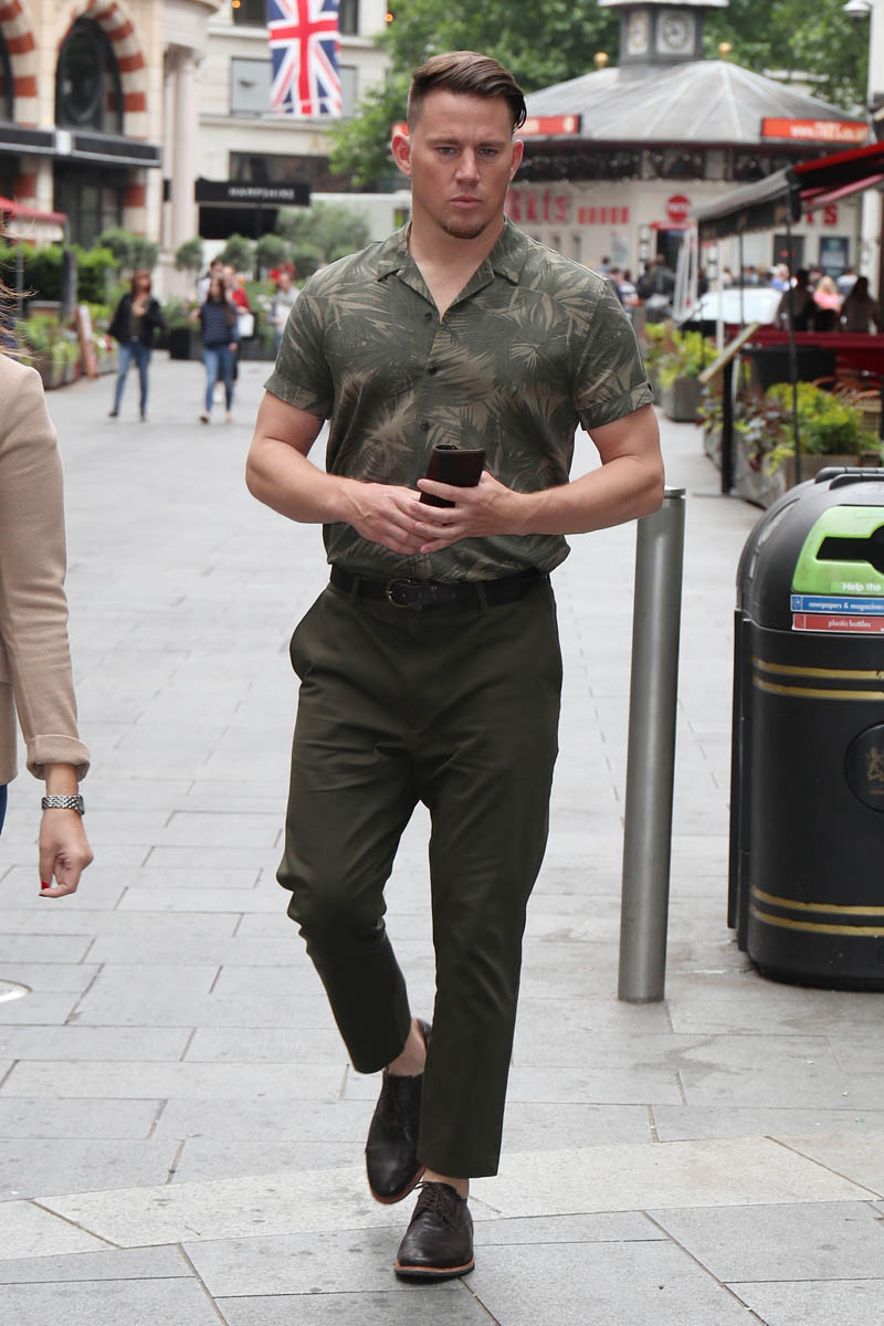 When I looked at these shots of Channing this morning, and these other shots I’ve attached of him today, outside the theatre promoting the show, in a green short sleeve printed top with green pants and black Timberlands, my first thought was…does he look really good? Is this a “post breakup makeover”? I want it to be. People talk a lot about the “post breakup makeover” but it’s almost always about women. It’s not just women. Men too. Allllll the time. Not that Chan needed a makeover, although there have been times when he hasn’t seemed all that fresh. The freshness though is here – clothes fit really well, crisp haircut, no bloat on the face. Am I imagining it or do you see it too?