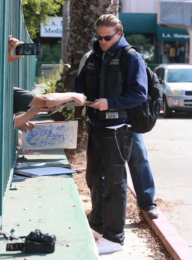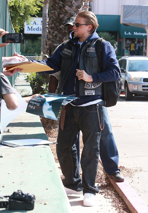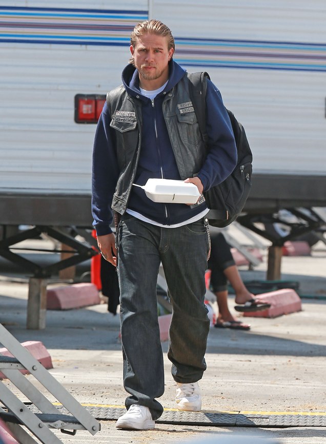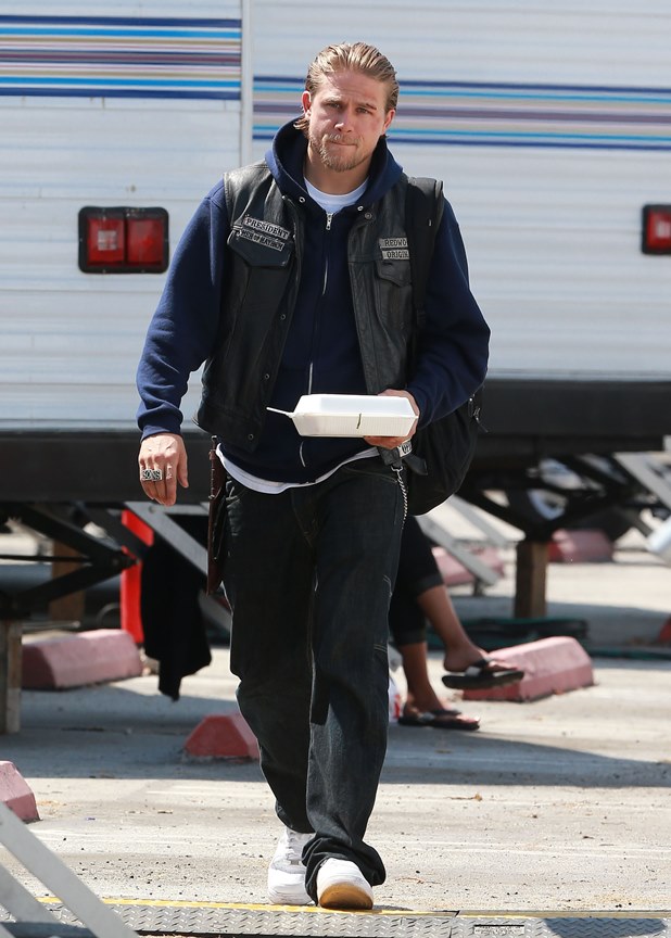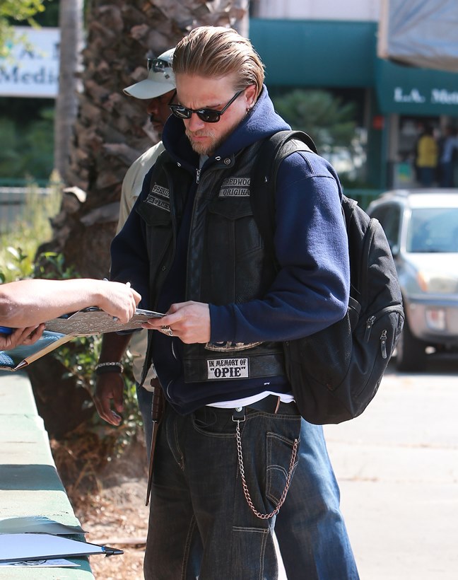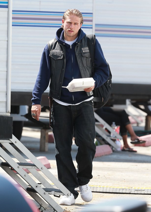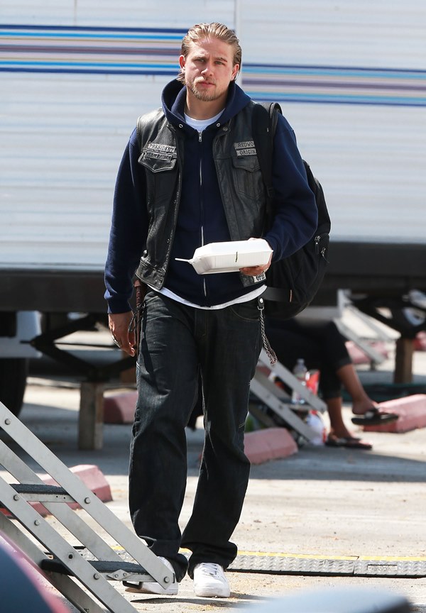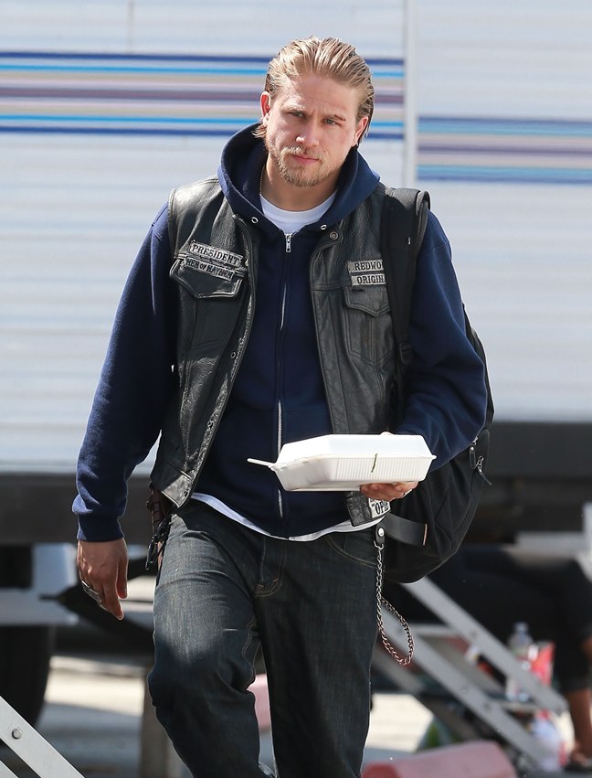 Charlie Hunnam’s trips to craft services are interesting to the paparazzi now that he’s to be Christian Grey. Check out Charlie on the set of Sons Of Anarchy yesterday picking up lunch with the crew and his cast-mates.