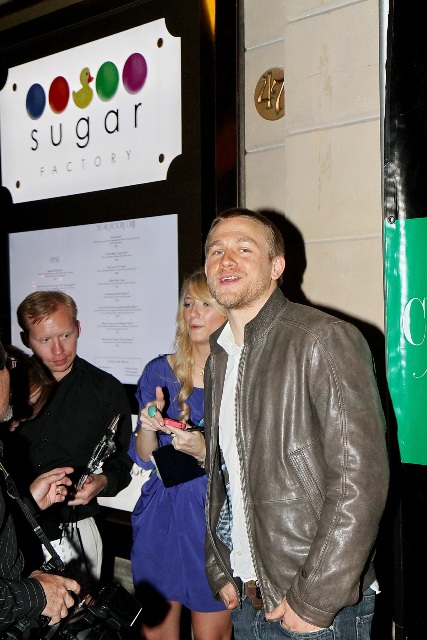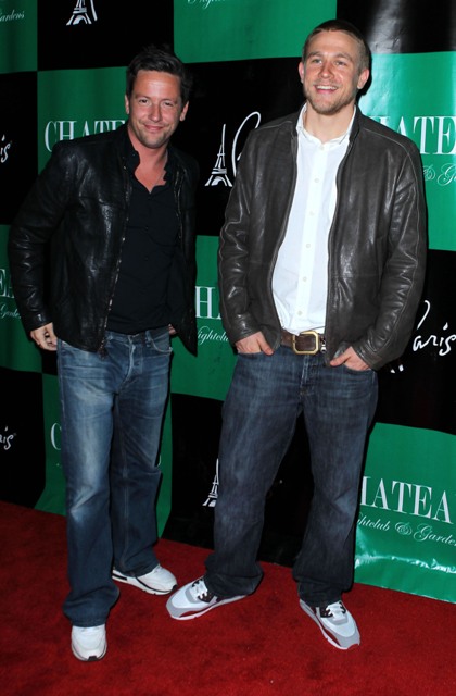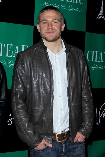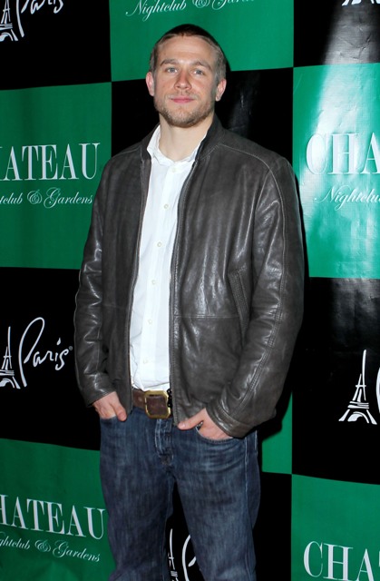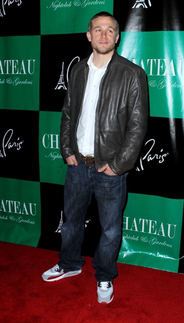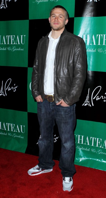 Charlie Hunnam hosted a party at Chateau at Paris (the hotel and casino) on Friday night. He's had his hair short for a while now, having just finished filming a movie during hiatus from Sons of Anarchy. It amazes me how un-photogenic he is in still photos, especially since, if you watch the show, I mean, Charlie, he's HOT. I've also met him in person. He's really, really hot. But for some reason, the camera, in a picture, it just doesn't love him. His head is always tucked into his neck. Or something.