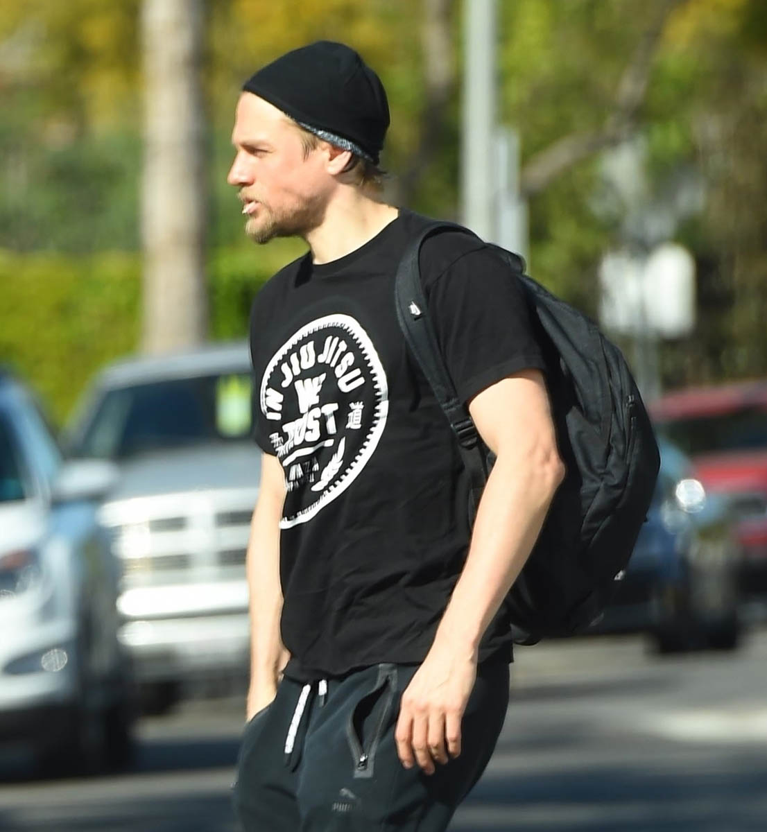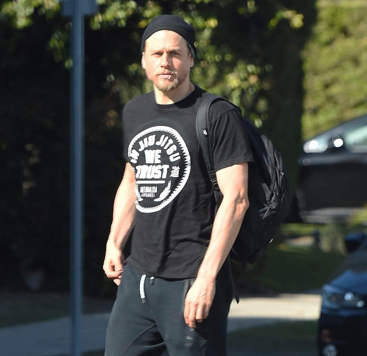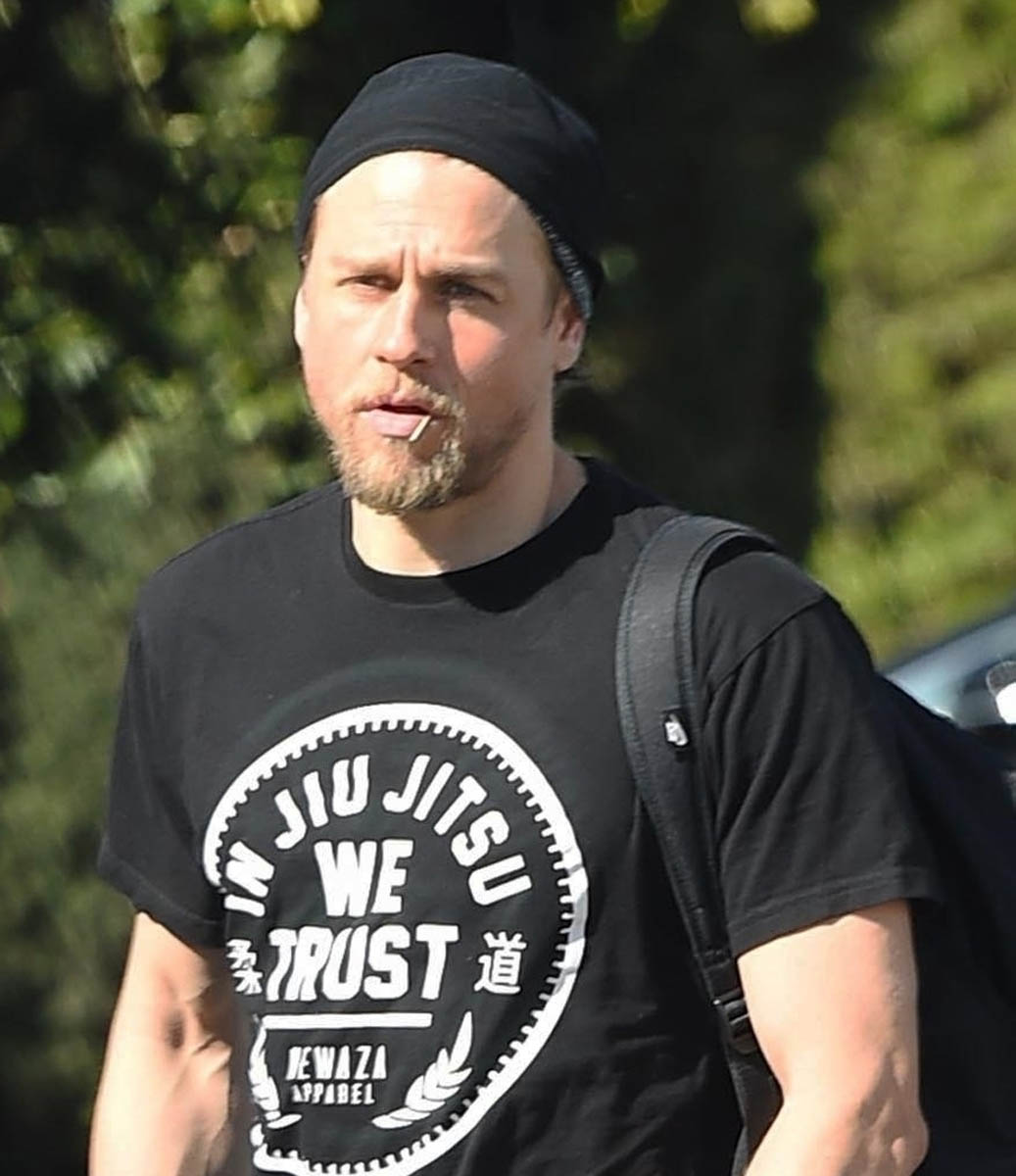 Back to Charlie Hunnam. He’s also wearing a t-shirt that says “In Jiu Jitsu We Trust” which means, of course, that he’ll be the next target of Demi Lovato’s thirst trap.