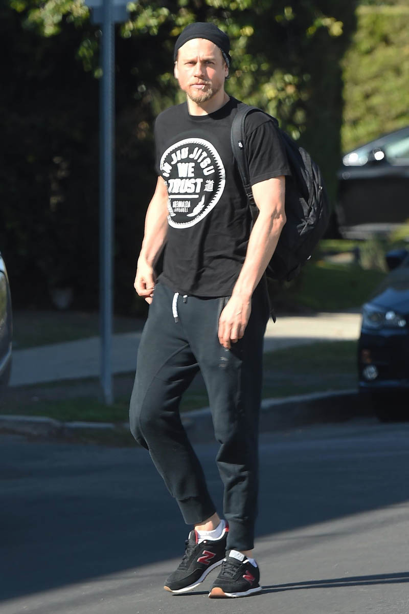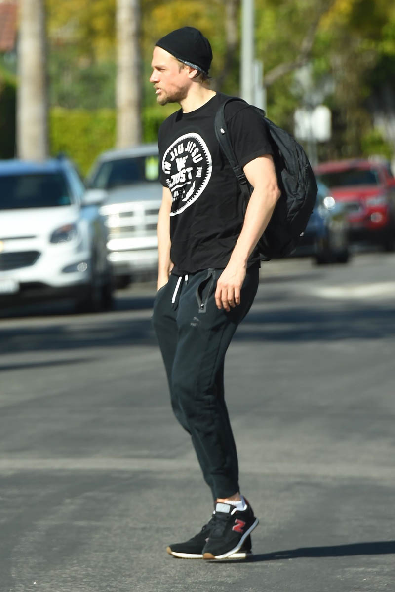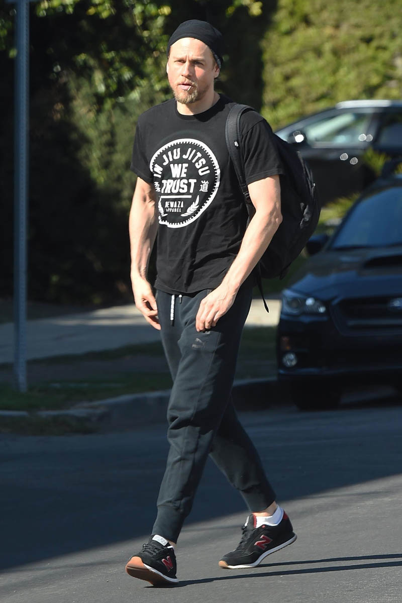 However, when our site manager, Emily, sent me these photos of Charlie heading to a rehearsal in Hollywood wearing the sh-t out of these fancy sweatpants, I’ll admit that I got a bit excited… about the pants. These sweats turn me on more than Hunnam does but it does take a certain type of man and physique to pull off this particular athleisure trend. He looks GOOD in these. I like the drawstrings. I’m really into the drop crotch and the way they cinch at the ankles. Actually, I think I want a pair for myself. Are matching his and hers sweatpants a thing? Can I make this happen?