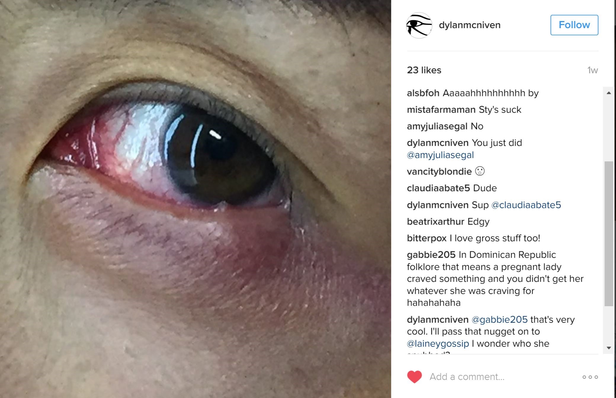 Appreciate your emails and tweets about my stank eye yesterday. Thank you! It still hurts and it’s probably still gross but I can open it wide enough to ogle Charlie Hunnam. Which is maybe why this happened in the first place. There’s an old wives’ tale in Chinese culture about eye sores – you get them when you’re a perv. In Dominican culture though it’s apparently about pregnant women? Yesterday I mentioned that my friend Dylan Instagrammed a picture of my eye and someone called Gabbie left a comment on the post: