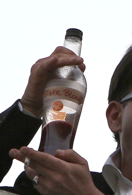 Attached – Charlie Sheen with one of the “goddesses” yesterday at Live Nation declaring victory with a machete and a bottle of Tiger Blood.
