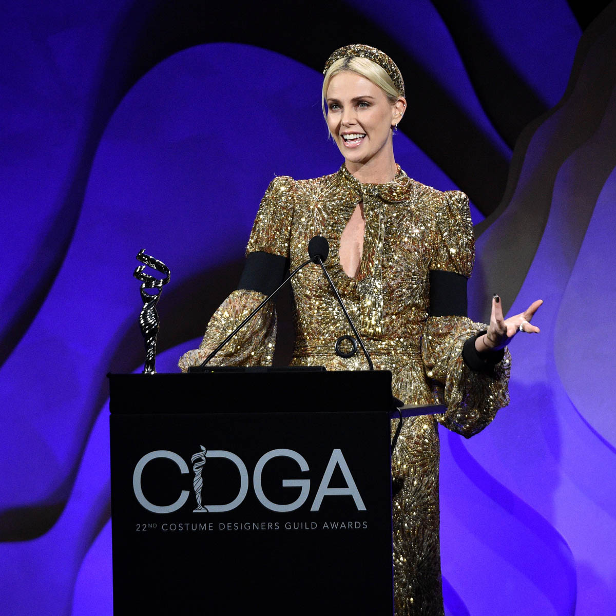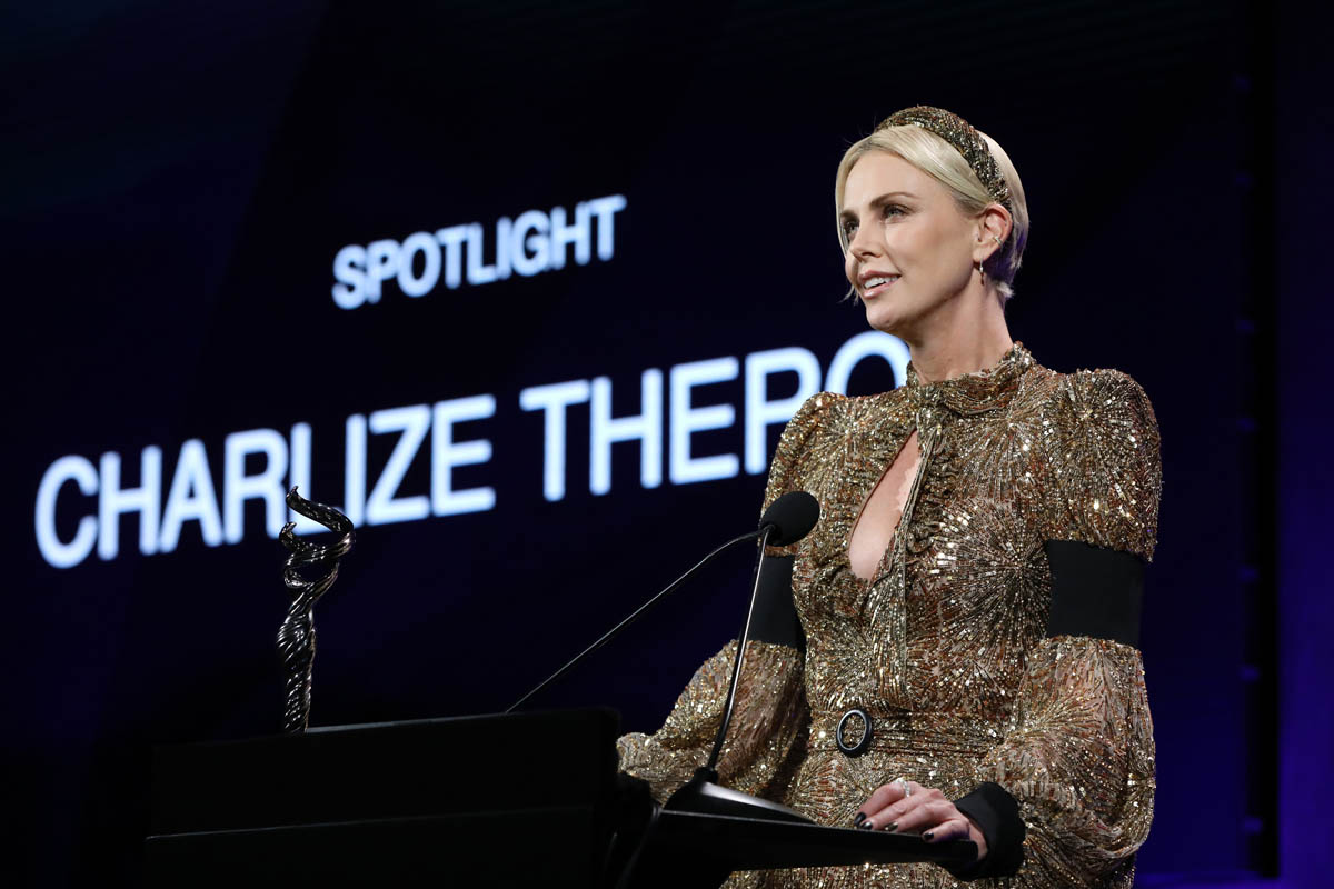 Charlize Theron accepted the Spotlight Award at the Costume Designers Guild Awards last night in Beverly Hills. The award honours actors who recognise throughout their careers the value that costume designers and costume artists bring to a role. There’s an obvious connection this year between Charlize’s work and how it’s been informed by costume in Bombshell but in almost every role, her costume has shaped her characters – Atomic Blonde, Tully, as Ravenna in the Snow White/Huntsman movies, Monster, even The Long Shot.