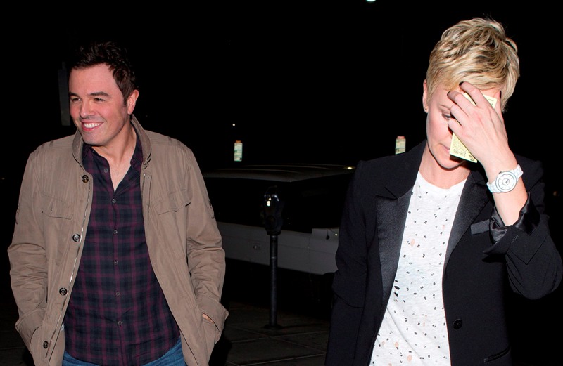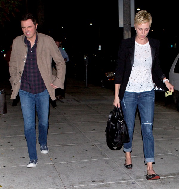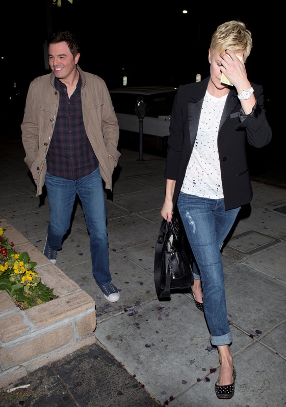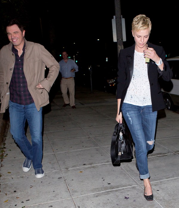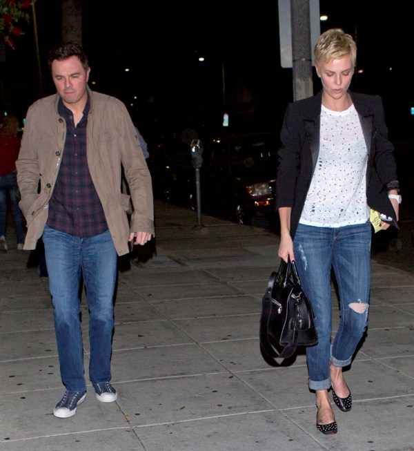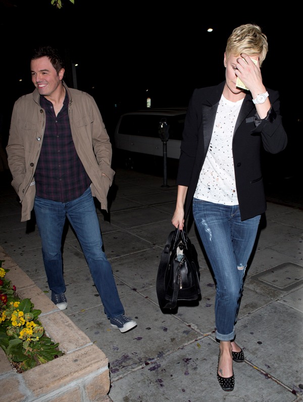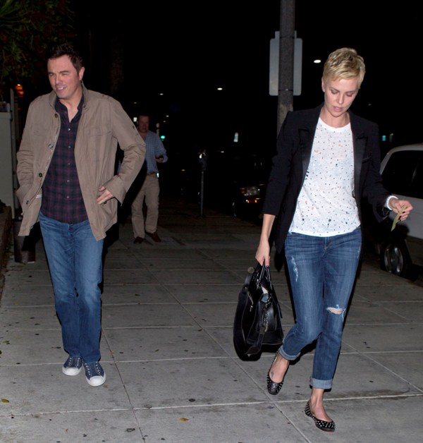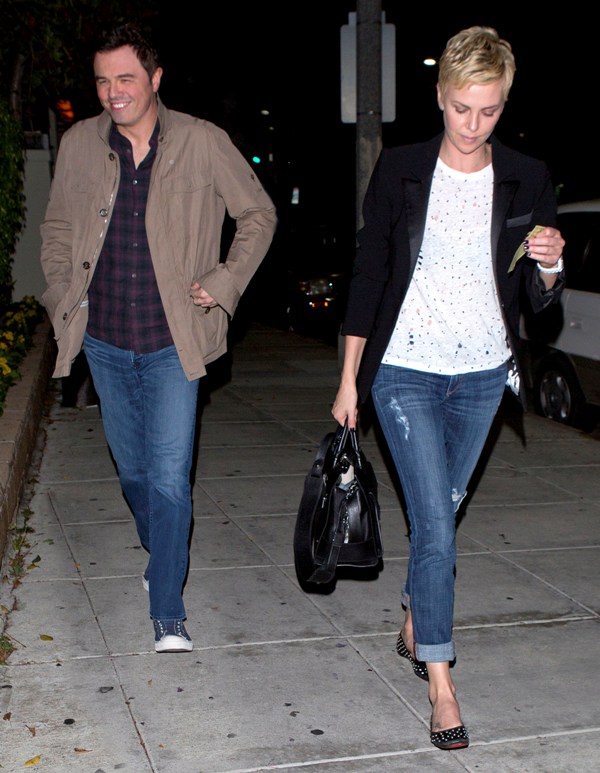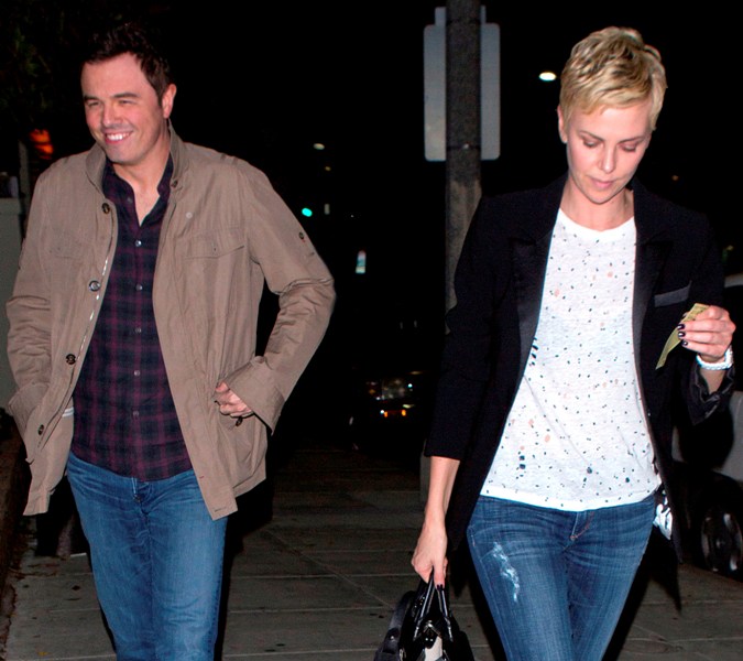 Charlize and Seth were first linked after the Oscars -- click here for a refresher. Apparently she skipped Vanity Fair to go to his party and stayed close to him all night. When it went wide that the two were possibility dating, she tried to kill the gossip by revealing that they were collaborating together on a project.