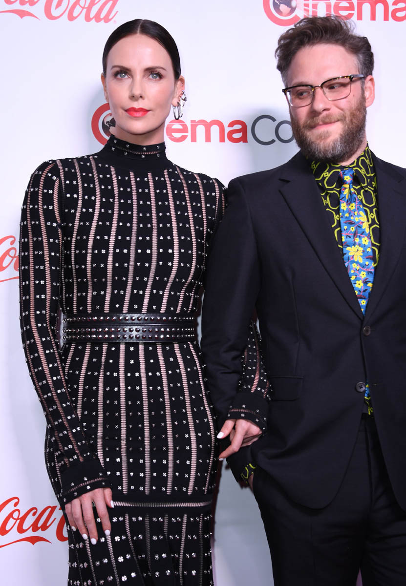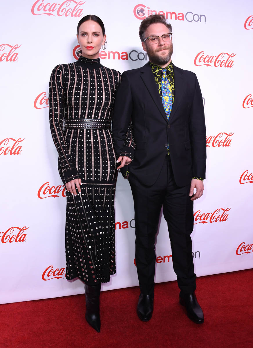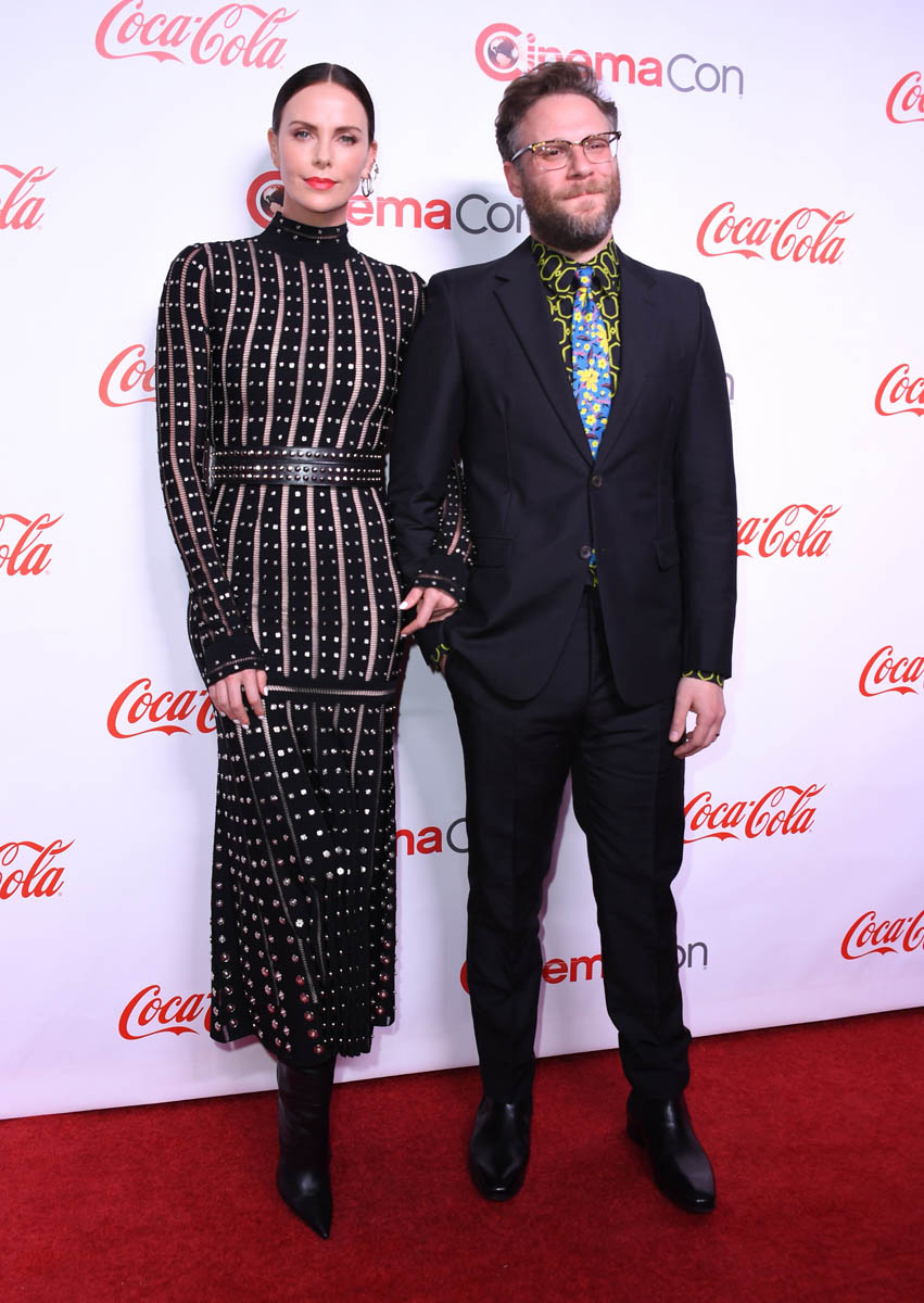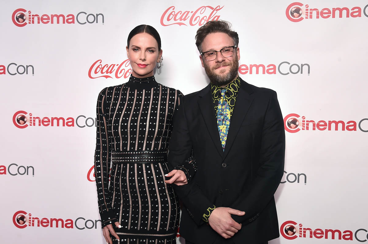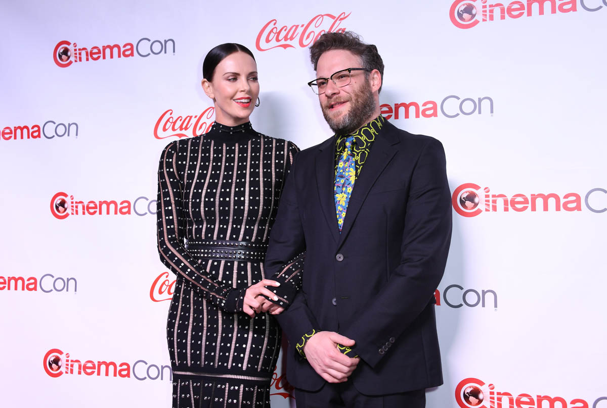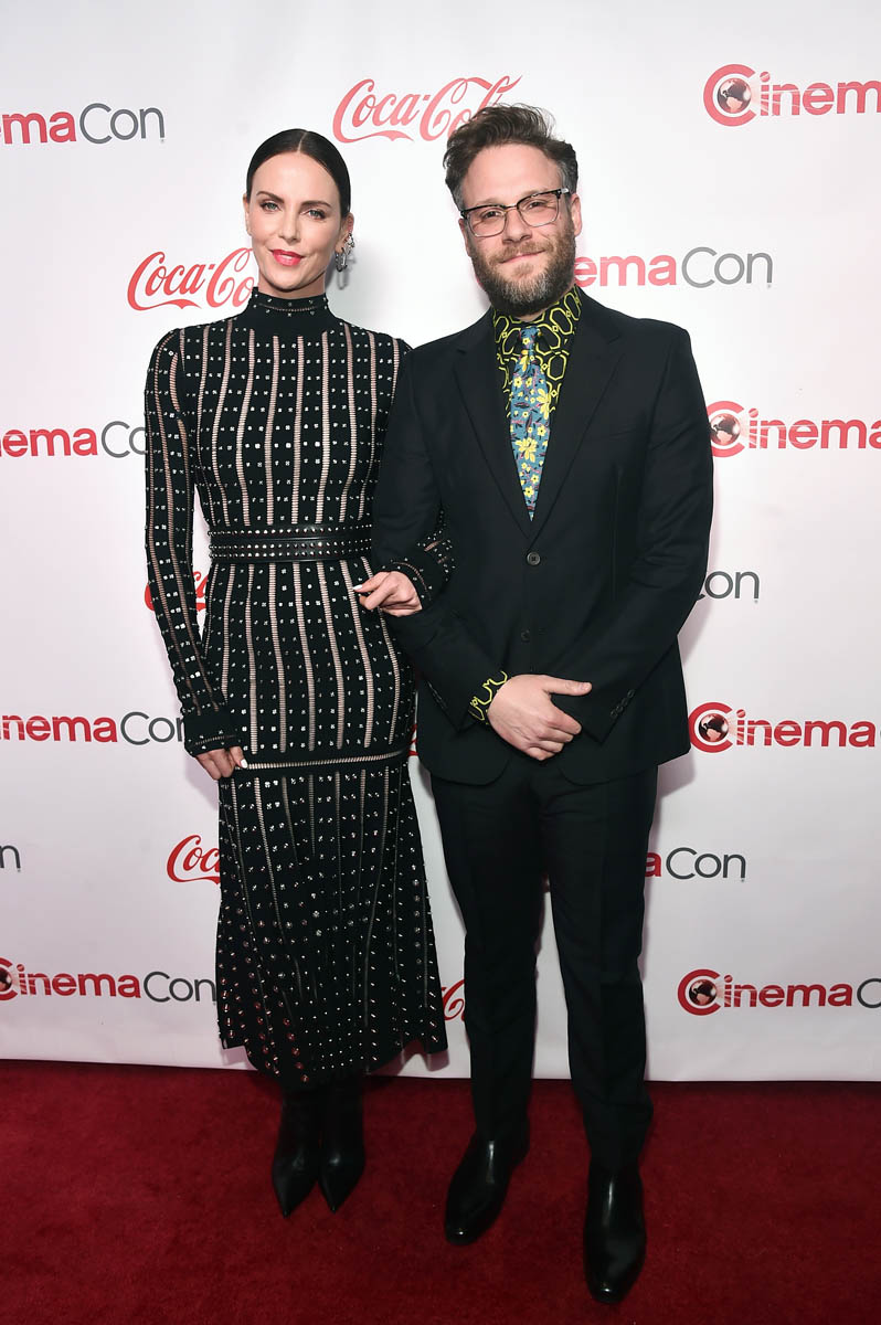 Charlize Theron and Seth Rogen were in Vegas for CinemaCon yesterday to promote Long Shot and they were presented with the Comedy Stars of the Year Award. Long Shot was well-received at SXSW last month, Charlize and Seth’s chemistry is reportedly really strong, and as we saw last year, the rom-com has been revived. Since she’s promoting a romantic comedy though, there are going to be romance questions. Is Charlize a “long shot”? Here’s what she told ET about her romantic status: