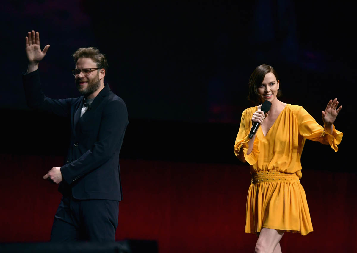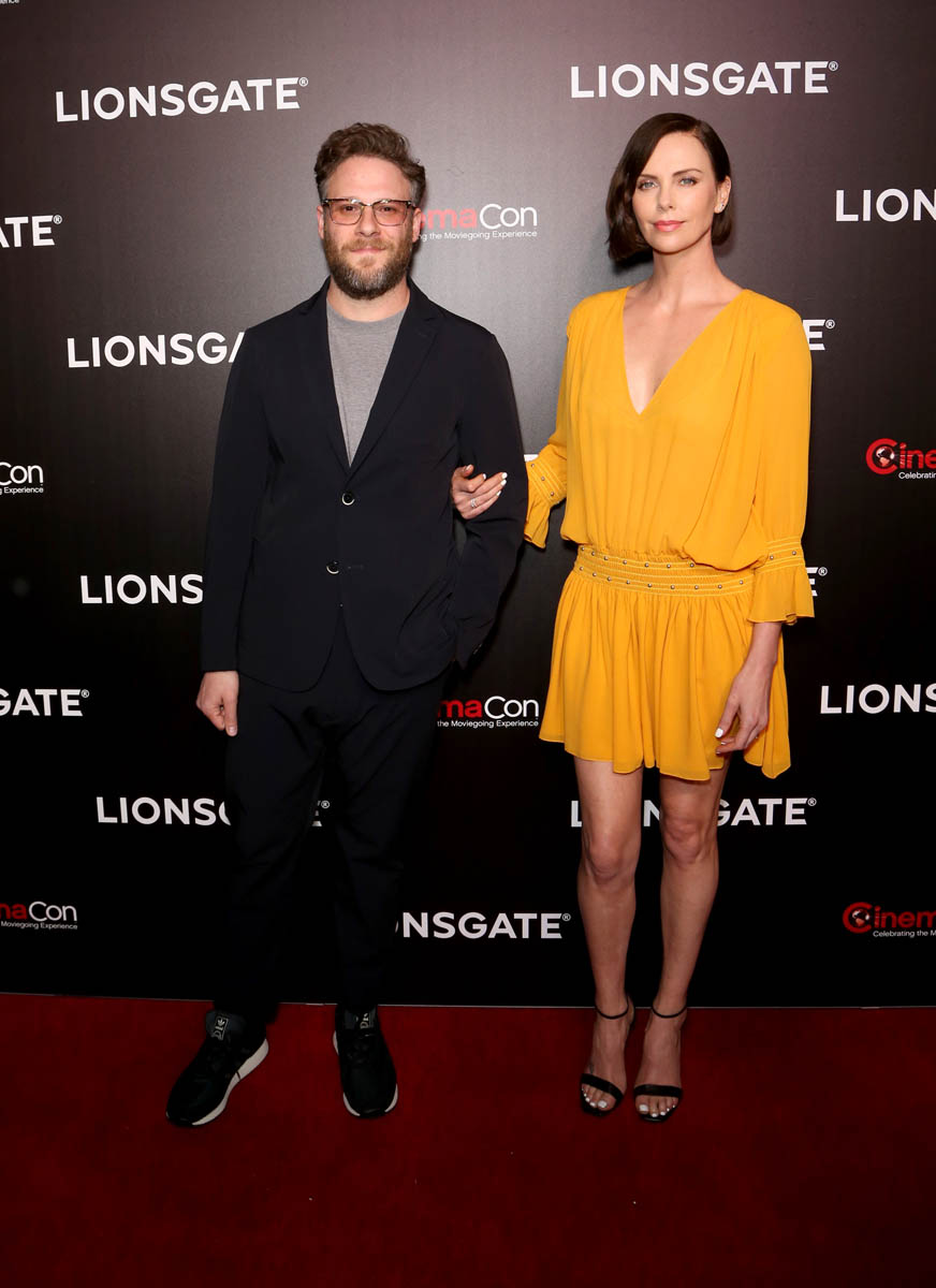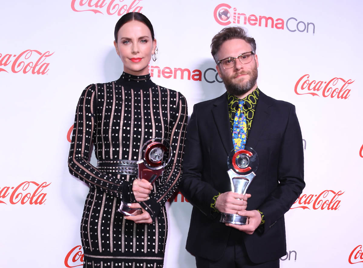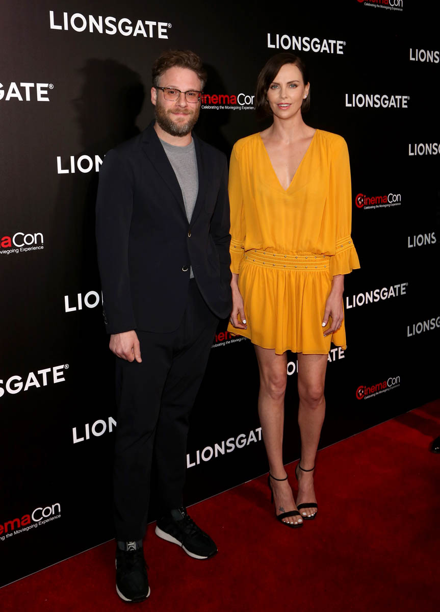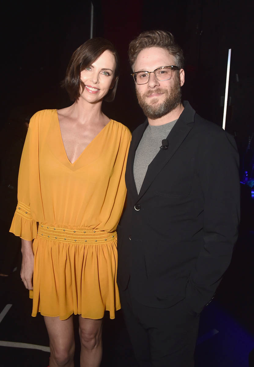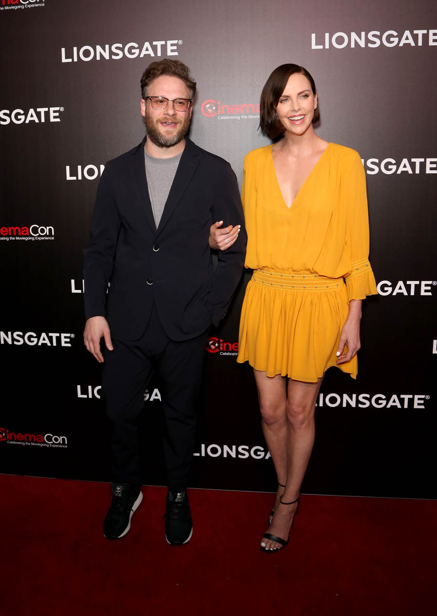 Charlize Theron and Seth Rogen were in Vegas for CinemaCon yesterday to promote Long Shot and they were presented with the Comedy Stars of the Year Award. Long Shot was well-received at SXSW last month, Charlize and Seth’s chemistry is reportedly really strong, and as we saw last year, the rom-com has been revived. Since she’s promoting a romantic comedy though, there are going to be romance questions. Is Charlize a “long shot”? Here’s what she told ET about her romantic status: