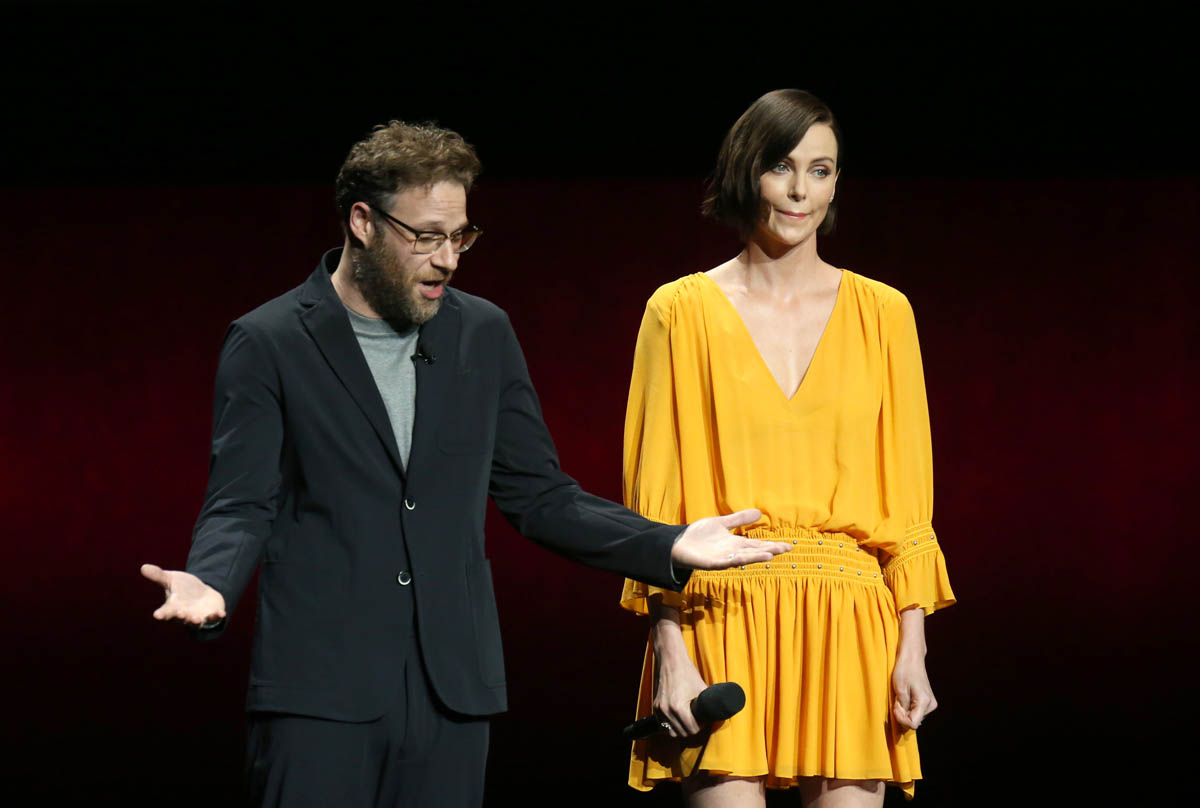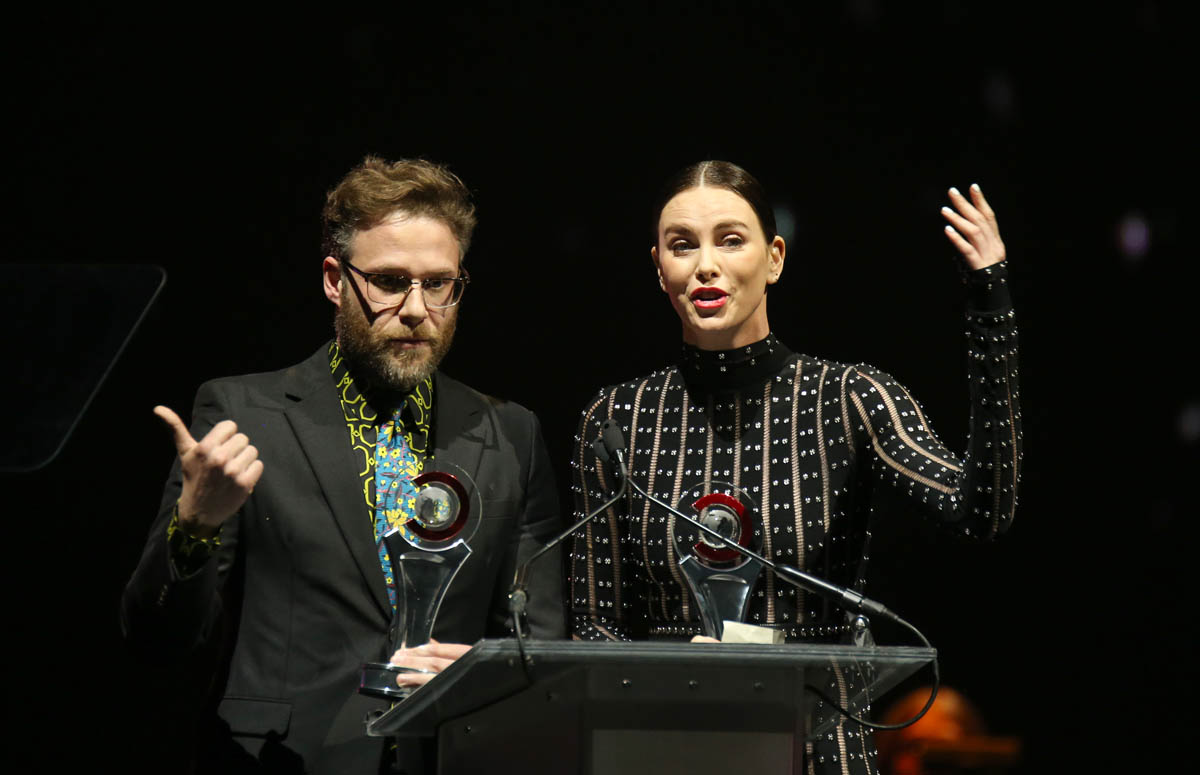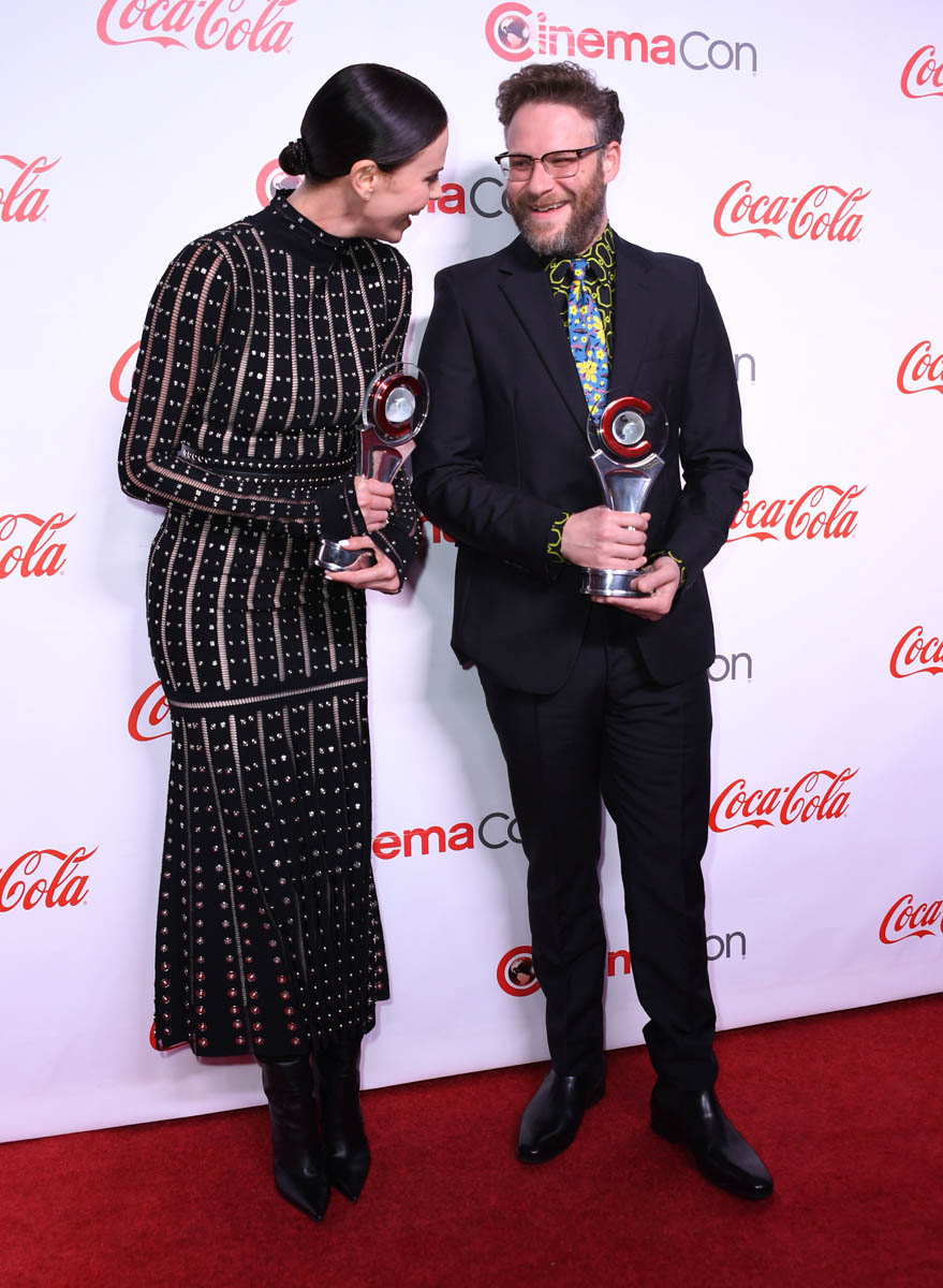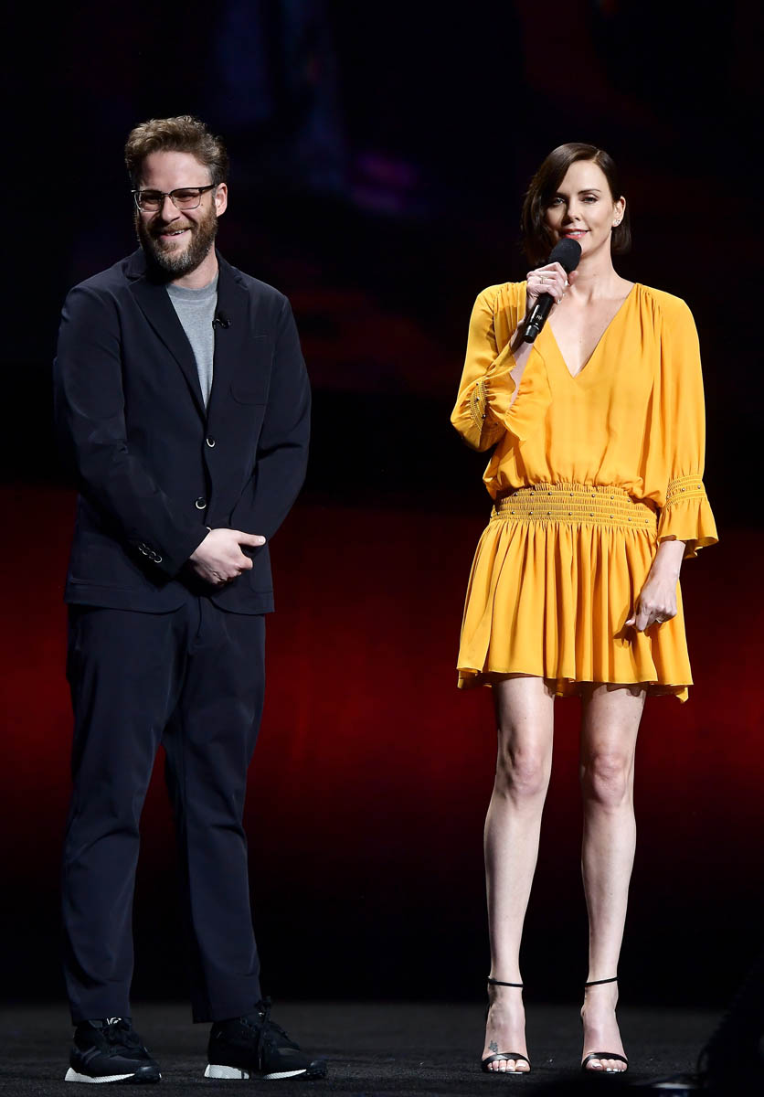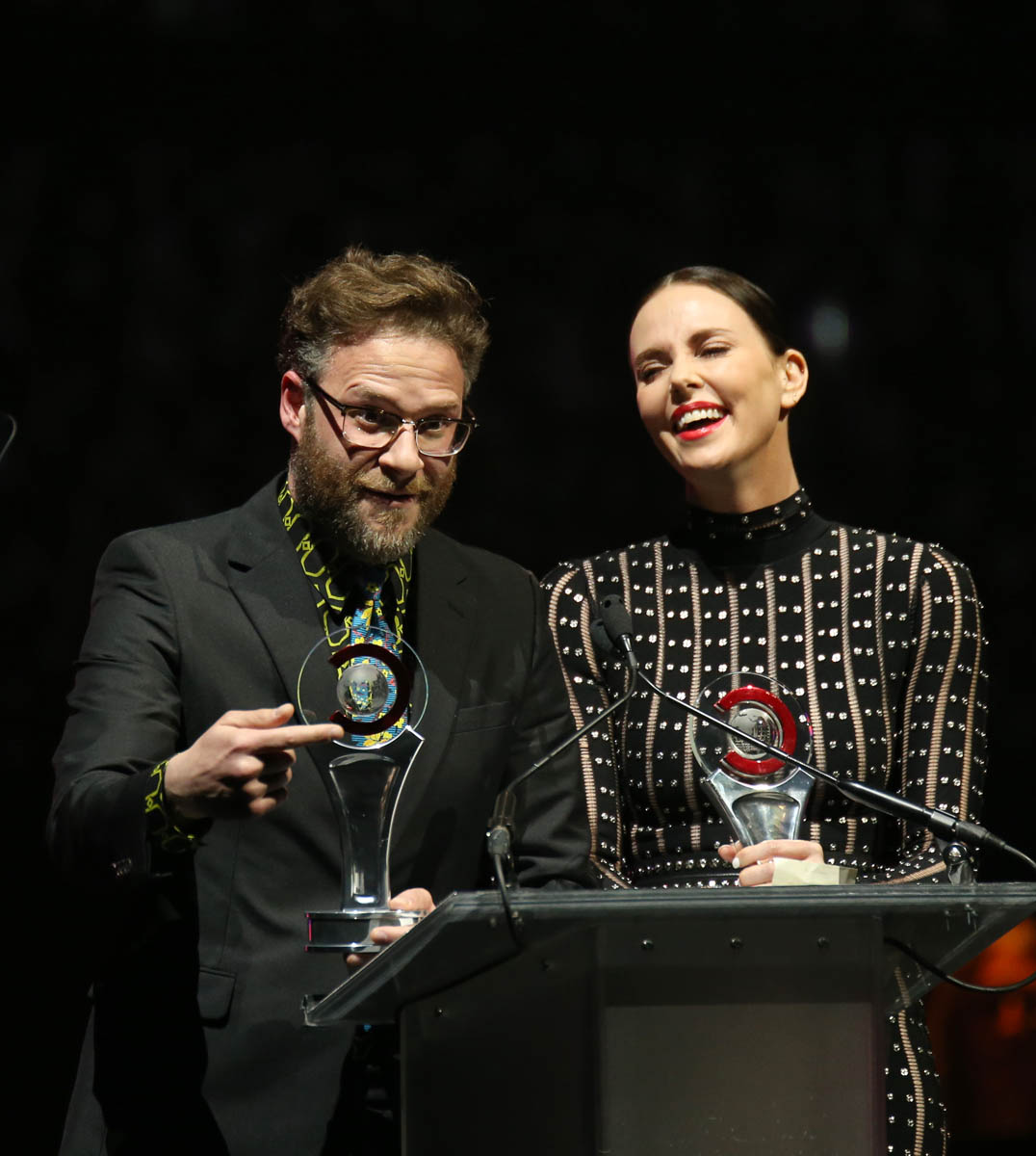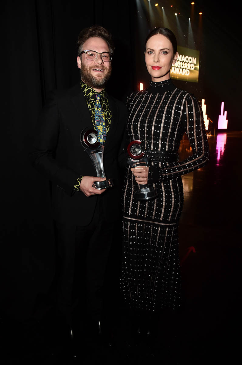Charlize Theron and Seth Rogen were in Vegas for CinemaCon yesterday to promote Long Shot and they were presented with the Comedy Stars of the Year Award. Long Shot was well-received at SXSW last month, Charlize and Seth’s chemistry is reportedly really strong, and as we saw last year, the rom-com has been revived. Since she’s promoting a romantic comedy though, there are going to be romance questions. Is Charlize a “long shot”? Here’s what she told ET about her romantic status: