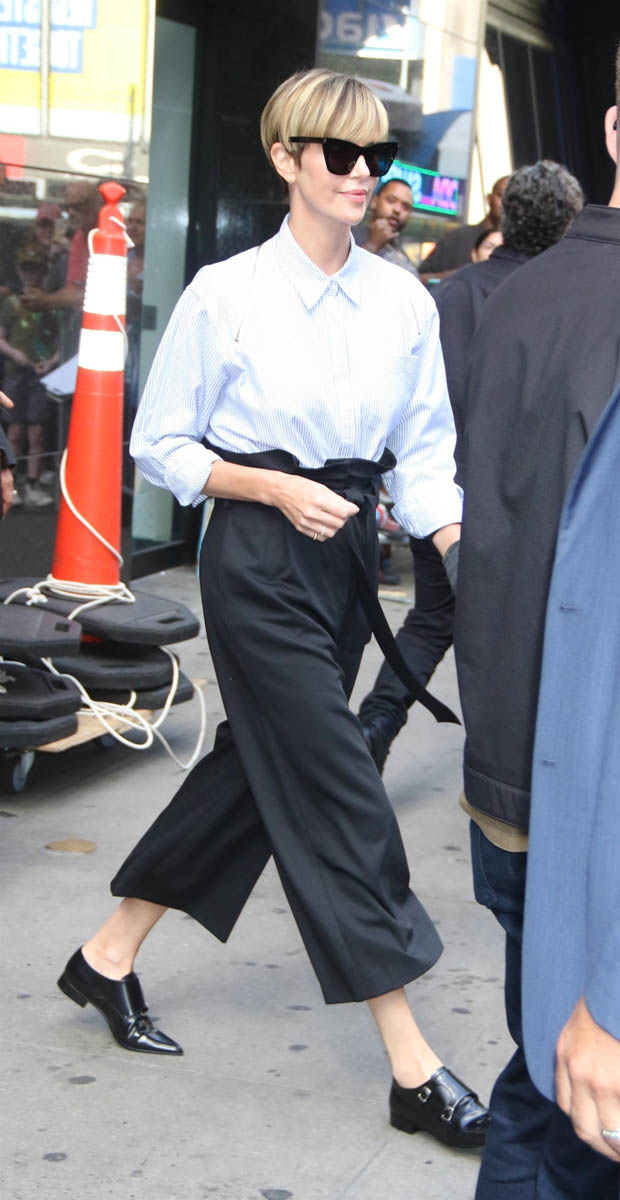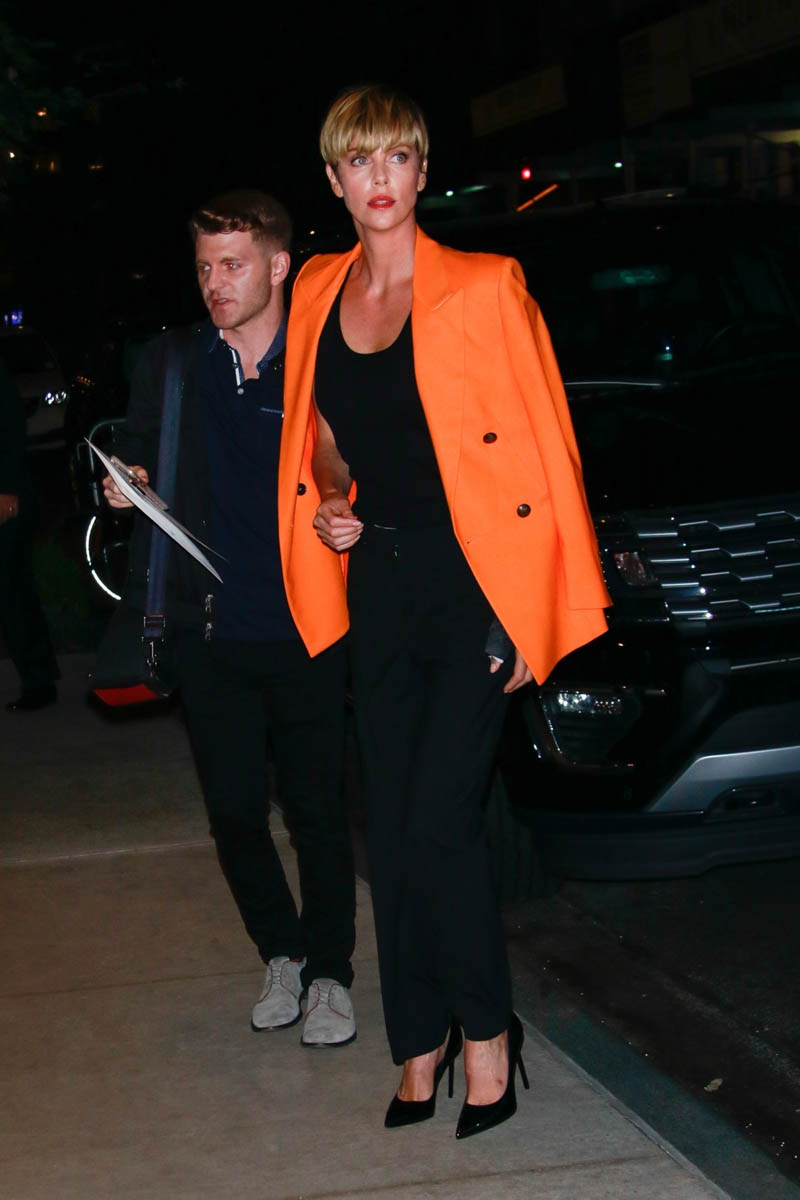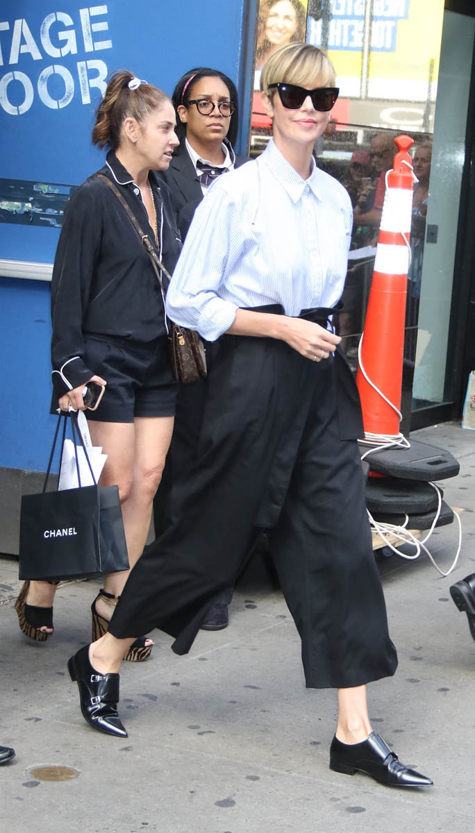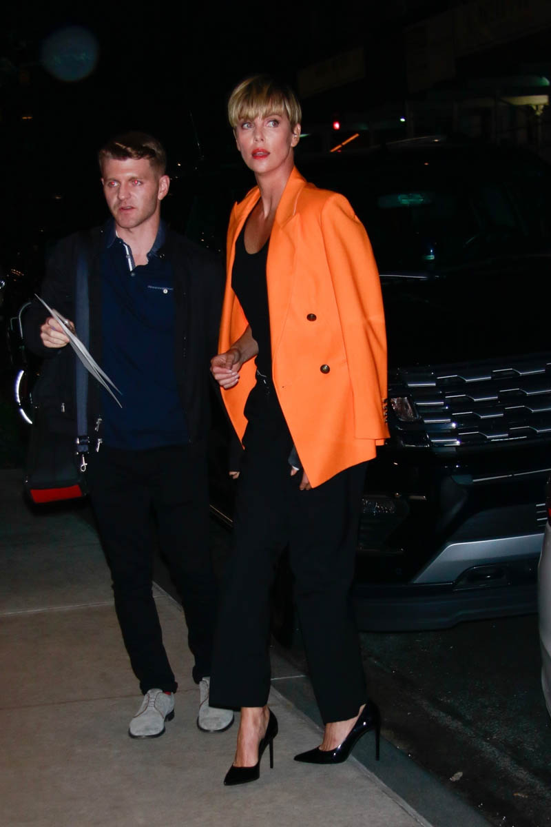 Charlize Theron, who did not date Brad Pitt, has been in New York this week doing some press. She was at Good Morning America yesterday and was seen last night out for dinner. GMA hasn’t yet aired the interview so, presumably, they’re banking it, which is why most think that she’s promoting Bombshell, the film about the women of Fox News and Roger Ailes. Charlize plays Megyn Kelly, Nicole Kidman is Gretchen Carlson, and Margot Robbie is a composite fictional character representing those who reported sexual harassment to Fox Human Resources. A teaser for the film, due out December 20, was released a few weeks ago. It was VERY effective