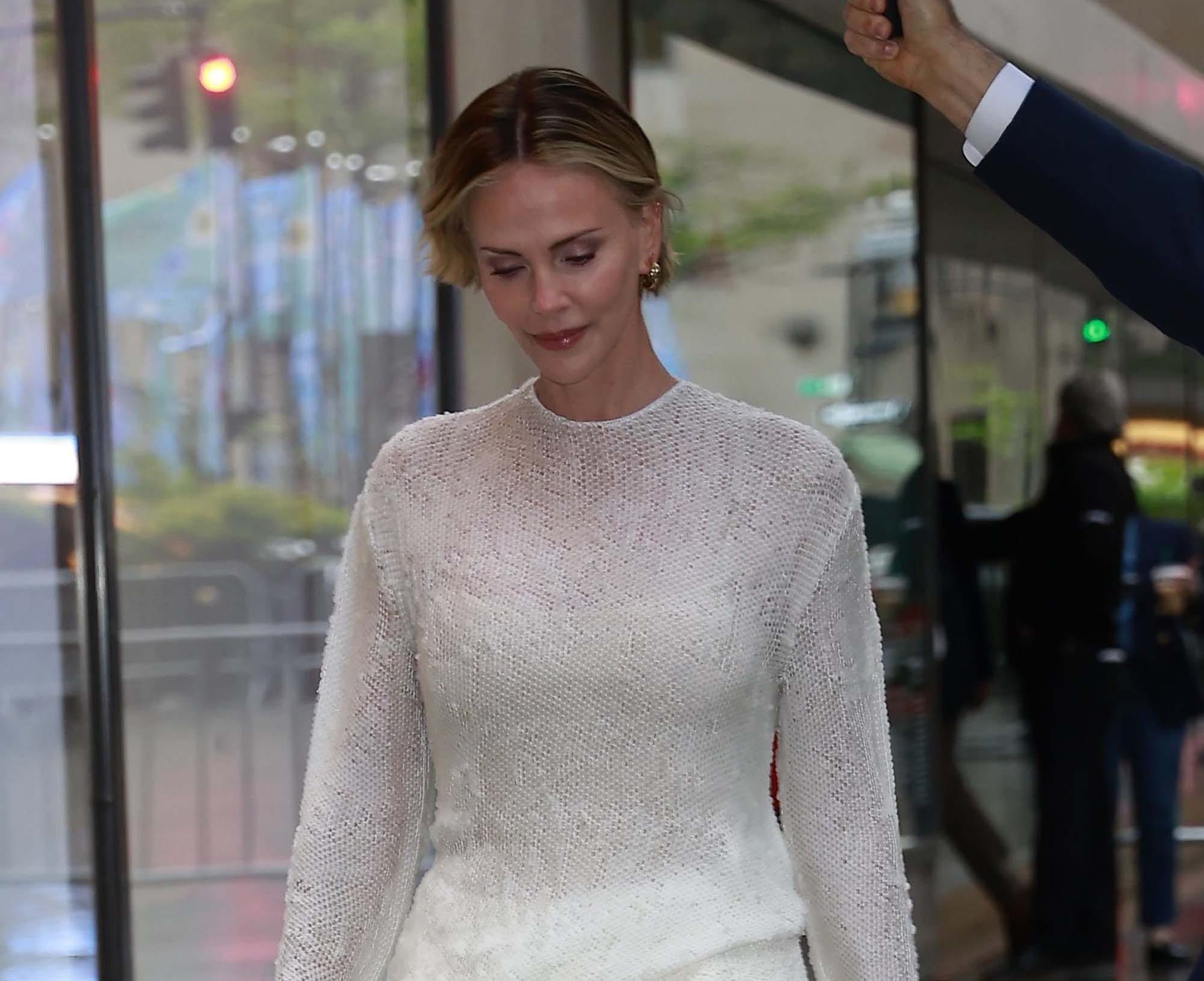 Charlize Theron is making the rounds in New York promoting a new movie called Apex. As mentioned in this space earlier this week, she was also making headlines a few days ago, from her experience as a former dancer, for her comments on Timothée Chalamet disrespecting ballet and opera. Charlize actually trained in ballet and only quit because of an injury…and speaking of ballet, she’s kinda dressed here in an outfit that could be ballet.
