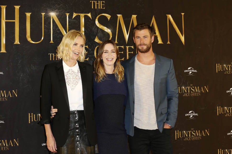I’ve wanted to post these photos of Charlize Theron, Emily Blunt, and Chris Hemsworth promoting The Huntsman: Winter’s War but didn’t have anything to say beyond I’m not sure about the draw of this movie – as Sarah’s mentioned – but I still want to see it because Charlize + Emily + Jessica Chastain.