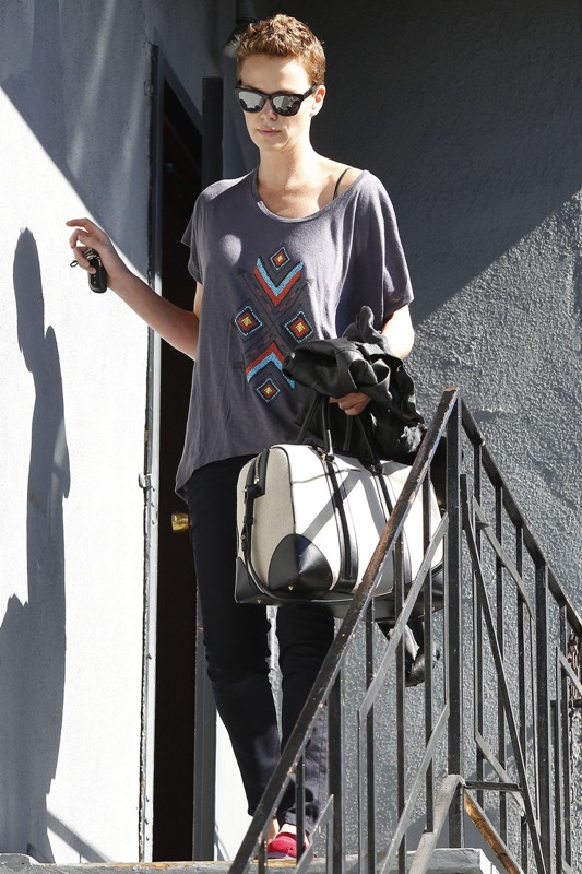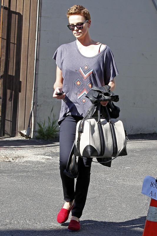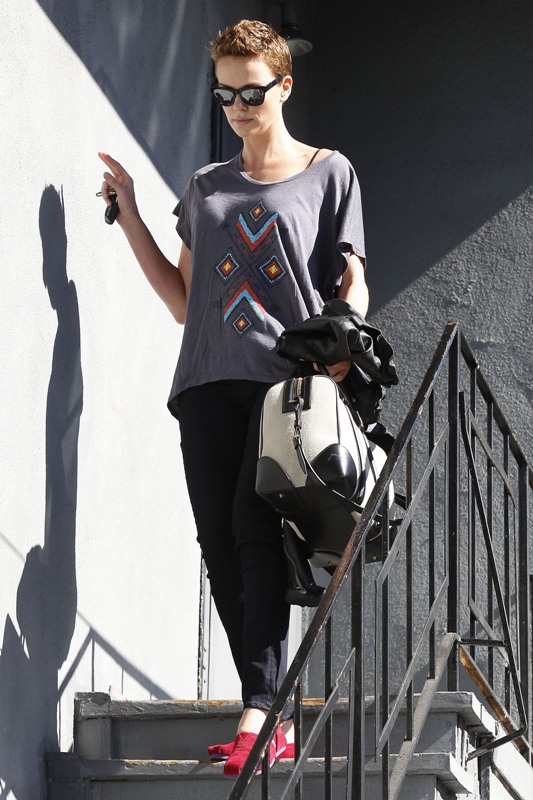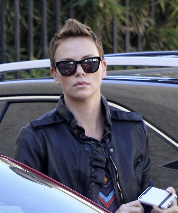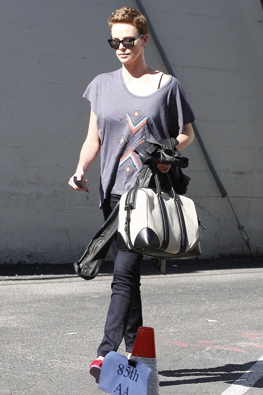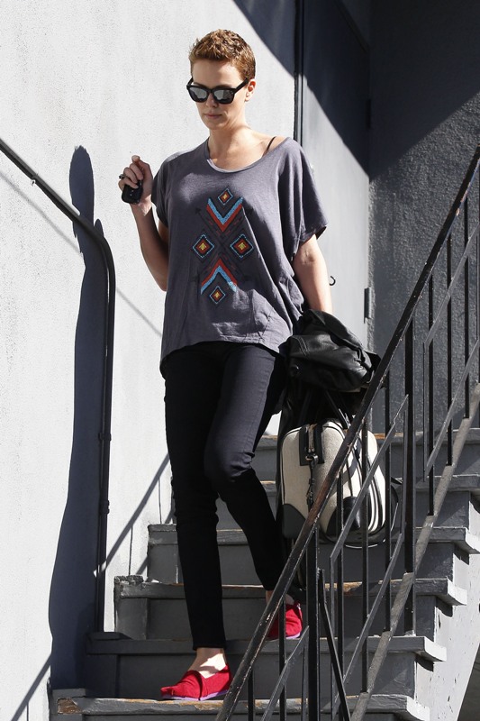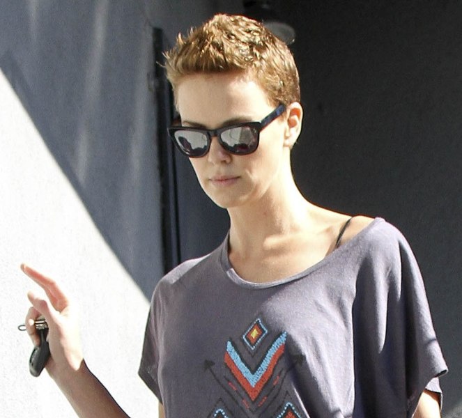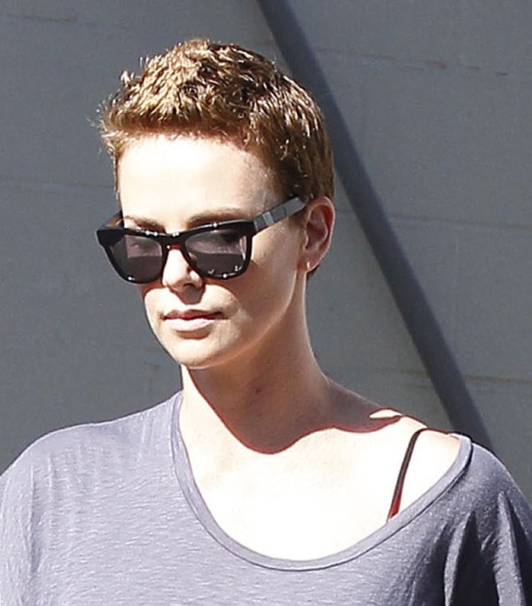 Charlize Theron is growing her hair out after Mad Max. It’s long enough now to push up into a faux-hawk. If only we could all look this great in a faux-hawk. This is hair porn. This is true hair porn. For those who cannot wear short hair without having it stick up like a porcupine, this is the porn of the hair. I might want her to be like this for a long time. I might never want to see it by her shoulders again.
