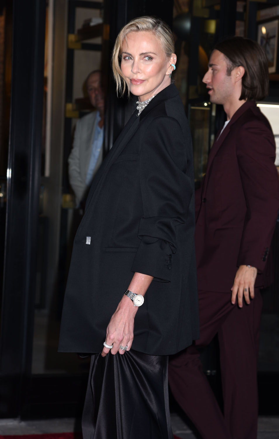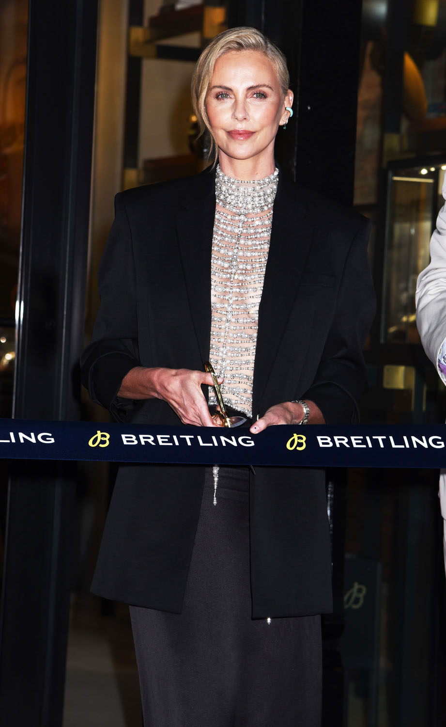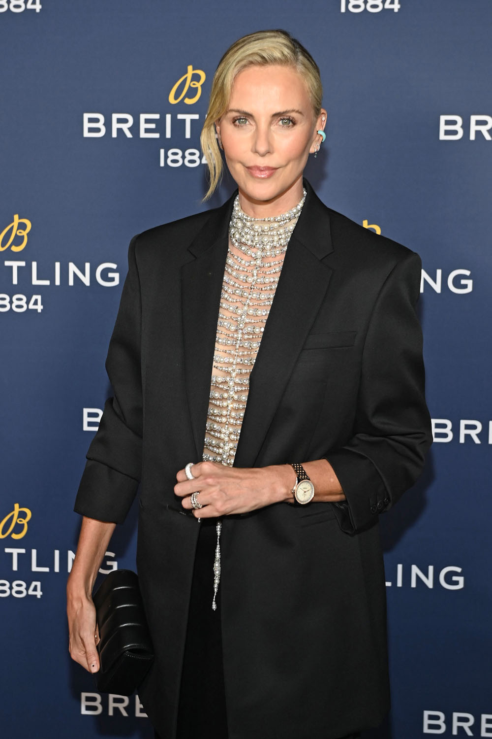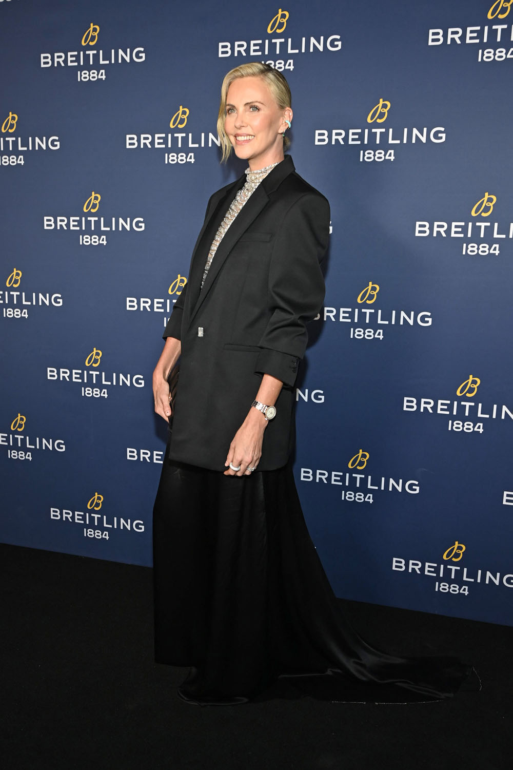 Like Charlize Theron who was at two events this week and serving pearls for both. First at the Breitling launch on Wednesday (she’s an ambassador), Charlize showed up in Givenchy. It’s a black blazer over a black skirt and she looks great…
