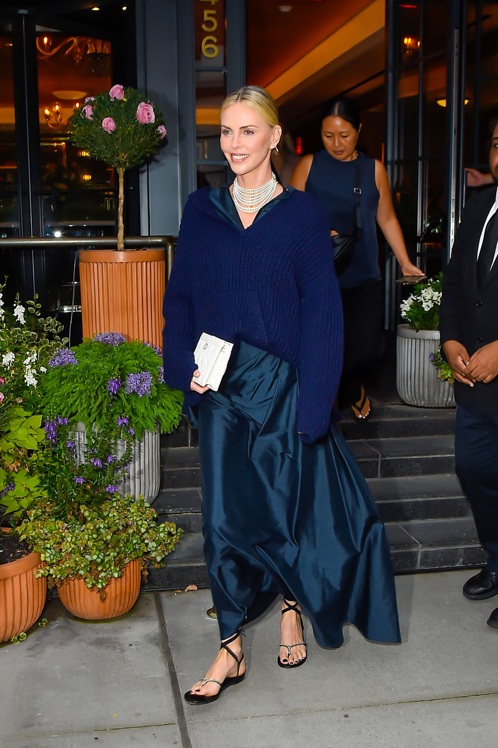 An outfit like this is all in the styling, so big ups to her longtime stylist Leslie Fremar for throwing this gorgeous blue slouchy sweater over the loose skirt and then topping it off with that pearl choker. The flat sandals instead of a more formal shoe is also an excellent finishing touch.