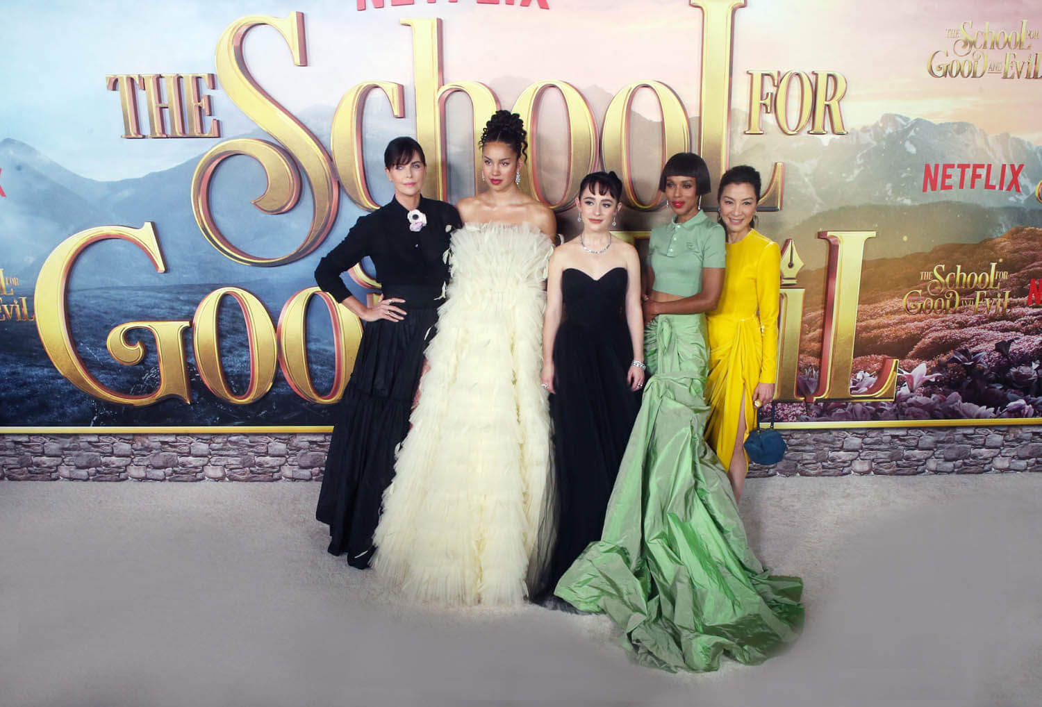 Attached – Michelle, Charlize, Kerry Washington, and the cast of The School for Good and Evil at the premiere last night.