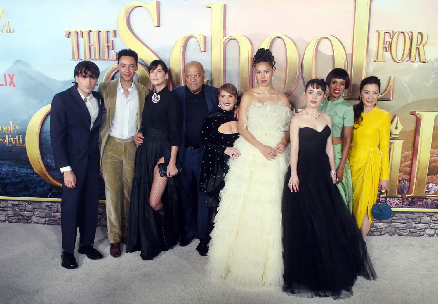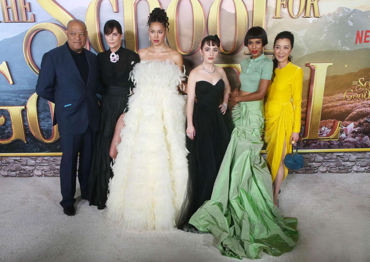 Attached – Michelle, Charlize, Kerry Washington, and the cast of The School for Good and Evil at the premiere last night.