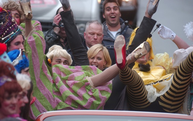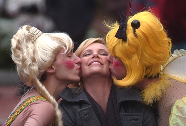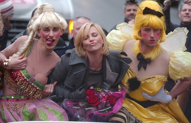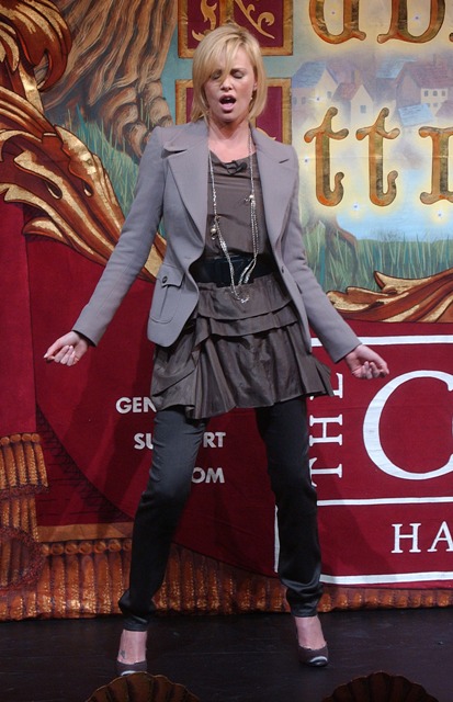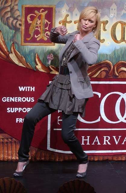 Charlize Theron received the annual Hasty Pudding Theatricals Woman of the Year award from Harvard University today and in university tradition, hammed it up for the crowd. Charlize, of course, is a “serious” actor these days, conveniently and successfully putting her model beginnings behind her, only game for meaningful and artistic endeavours these days.