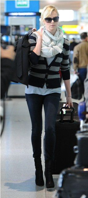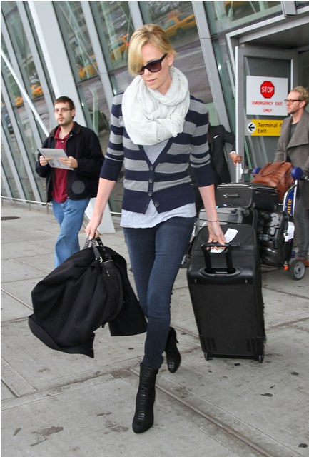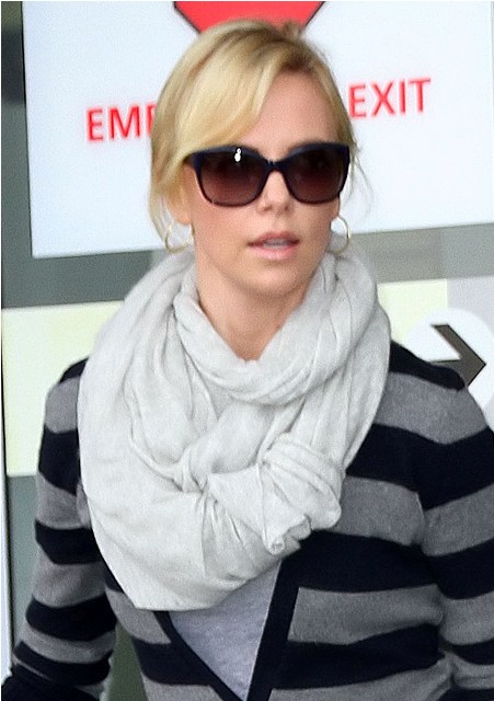 I love the look of a big scarf like this so much. My problem is that I’m short and stubby. And I am not flat-chested (it’s really too bad) and have long hair. So by the time I wrap all that sh-t around me, it takes up so much from and gets so weighed down, my stumpy legs that are a only foot long stick out from underneath like a head of broccoli on top of fingerling potatoes. Unlike Charlize Theron who is a mile long everywhere and makes this work all f-cking day. Look at her. It’s perfect. And yes, I will ask Sasha to find this for you.
