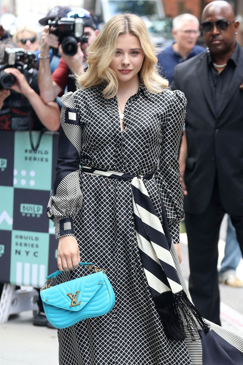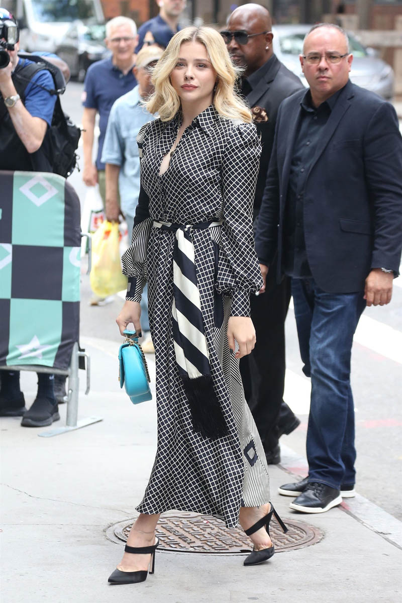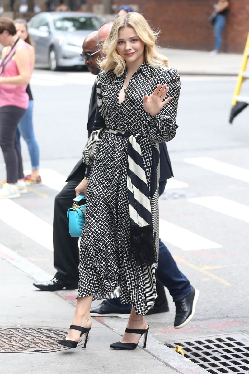 Check out Chloe Grace Moretz strutting in a long black and white shirt dress that a lot going on in the print and still, somehow, it all comes together. It has to have that much going on though because, otherwise, maybe the checks in the front would read kinda boring. Note then what they’ve done with the one sleeve and how they’ve extended and entirely different print around to the back. SO good, right? The two prints clash just enough and complement each other just enough. And then the belt ties it all together.