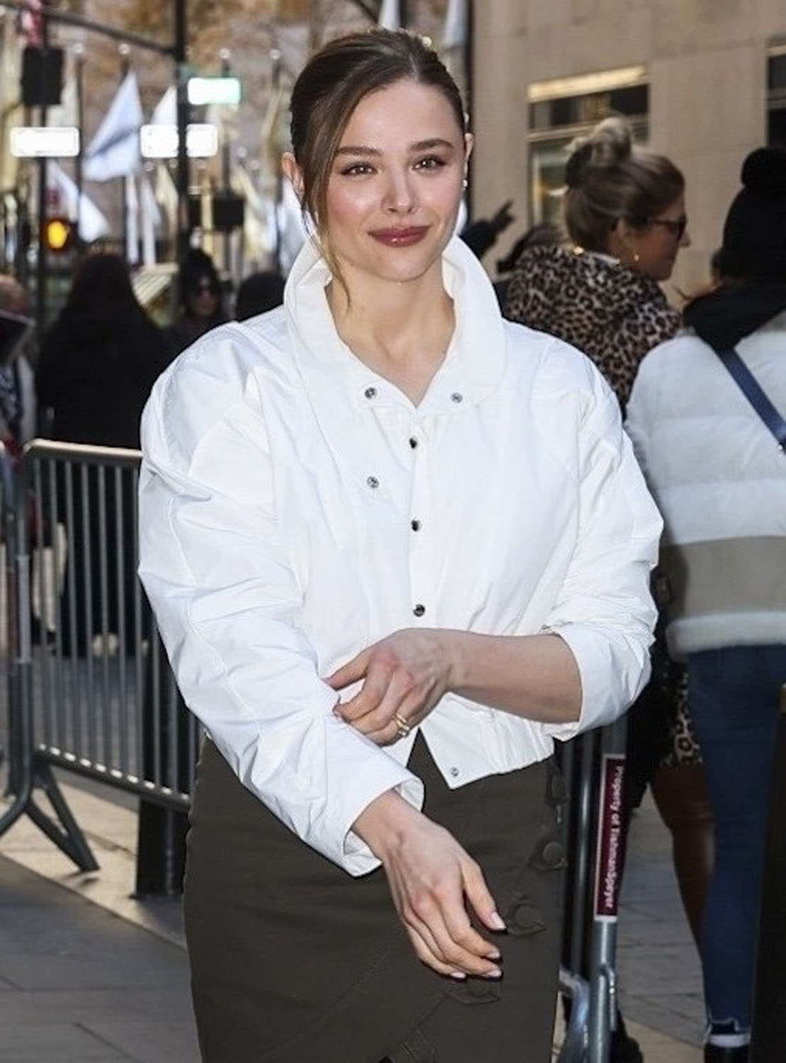 Here’s Chloë today in a cute white crop jacket in New York promoting the movie and the other day in a Louis Vuitton denim set for Late Night with Seth Meyers.