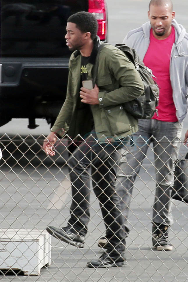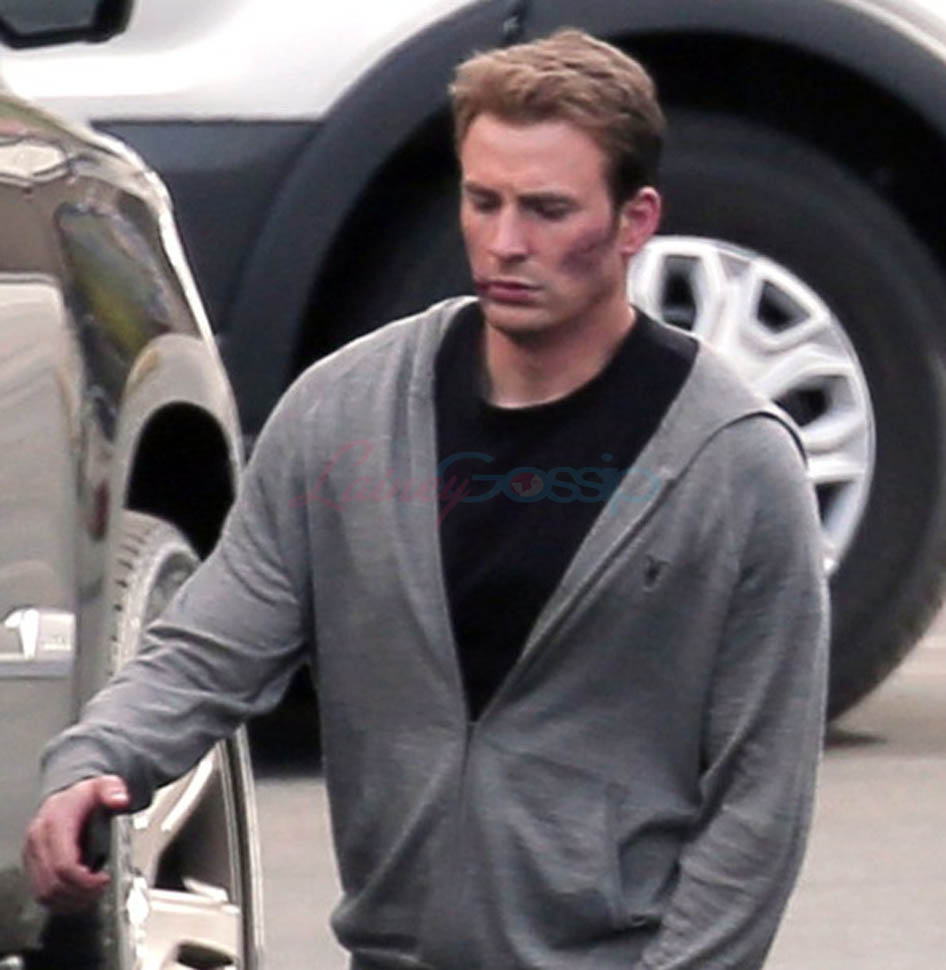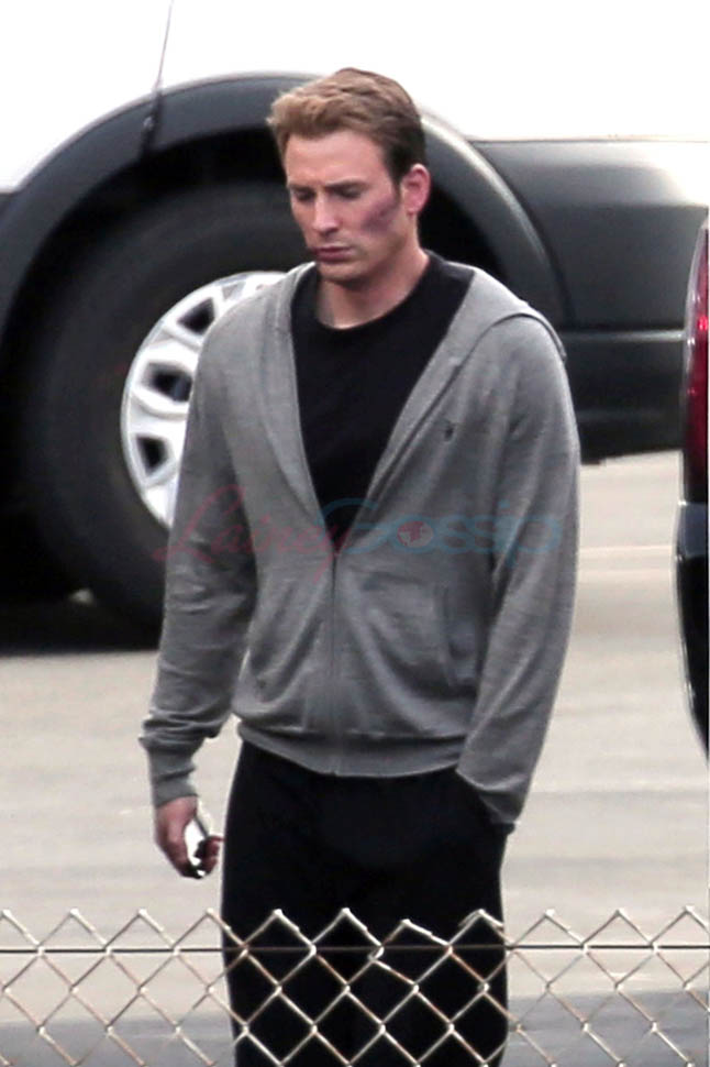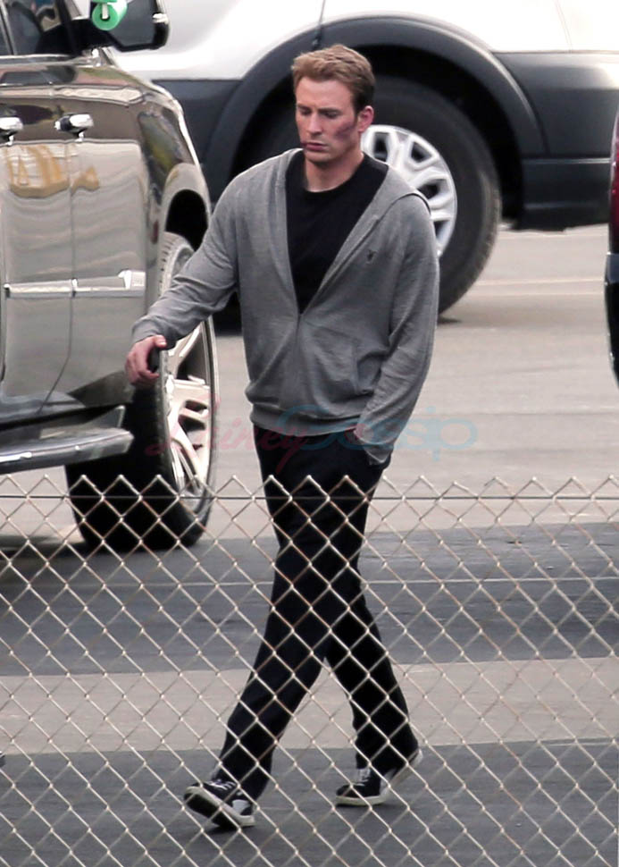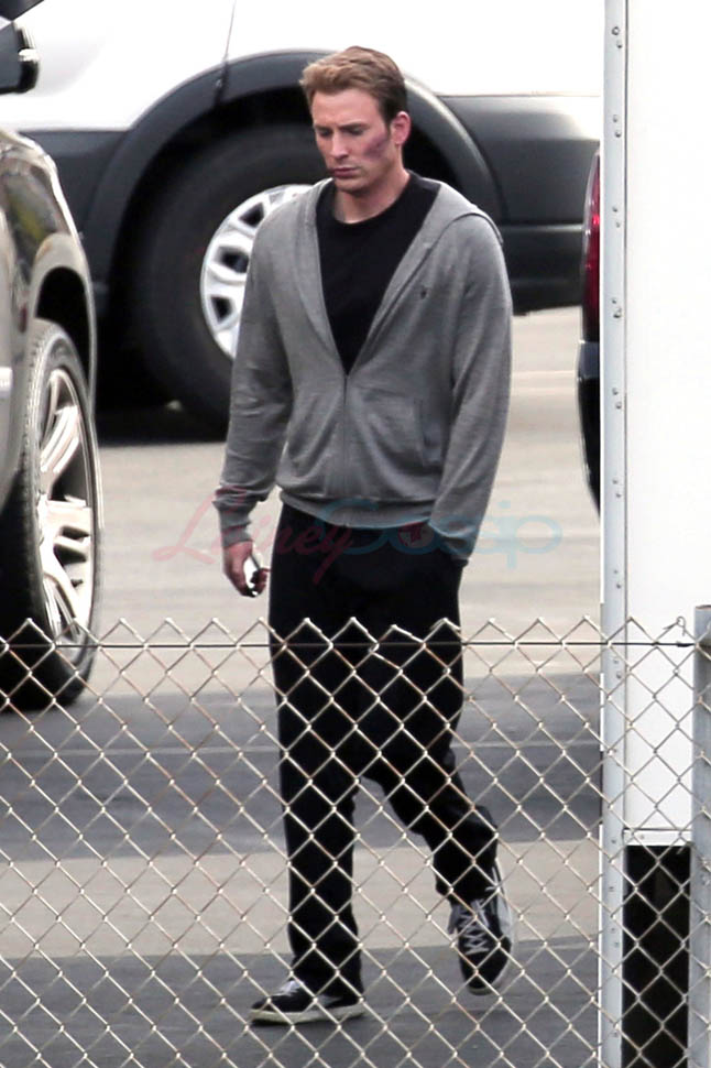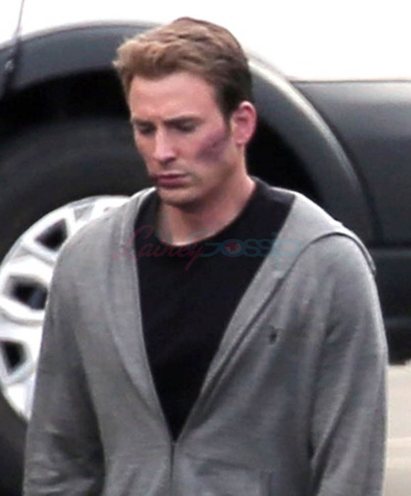 Here are photos of Chris Evans and Chadwick Boseman on set for Captain America: Civil War reshoots in Los Angeles this week. Evans is sporting some serious fake bruises on his face, which means Cap is getting his ass handed to him at some point. Boseman looks fine because Black Panther is smart and wears a full-face mask. I like picturing a scene that occurs between movies of the Avengers trying to convince Cap to get a full-on mask and he’s like, “No, I really like getting my cheekbone shattered every time we fight.”