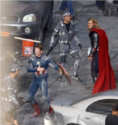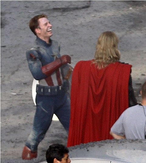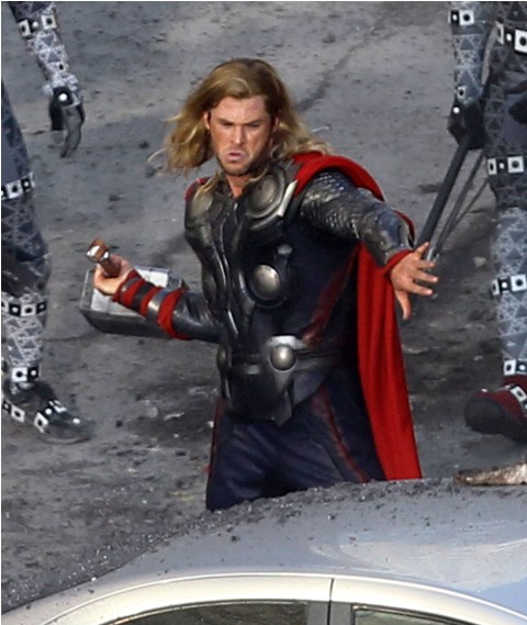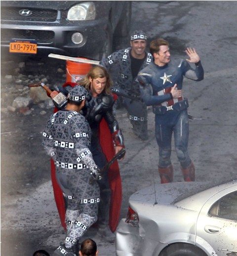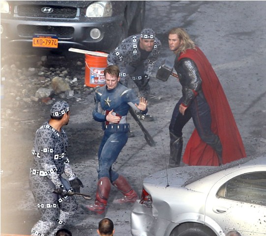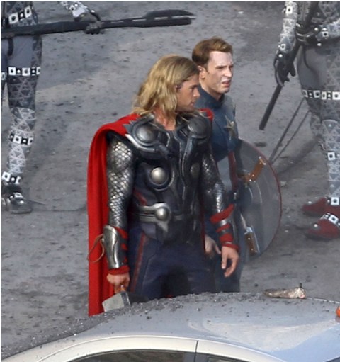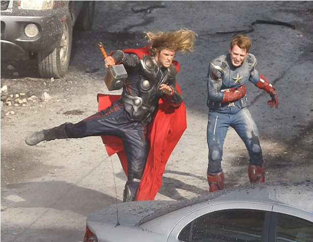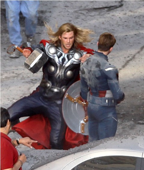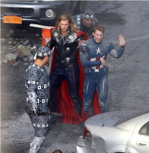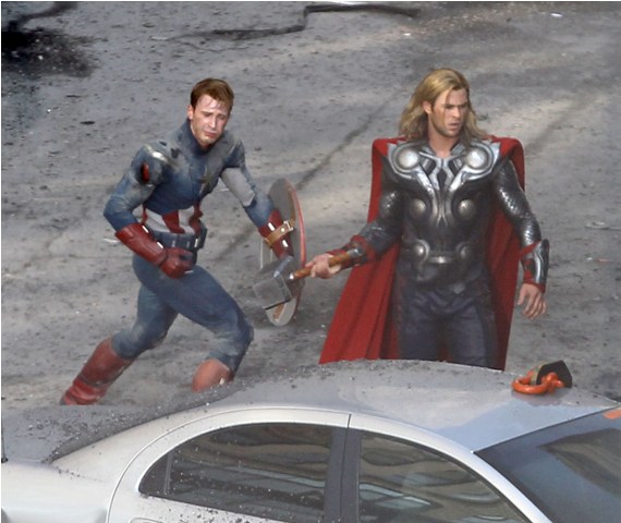 The Avengers is currently shooting in Cleveland. This is supposed to be 42nd Street in New York. And Captain America and Thor are fighting the bad guys. Check out Chris Evans and Chris Hemsworth in their costumes with their hammers and shields. Kinda dorky, right? It’s so dorky when it’s out of context. When you, the viewer, are not locked in a dark theatre and asked to suspend disbelief. When they’re out there in broad daylight fake punching and kicking. When there are no special effects, just two overgrown dudes pretending to be superheroes. Acting must be so f-cking weird.