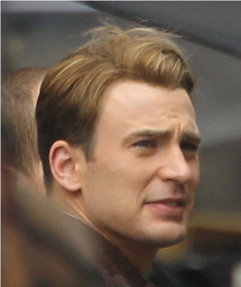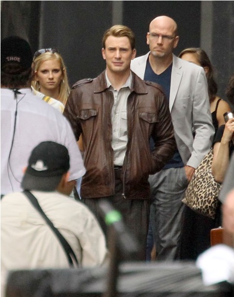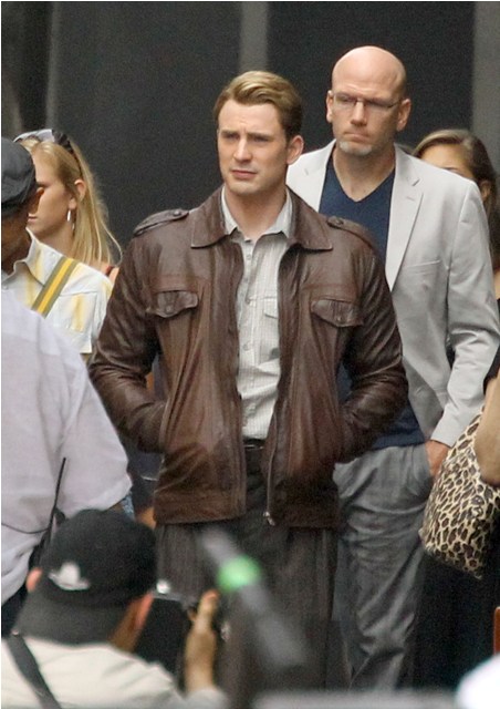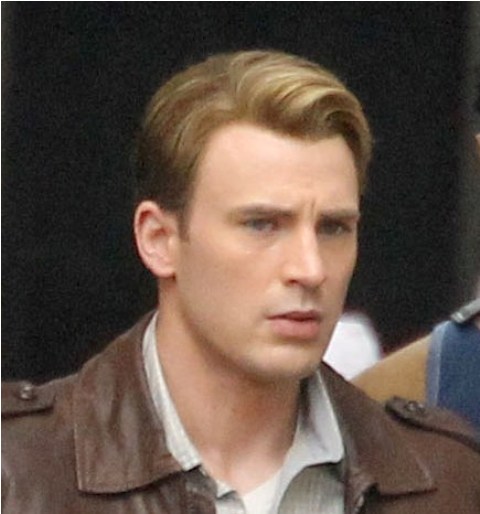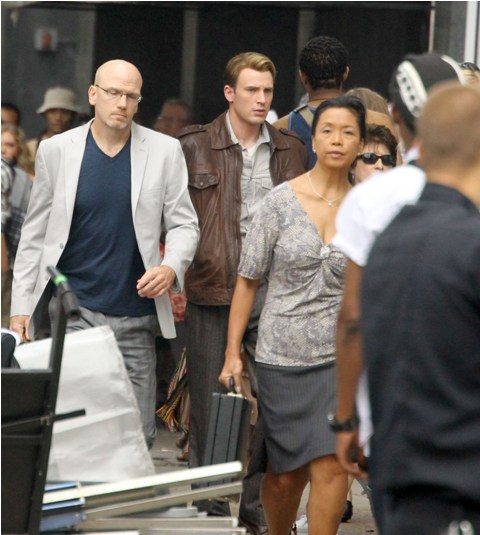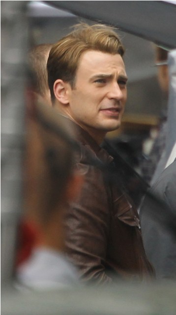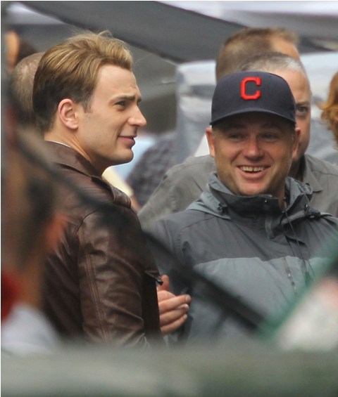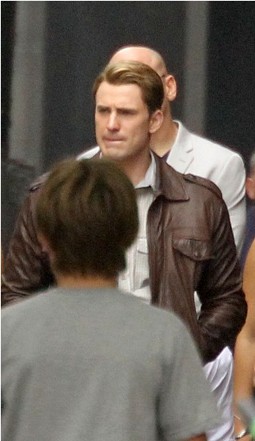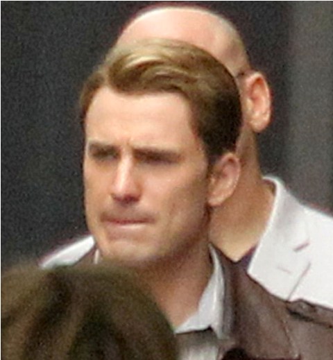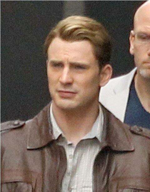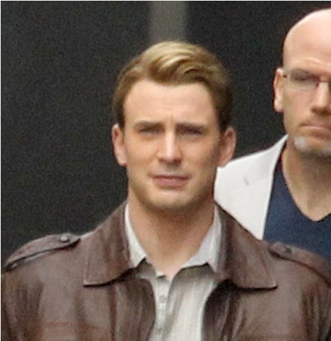 Chris Evans was photographed on location in Cleveland this morning working on The Avengers. This is supposed to be New York. And, I dunno, I haven’t seen the movie but he’s from the 40s and supposedly wakes up in 2011? Whatever. The point is he’s back to work as Captain America which I’m guessing means that he has to maintain that crazy ass fitness regimen required to make him look all ‘roidy and small-headed in character. Exhausting. And for how long???