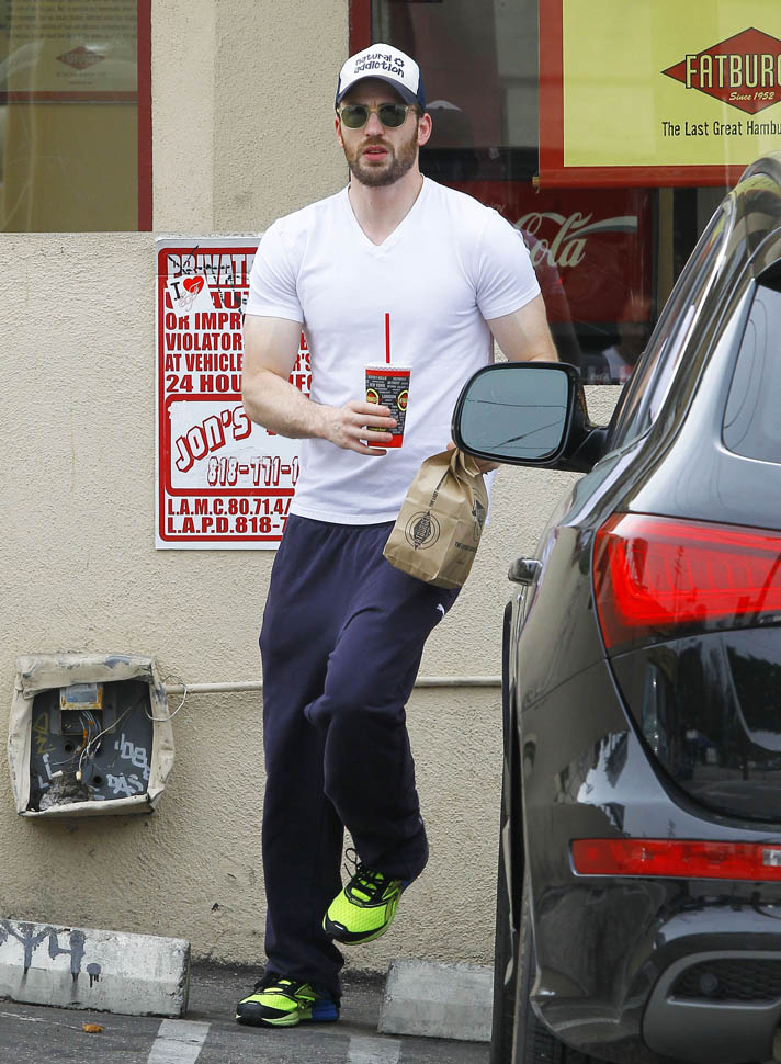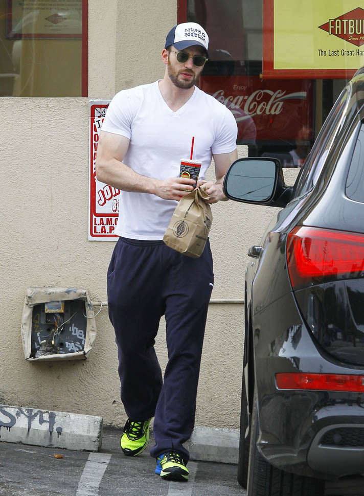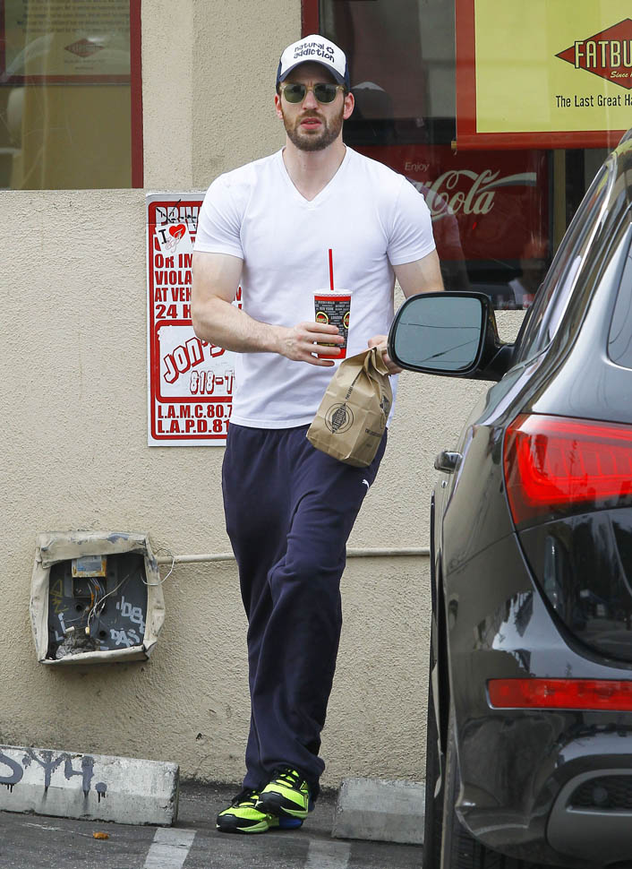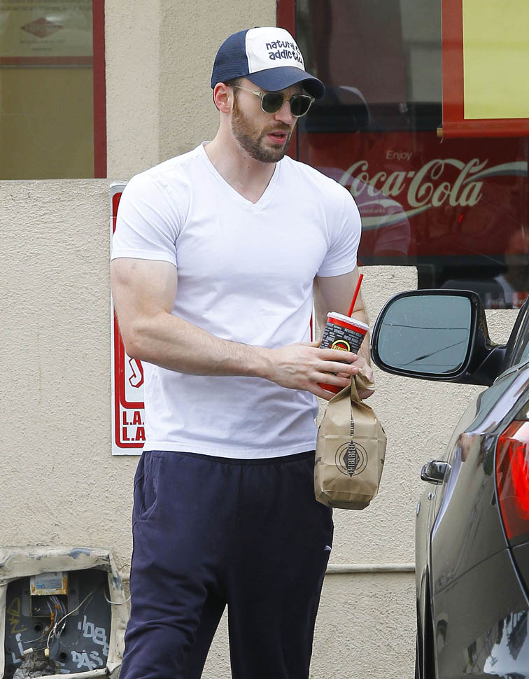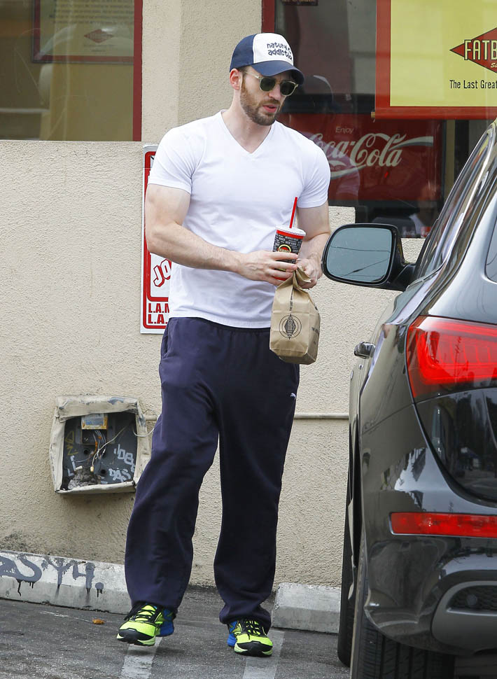Sarah and I went for a switch today. She wrote about my #1 Oscar Isaac. And I'm writing about Chris Evans. She goes on and off on him. But the hope is always there. Which is why she was so pissed when she saw these shots of him leaving Fatburger in sweats. Something about how the top muscles don't match the lean legs. Too much pecs and not enough squats is her complaint.
