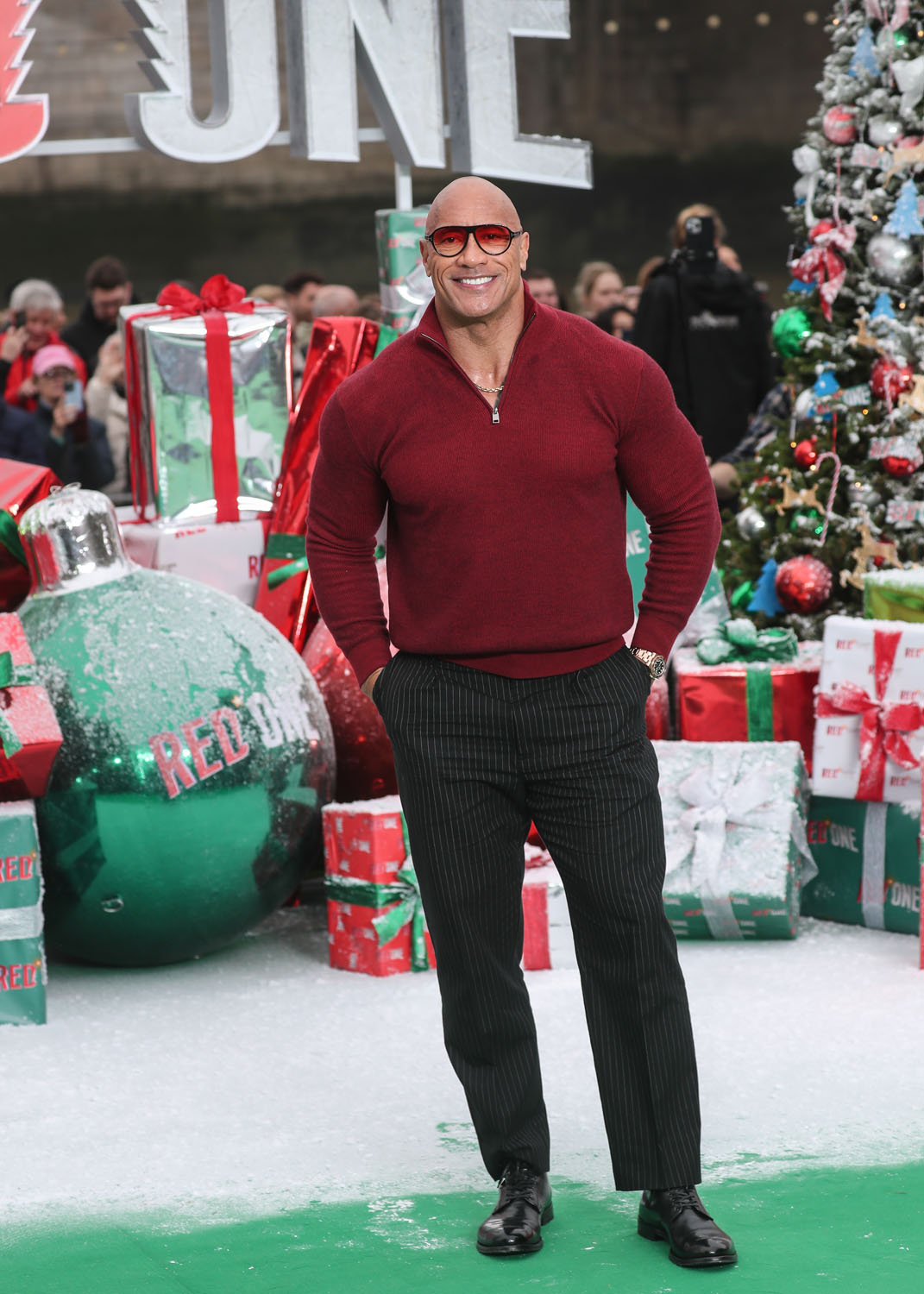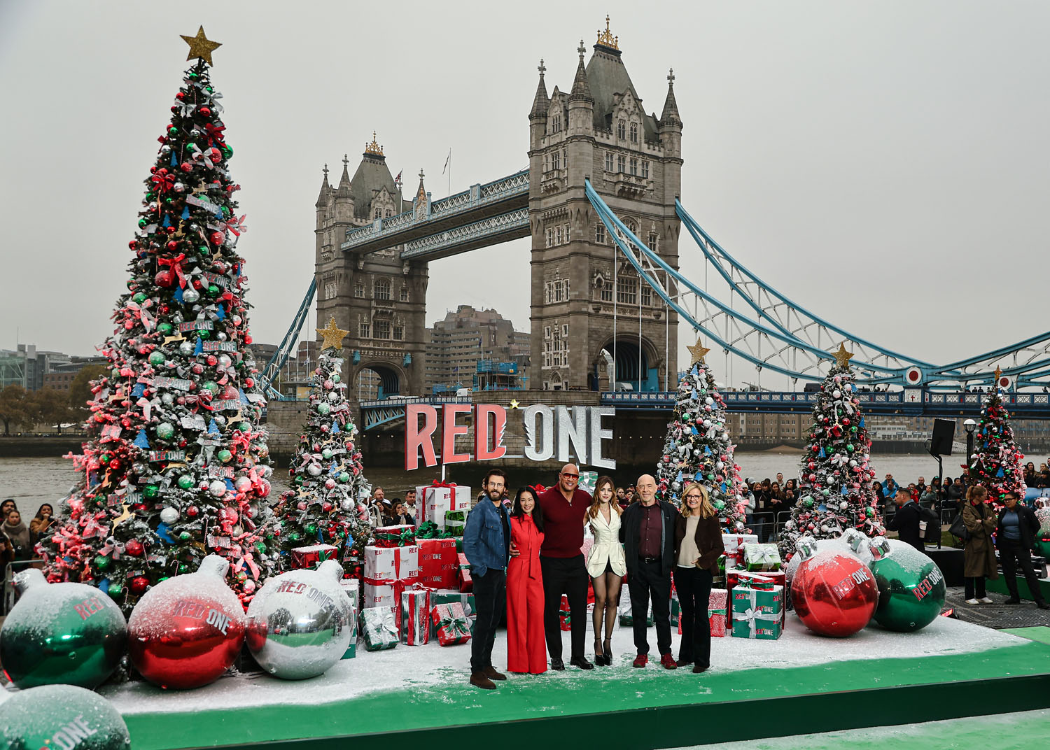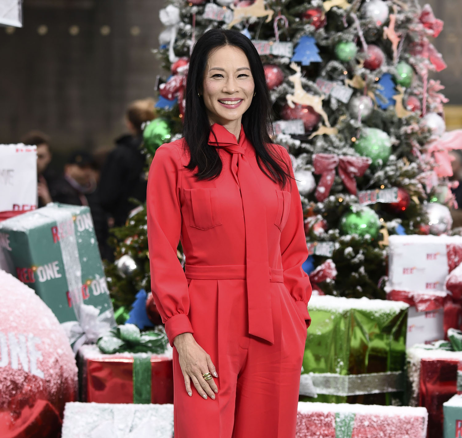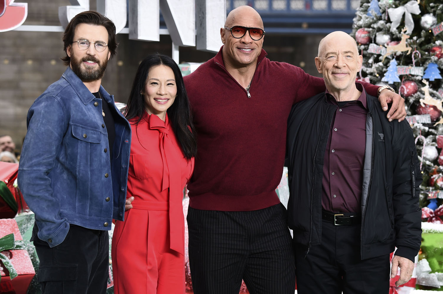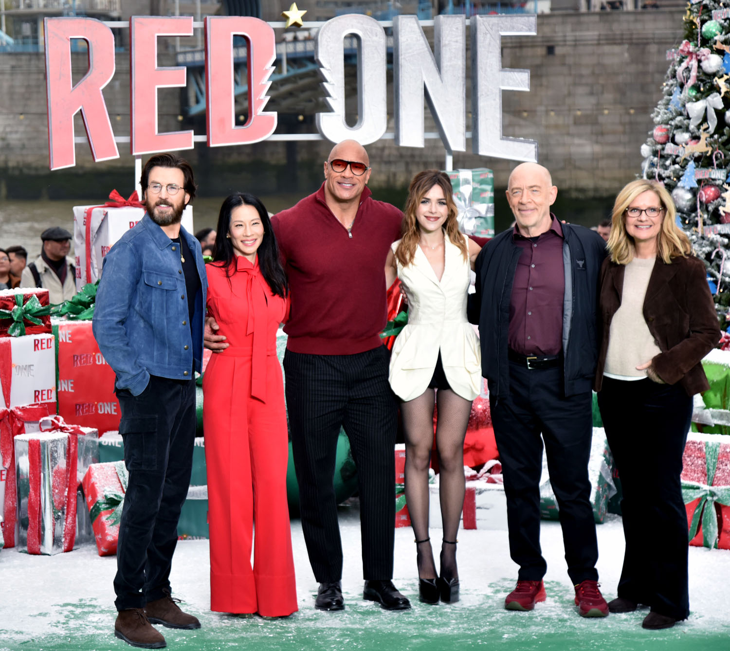 The Red One press tour is happening now, in advance of the film’s November 15 release date. (I’m seeing it next week. hoo raaaaay) The cast turned up in London for a photocall yesterday, including Lucy Liu in a great red pantsuit—jumpsuit? Either way, she looks great. Kiernan Shipka also turned up for this event, which is how I learned Kiernan Shipka is in this movie, ditto for Bonnie Hunt, who I should have remembered is in the trailer, but I’ve been trying my best not to know about this movie. JK Simmons I do remember from the trailer, he’s playing inexplicably buff Santa Claus. And then there’s Dwayne “The Rock” Johnson in a nice sweater, I guess.