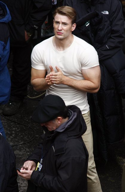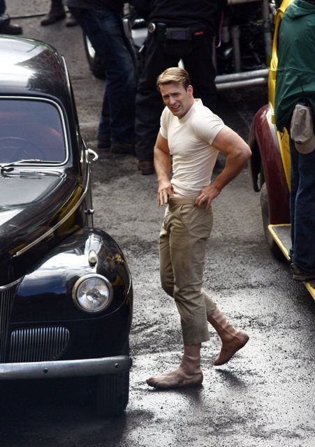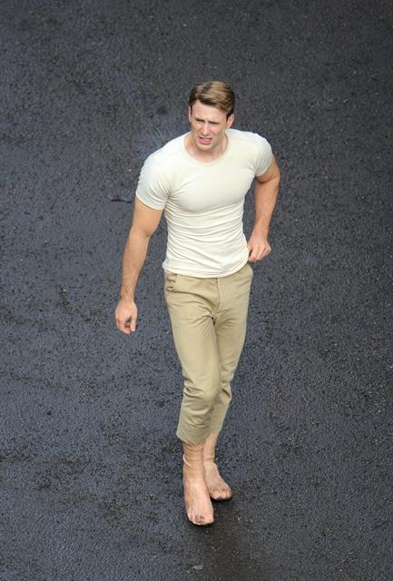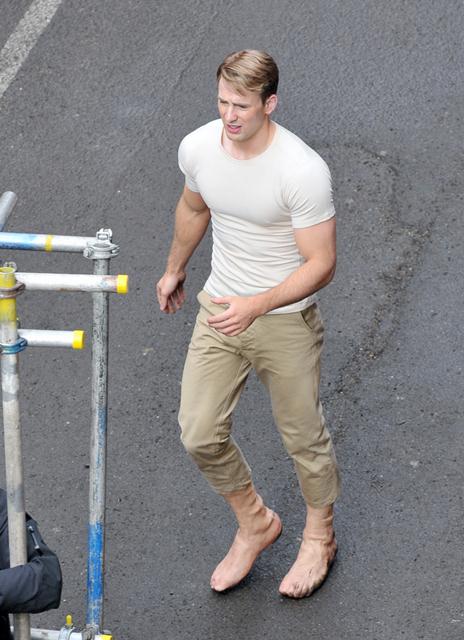 Chris Evans is shooting the movie in Manchester and these are one of the very first shots of him on set of Captain America, wearing a pair of plastic feet, in what appears to be a rescue scene with Hayley Atwell (not pictured).