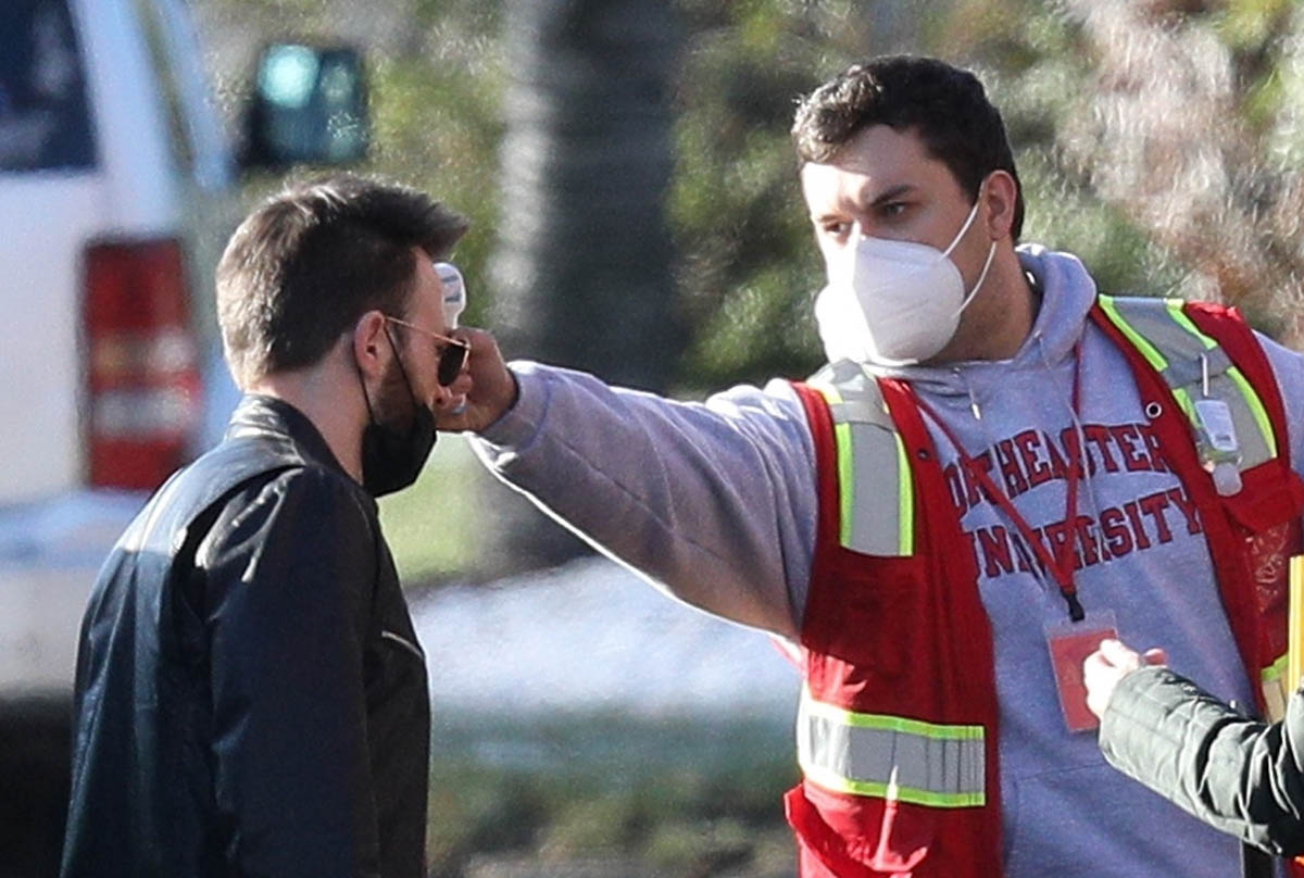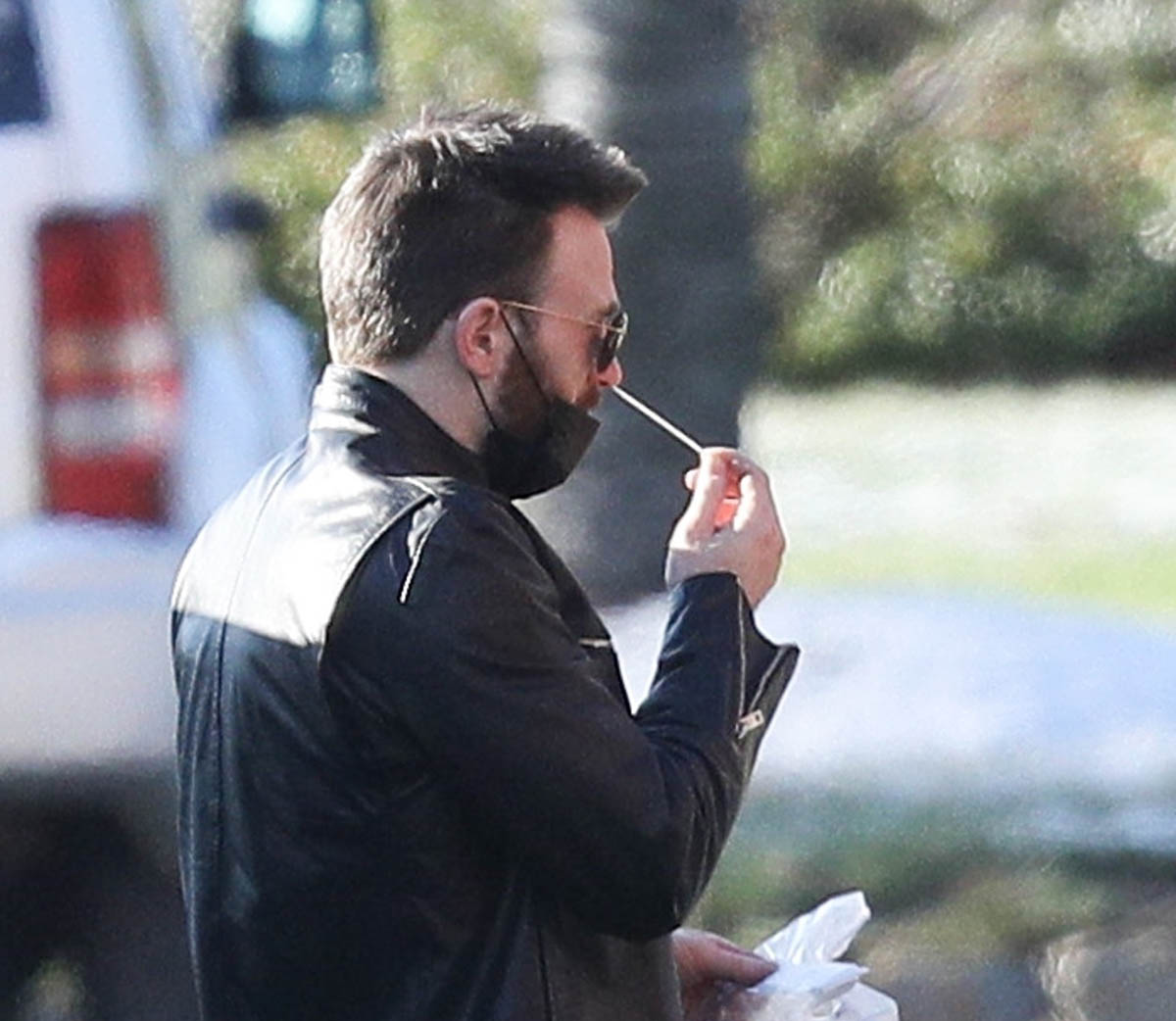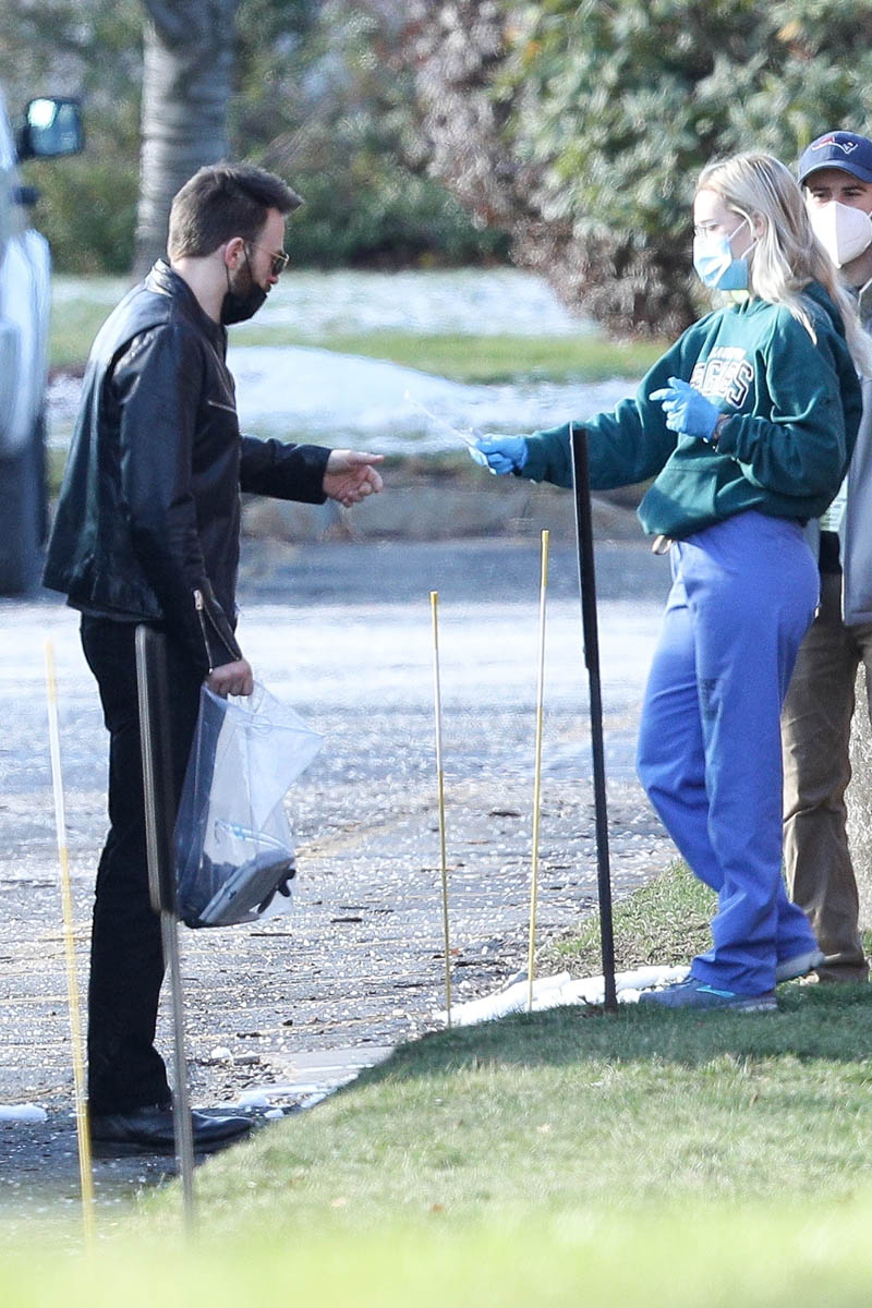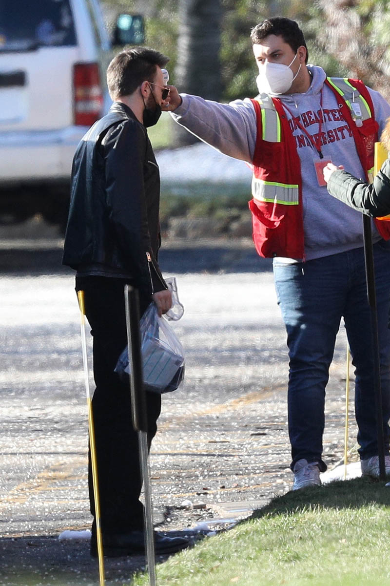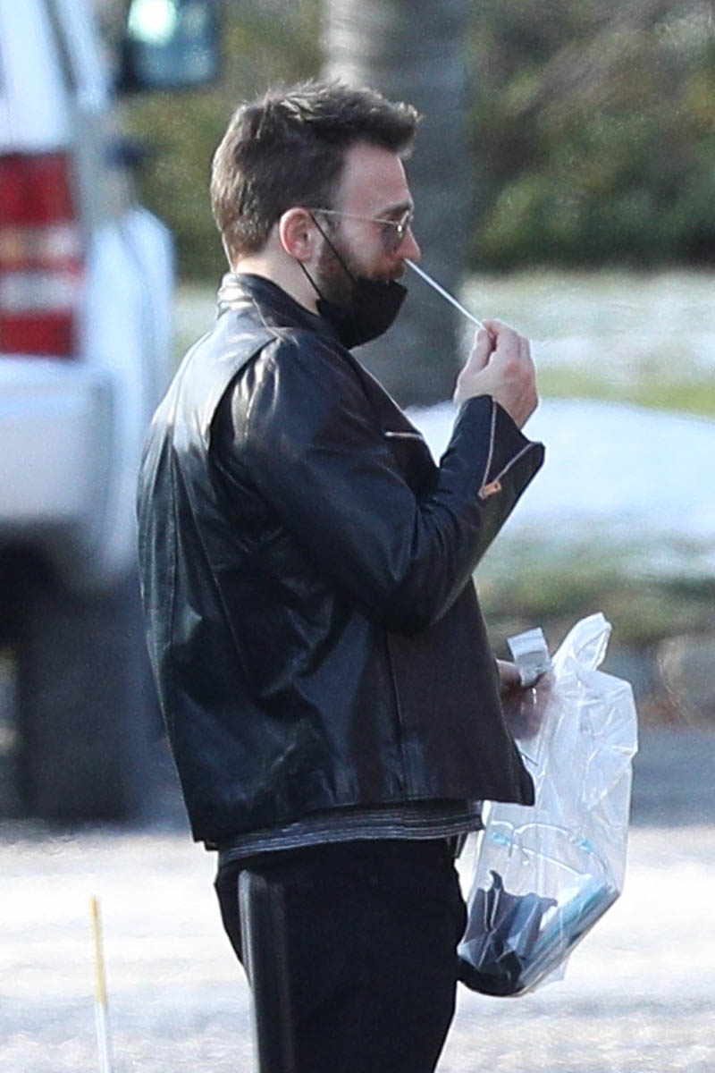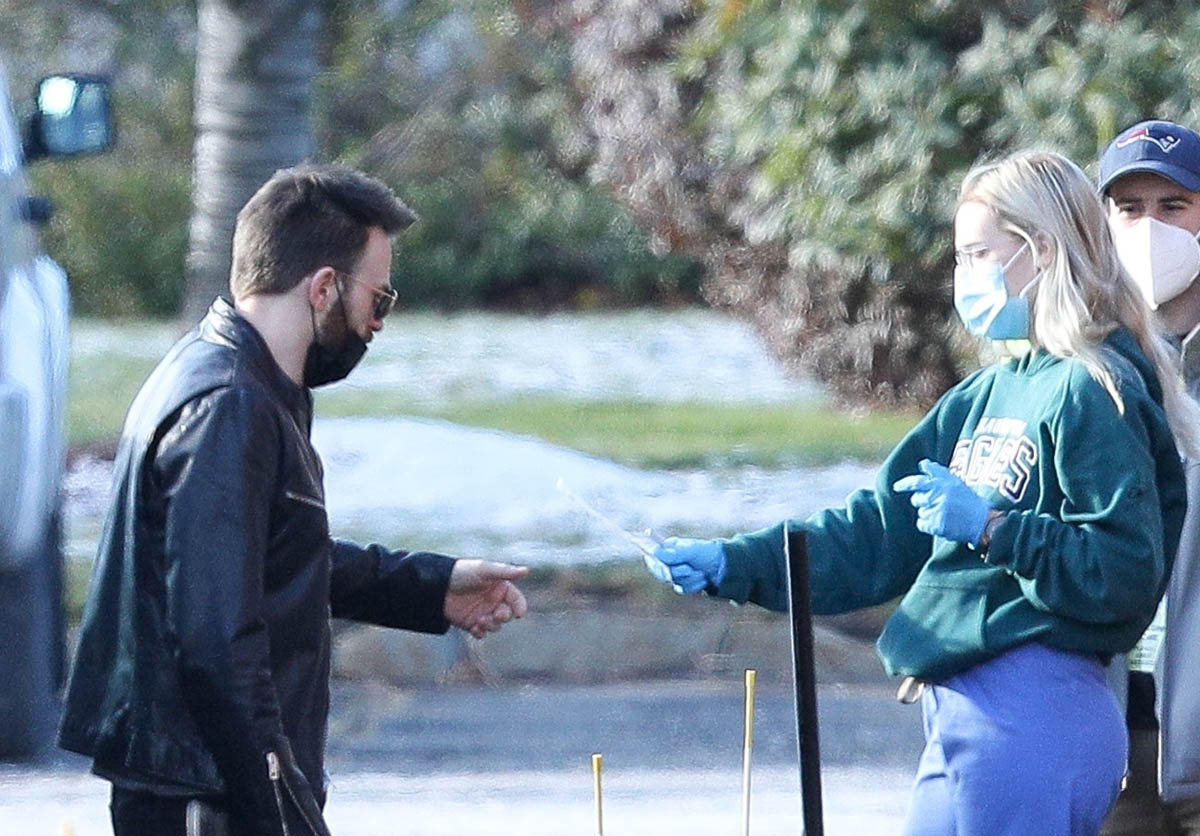 Maybe it was a matter of… proximity? Don’t Look Up is in production in Boston. Chris has been in Boston mostly through the pandemic (with a side trip to London to spend time with Lily James). And he was seen arriving on set today and swabbing himself as part of COVID-19 safety precautions. OK but when you do it yourself, are you really sticking it up far enough to get the sample? I don’t know if you’ve had a COVID test but if you have, at least the kind that we have here in Canada, it feels like the swab is jabbing at your brain and popping one of your memory bubbles. (I imagine our memories like fragile bubbles floating around in our brains, sorry.) The point is… that sh-t goes up real far. And I couldn’t do that to myself but I guess I’ll have to if we can get our hands on some rapid tests!