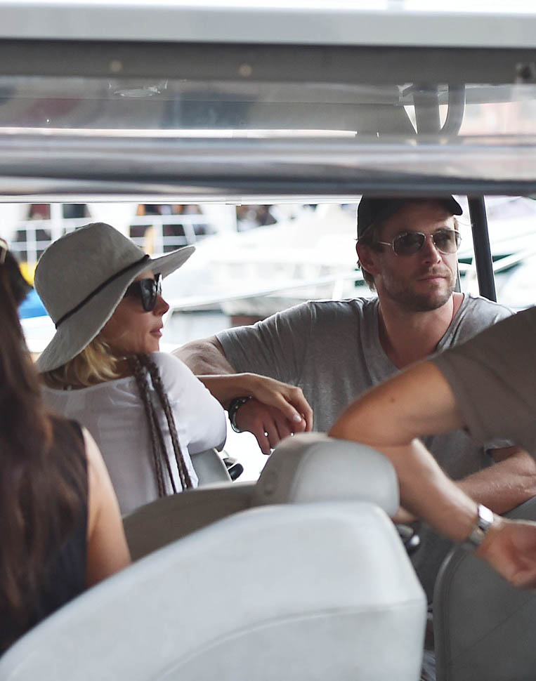 Mimi and Packer were just there too! As Maria pointed out recently, a lot of celebrities are heading to Italy this summer. Chris Hemsworth and Elsa Pataky are the latest. Here they are with friends and family in Portofino yesterday. Chris has been in London shooting The Huntsman. He’s supposed to move on next to the Ghostbusters movie, as the receptionist. Sarah liked his casting decision (click here for a refresher) and so do I. You too I think? Or is it because you’re just picturing him with his shirt off answering the phone?