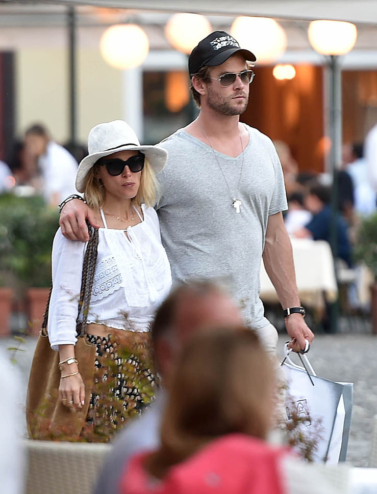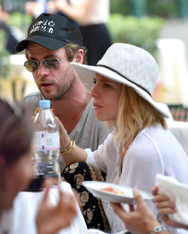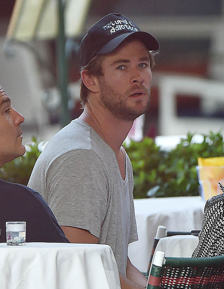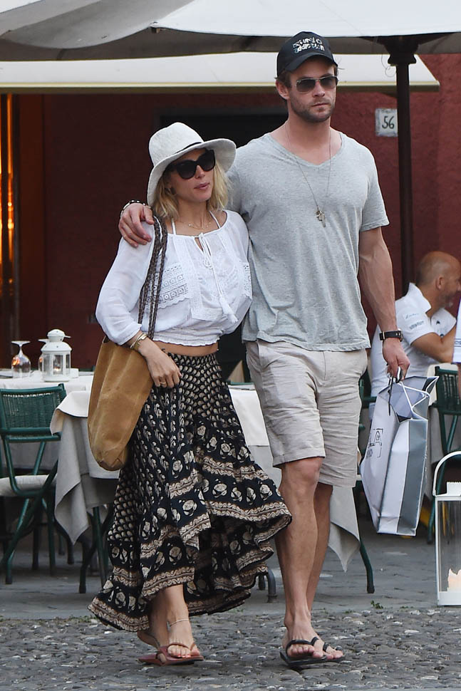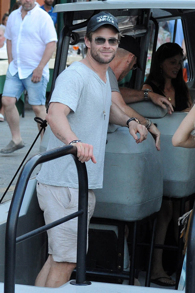 Mimi and Packer were just there too! As Maria pointed out recently, a lot of celebrities are heading to Italy this summer. Chris Hemsworth and Elsa Pataky are the latest. Here they are with friends and family in Portofino yesterday. Chris has been in London shooting The Huntsman. He’s supposed to move on next to the Ghostbusters movie, as the receptionist. Sarah liked his casting decision (click here for a refresher) and so do I. You too I think? Or is it because you’re just picturing him with his shirt off answering the phone?