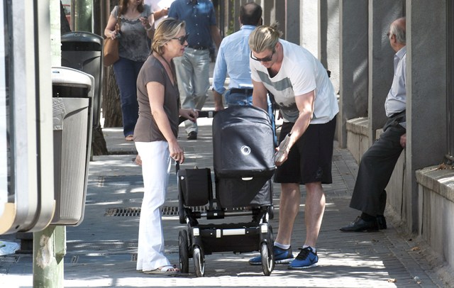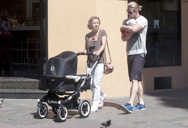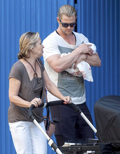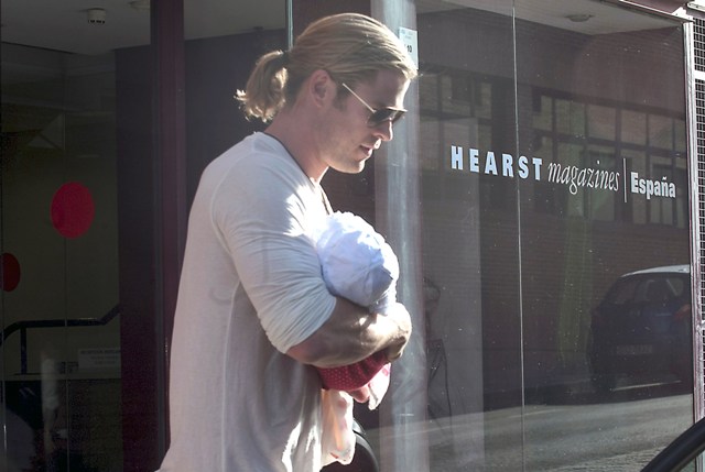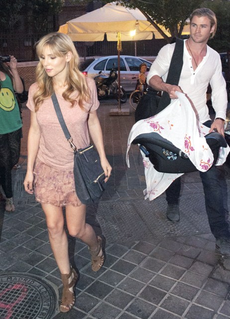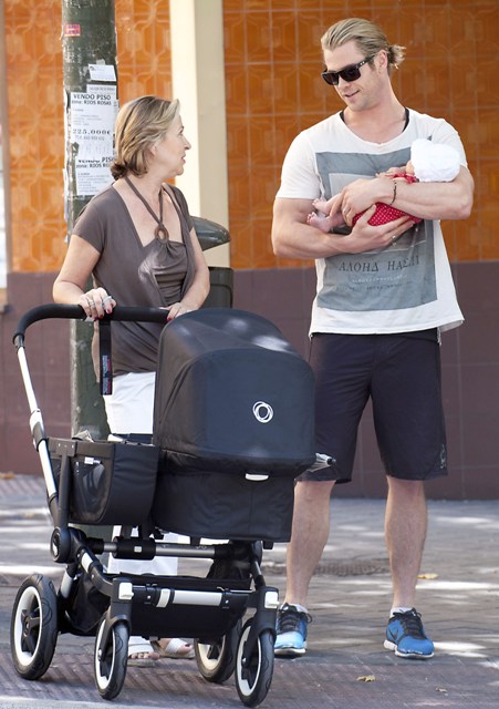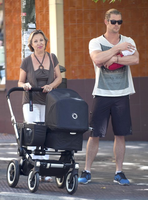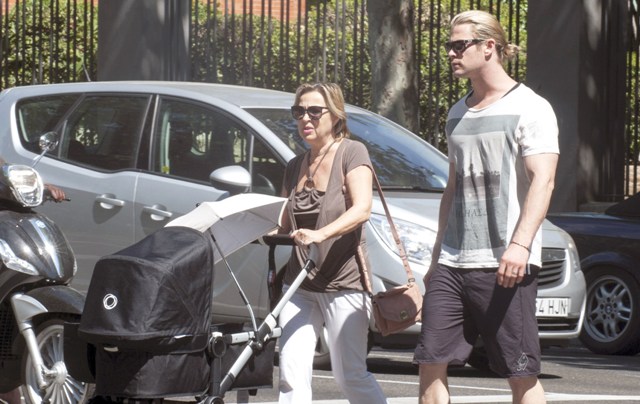 This is Chris Hemsworth with his wife and his mother-in-law holding on to baby India in Madrid yesterday where the Spanish football team arrived following their Euro Cup victory over Italy. It must have been bananas in other parts of the city.