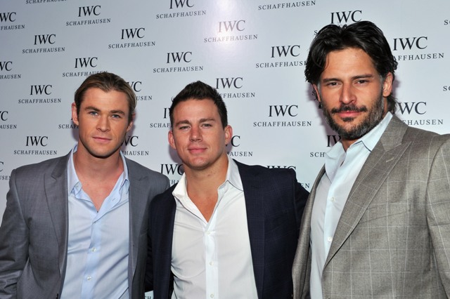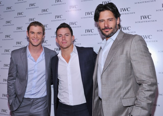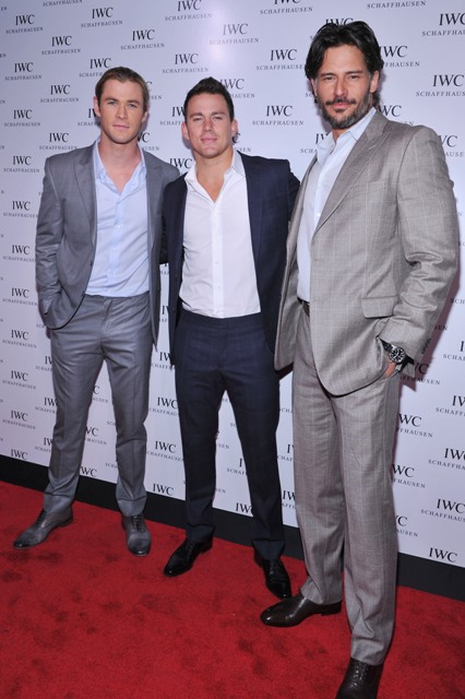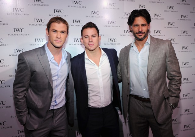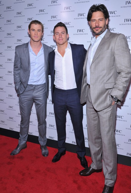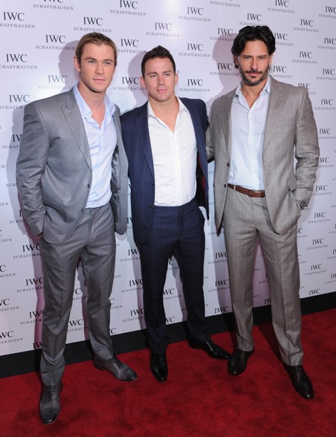 Chris Hemsworth, Channing Tatum, and Joe Manganiello all showed up at an event last night. Hemsworth, as you know, is the god Thor. So he’s a beast. I mean, this is a tall guy. But look at him next to Manganiello! He becomes average-sized. And Channing Tatum, sandwiched between them, who isn’t exactly little, is like the little brother.