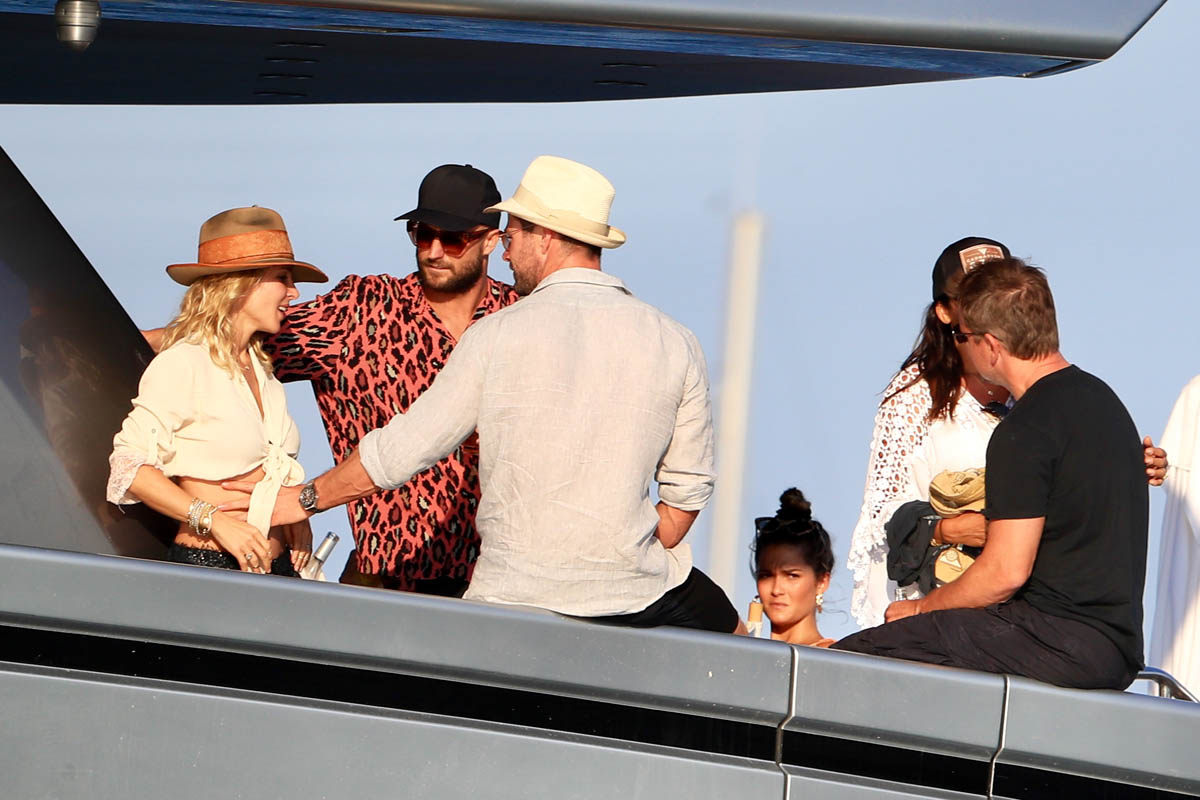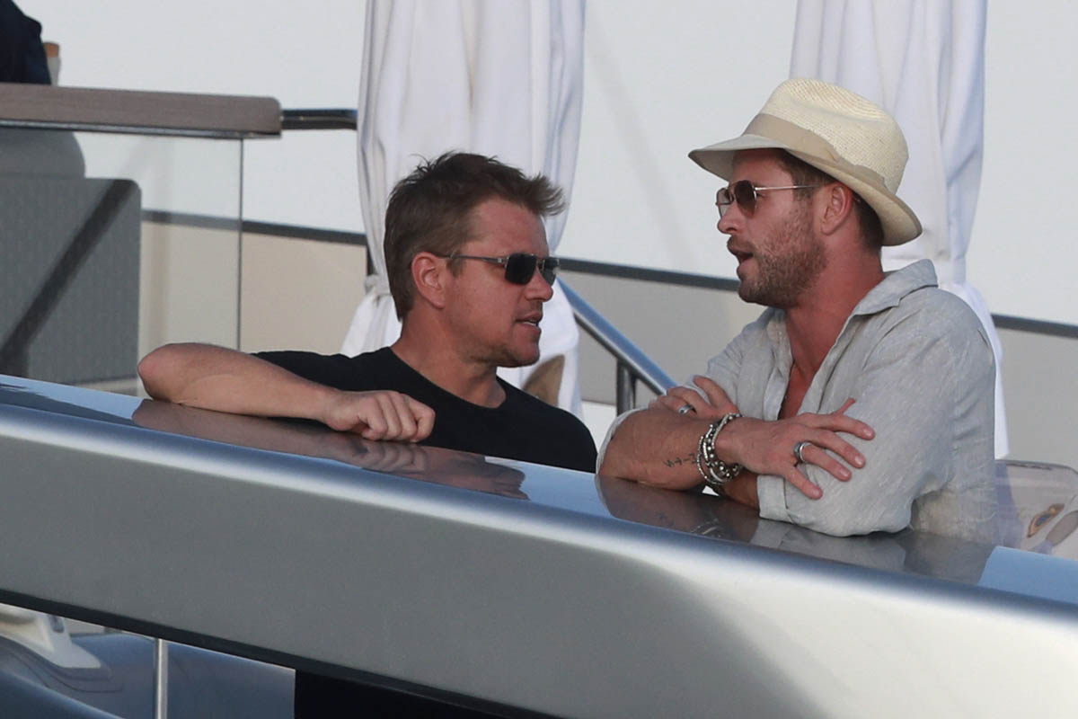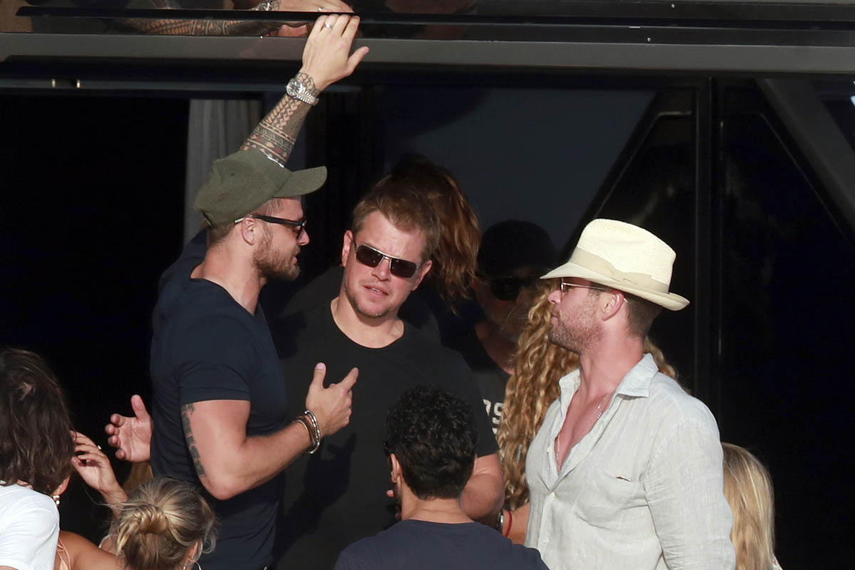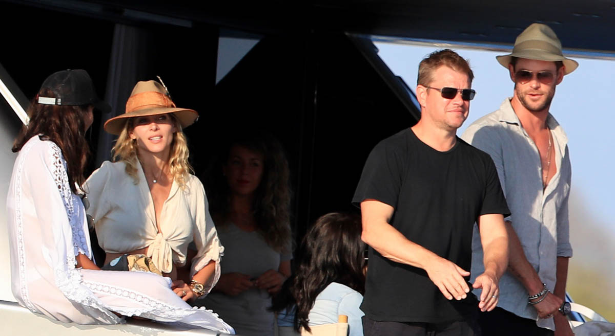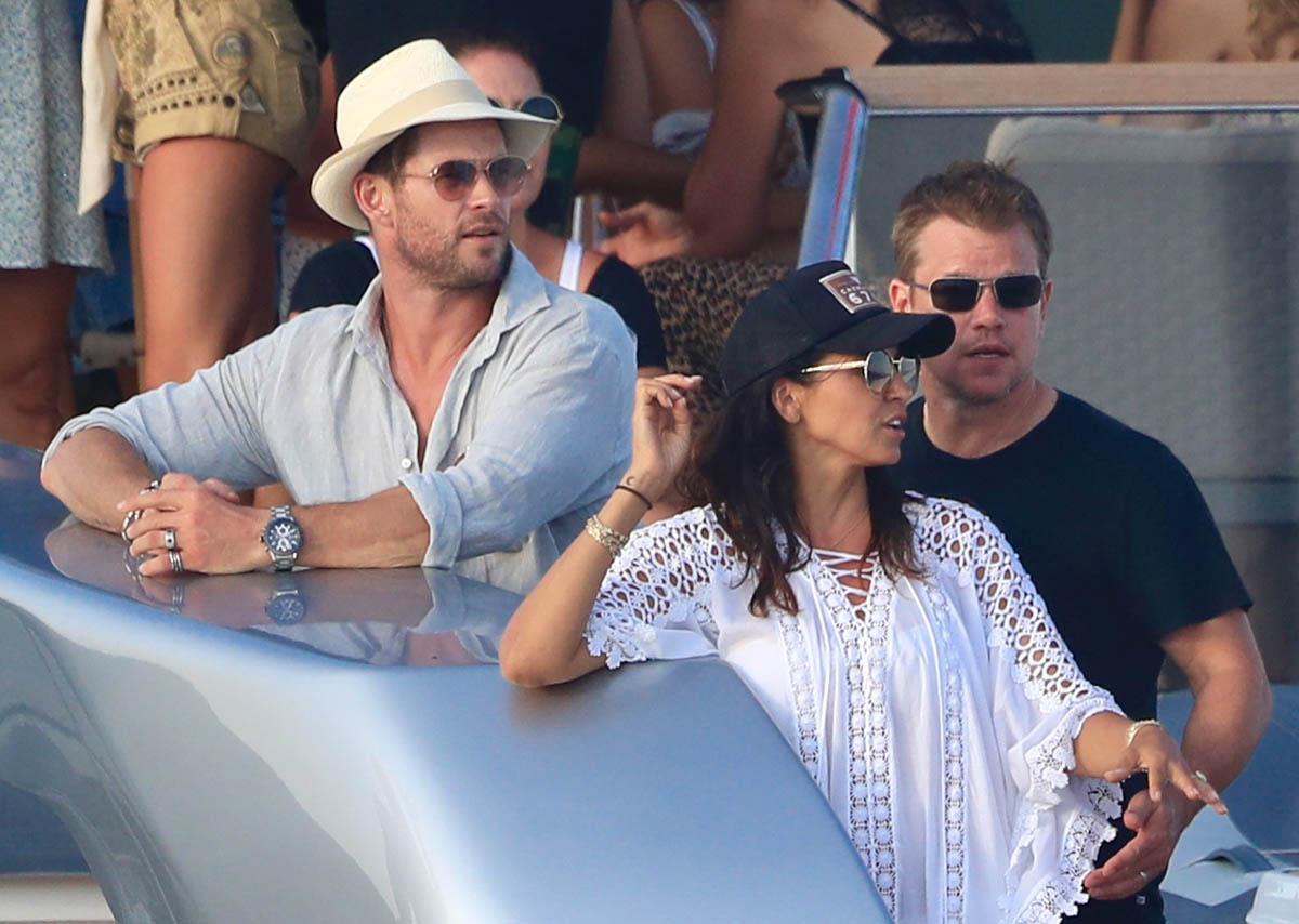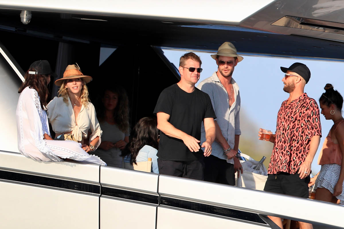 I always wonder about this where celebrities are concerned. Chris and Matt are the most famous in this crowd so you presume they’re also the wealthiest. Or maybe they’re not? Maybe everyone in these shots is super rich? Because to go on holiday with friends, especially with friends who are celebrities, there’s a baseline logistics consensus, right? The Hemsworths and the Damons aren’t staying at 3-star or even 4-star accommodations. So how does this work? Do the celebrities pay for the friends who are on 3-star budgets?